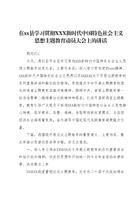 在xx县学习贯彻XXX新时代中国特色社会主义思想主题教育动员大会上的讲话同志们:今天,我们召开全县学习贯彻XXX新时代中国特色社会主义思想主题教育动员大会,主要任务是:深入学习贯彻党的xxx精神、XXX新时代中国特色社会主义思想以及XXXXXX关于开展主题教育的系列重要讲话和指示批示精神,贯彻落实中央开展主题教育的意见和我省主题教育实施方案精神,按照中央、省委主题教育第一批总结暨第二批部署会议的精神和要求,扎实开展好我县主题教育,教育引导广大党员干部用XXX新时代中国特色社会主义思想凝心铸魂、筑牢根本,完整、准确、全面贯彻新发展理念,为实现经济社会高质量发展,奋力谱写中国式现代化新篇章凝聚强大力量。下面,我围绕开展这次主题教育的重要意义、主要内容、重点举措以及落实要求等方面,讲几点意见。一、深入学习领会XXXXXX关于开展主题教育的系列重要讲话和指示批示精神,切实把思想和行动统一到中央和省委的决策部署、决定要求上来XXXXXX高度重视这次主题教育,先后在二十届中央政治局会议等多个重要场合,就开展主题教育发表系列重要讲话并多次作出重要指示批示。4月3日,在学习贯彻XXX新时代中国特色社会主义思想主题教育工作会议上,XXXXXX从战略和全局的高度深刻阐述了开展主题教育的重大意义,明确提出了主题教育的目标要求和重点措施,为全党开展好主题教育提供了根本遵循。9月6日,省委召开主题教育第一批总结暨第二批部署会,xx书记全面总结了第一批主题教育取得的重要阶段性成果,要求以高度的政治责任感和使命感扎实开展第二批主题教育,充分学习借鉴第一批主题教育的成果和经验,切实把握好第二批主题教育的总体要求和着力点,把中央部署不折不扣落实到主题教育全过程,把工作做深做细做实,这为全县开展主题教育指明了路径。全县各级党组织和广大党员干部要提高政治站位,深入学习领会、全面准确把握XXXXXX关于开展主题教育的系列重要讲话和指示批示精神,充分认识到开展这次主题教育的对推动党和国家事业发展、推动自贸港建设、推动三亚高质量发展的重大意义,切实把思想和行动统一到中央和省委部署、要求上来,扎实开展好这次主题教育。二、对标对表,准确把握主题教育的目标任务要求第二批主题教育,总的要求同第一批是一致的。我们要结合自身实际情况,紧紧围绕主题教育的根本任务,聚焦具体目标,对标对表,确保主题教育不虚不偏。(一)准确把握根本任务。这次主题教育的根本任务是坚持学思用贯通、知信行统一,把XXX新时代中国特色社会主义思想转化为坚定理想、锤炼党性和指导实践、推动工作的强大力量,使全党始终保持统一的思想、坚定的意志、协调的行动、强大的战斗力,努力在以学铸魂、以学增智、以学正风、以学促干方面取得实实在在的成效。准确把握这一根本任务,是确保主题教育扎实开展、取得实效的基本前提。围绕这一根本任务,我们要做好学习贯彻XXX新时代中国特色社会主义思想的深化、内化、转化工作,从思想正本清源、固本培元,筑牢信仰之基、补足精神之钙、把稳思想之舵,坚定捍卫两个确立、坚决做到两个维护,始终在思想上政治上行动上同以XXX同志为核心的党中央保持高度一致。我们要从党的科学理论中悟规律、明方向、学方法、增智慧,把看家本领、兴党本领、强国本领学到手,切实担负好党和人民赋予的政治责任,努力把以学增智的实效体现到提升政治能力、思维能力、实践能力上。我们要坚持目标导向和问题导向相结合、学查改相贯通,大兴务实之风,弘扬清廉之风,抓好调查研究,重实干求实效。我们要紧密结合工作职责需要,教育引导广大党员干部落实重实践要求,坚持学思用贯通、知信行统一,真正把学习成果转化为推动高质量发展的实招、硬招、妙招、高招。(二)牢牢把握总要求。这次主题教育的总要求是学思想强党性、重实践、建新功,这12个字是是一个紧密联系、相互贯通、内在统一的整体。学思想,就是要全面学习领会新时代中国特色社会主义思想,全面系统掌握这一思想的基本观点、科学体系,把握好这一思想的世界观、方法论,坚持好、运用好贯穿其中的立场观点方法,不断增进对党的创新理论的政治认同、思想认同、理论认同、情感认同,真正把马克思主义看家本领学到手,自觉用新时代中国特色社会主义思想指导各项工作。强党性就是要自觉用新时代中国特色社会主义思想改造主观世界,深刻领会这一思想关于坚定理想信念、提升思想境界、加强党性锻炼等一系列要求,始终保持共产党人的政治本色。重实践,就是要自觉践行新时代中国特色社会主义思想,用以改造客观世界、推动事业发展,解决经济社会发展和党的建设中存在的各种矛盾问题。建新功,就是要从新时代中国特色社会主义思想中汲取奋发进取的智慧和力量,断提高履职尽责的能力和水平,凝心聚力促发展,驰而不息抓落实,立足岗位作贡献,努力创造经得起历史和人民检验的实绩。(三)紧紧锚定