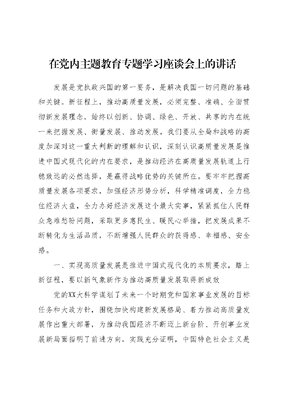 在党内主题教育专题学习座谈会上的讲话发展是党执政兴国的第一要务,是解决我国一切问题的基础和关键。新征程上,推动高质量发展,必须完整、准确、全面贯彻新发展理念,始终以创新、协调、绿色、开放、共享的内在统一来把握发展、衡量发展、推动发展。我们要从全局和战略的高度加深对这一重大判断的理解和认识,深刻认识高质量发展是推进中国式现代化的内在要求,是推动经济在高质量发展轨道上行稳致远的必然选择,是赢得战略优势的关键所在。要牢牢把握高质量发展各项要求,加强经济形势分析,科学精准调度,全力稳住经济大盘,全力办好经济发展这个最大实事,紧紧抓住人民群众急难愁盼问题,采取更多惠民生、暖民心举措,把发展成果不断转化为生活品质,不断增强人民群众的获得感、幸福感、安全感。一、实现高质量发展是推进中国式现代化的本质要求,踏上新征程,要以新气象新作为推动高质量发展取得新成效党的XX大科学谋划了未来一个时期党和国家事业发展的目标任务和大政方针,围绕加快构建新发展格局、着力推动高质量发展作出重大部署,为推动我国经济不断迈上新台阶、开创事业发展新局面指明了前进方向。实践充分证明,中国特色社会主义是党和人民历经千辛万苦、付出巨大代价取得的根本成就,是创造人民美好生活、实现中华民族伟大复兴的康庄大道。这条道路符合中国实际、反映中国人民意愿、适应时代发展要求,不仅走得对、走得通,而且走得稳、走得好。我们要深入学习贯彻XXXXXXXX主义思想和党的XX大精神,以新气象新作为推动高质量发展取得新成效。(一)四个必须的要求为新征程上牢牢把握高质量发展这个首要任务提供了前进方向、科学指南和根本遵循。发展理念是战略性、纲领性、引领性的东西,是发展思路、发展方向、发展着力点的集中体现。发展理念是否对头,从根本上决定着发展成效乃至成败。创新、协调、绿色、开放、共享的新发展理念是十八大以来提出的理论成果中最重要的。新发展理念系统回答了关于发展的目的、动力、方式、路径等一系列理论和实践问题,阐明了我们党关于发展的政治立场、价值导向、发展模式、发展道路等重大政治问题。我国社会主要矛盾已经转化为人民日益增长的美好生活需要和不平衡不充分的发展之间的矛盾,发展中的矛盾和问题集中体现在发展质量上。这就要求我们必须把发展质量问题摆在更为突出的位置,着力提升发展质量和效益,推动高质量发展。制度是关系党和国家事业的根本性、全局性、稳定性长期性问题,体制机制是制度的具体表现和实施形式。要实现可持续的高质量发展,离不开制度这个根基,离不开体制机制的保障和促进。要深入推进国家治理体系和治理能力现代化,切实把党领导经济工作的制度优势转化为治理效能。推动高质量发展,必须始终坚持以人民为中心的发展思想,主动践行全心全意为人民服务的根本宗旨,实现好、维护好、发展好最广大人民的根本利益,提高人民生活品质。(二)发展是党执政兴国的第一要务,是解决我国一切问题的基础和关键。坚持创新发展、协调发展、绿色发展、开放发展共享发展是关系我国发展全局的一场深刻变革,必须坚持系统观念,加强前瞻性思考、全局性谋划、战略性布局、整体性推进。推动高质量发展,必须更好统筹质的有效提升和量的合理增长,做好质量统一的大文章。始终坚持质量第一、效益优先大力增强质量意识,视质量为生命,以高质量为追求,实现有效益、有质量、可持续的发展,为经济社会持续健康发展夯实基础要按照构建高水平社会主义市场经济体制、推进高水平对外开放的要求,深入推进重点领域改革,统筹推进现代化基础设施体系和高标准市场体系建设,稳步扩大制度型开放,通过深化改革创新增添动力、激发活力,形成共同推动高质量发展的强大合力。(三)以新气象新作为推动高质量发展取得新成效。要加快实现高水平科技自立自强,加快实施创新驱动发展战略,强化重大科技创新平台建设,集聚力量进行原创性引领性科技攻关,打赢关键核心技术攻坚战。要把实施扩大内需战略同深化供给侧结构性改革有机结合起来,增强国内大循环内生动力和可靠性,提升国际循环质量和水平,加快建设现代化产业体系。坚持把发展经济的着力点放在实体经济上,推进新型工业化,加快建设制造强国、质量强国、航天强国、交通强国、网络强国、数字中国。加快推进农业现代化,全面推进乡村振兴,巩固拓展脱贫攻坚成果同乡村振兴有效衔接,全方位夯实粮食安全根基,确保中国人的饭碗牢牢端在自己手中。聚焦人民幸福安康这个最终目的,紧紧抓住人民群众急难愁盼问题,健全基本公共服务体系,不断推动幼有所育、学有所教、劳有所得、病有所医、老有所养、住有所居、弱有所扶取得新进展。二、高水平对外开放是破解发展问题的重要动力,坚持创新发展,以开放促改革促发展促创新,推动高质量发展改革开放是决定当代中国前途命运的关键一招。全面建成社会主义现代化强国、实现第二个百年奋斗目标,以中国式现代化全面推进中华民族伟