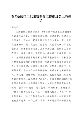 在X系统第二批主题教育工作推进会上的讲话同志们:主题教育全面启动以来,X党委坚持把开展主题教育作为首要政治任务,持续在以学铸魂、以学增智、以学正风以学促干上下功夫,把强化理论学习作为重中之重,发挥党委理论中心组、党支部、党小组、党员个人联动学习机制作用,扎实举办读书班、开展专题研讨、抓好个人自学在深化、内化、转化上聚力用劲,推动学习走深走实。同时,把高质量抓好主题教育与高标准服务中心工作相结合与加强基层党组织建设相结合,与激励干部担当作为相结合,坚持边学习、边对照、边检视、边整改,解决了一些实际问题,也出台了一些具体措施,实现教育与实践两手抓、两促进。慎终如始,则无败事。我们要充分认识主题教育的重要性,深扎理论沃土,坚持不懈用XXX新时代中国特色社会主义思想凝心聚魂,加强党的创新理论转化运用,坚持学以致用、用以促学,学用相长,不断增强敢干的责任担当、实干的作风状态、快干的工作效率、会干的能力本领,在知行合一中推动主题教育走深走实、取得实效。下面,就开展好下一阶段主题教育,我强调几点意见。一、抓好理论武装,在以学铸魂中筑牢根本XXXXXX指出,以学铸魂,就是要做好学习贯彻新时代中国特色社会主义思想的深化、内化、转化工作,从思想上正本清源、固本培元,筑牢信仰之基、补足精神之钙把稳思想之舵,强调要坚定理想信念铸牢对党忠诚站稳人民立场。这为我们在主题教育中自觉用XXX新时代中国特色社会主义思想改造主观世界、在以学铸魂上下功夫见实效提供了根本遵循。具体来说,有以下三个方面:一是要筑牢理想信念这个根本政治灵魂。理想信念是中国共产党人的政治灵魂,是共产党人经受任何考验的精神支柱。只有铸牢理想信念之魂,才能经受住各种考验,把好世界观、人生观、价值观这个总开关。理想信念的坚定,来自思想理论的坚定。就要全面学习领会XXX新时代中国特色社会主义思想,全面系统掌握这一思想的基本观点、科学体系,把理想信念建立在对党的创新理论的政治认同、思想认同、理论认同、情感认同上,让真理武装我们的头脑,让真理指引我们的理想,让真理坚定我们的信仰;就要教育引导广大党员干部自觉用XXX新时代中国特色社会主义思想改造主观世界,坚定对马克思主义的信仰对中国特色社会主义的信念、对实现中华民族伟大复兴中国梦的信心;就要坚持学而信、学而思、学而行,把学习成果深化为不可撼动的理想信念,增强对党的价值追求和前进方向的高度政治认同,用理想之光照亮奋斗之路,用信仰之力开创美好未来。二是要筑牢对党忠诚这个根本政治规矩。理想信念坚定和对党忠诚是紧密联系的。XXXXXX指出:对党忠诚,是共产党人首要的政治品质。对党忠诚是党章对每个党员的基本要求。政治上的坚定源自理论上的清醒,就要深入学习领会XXX新时代中国特色社会主义思想,把学习成果内化为对党的无限忠诚,把对党忠诚建筑在追求真理、揭示真理、笃行真理之上;就要教育引导广大党员干部锤炼政治品格,以党的旗帜为旗帜、以党的意志为意志、以党的使命为使命,始终忠诚于党、忠诚于人民、忠诚于马克思主义,真心爱党、时刻忧党、坚定护党、全力兴党;就要自觉坚持党的全面领导,维护党中央权威和集中统一领导,不断提高政治判断力、政治领悟力、政治执行力,始终在政治立场、政治方向、政治原则、政治道路上同党中央保持高度一致,把对党忠诚体现到贯彻落实好党中央决策部署的实际行动上。三是筑牢人民立场这个根本政治立场。人民是我们党执政的最深厚基础和最大底气,我们党始终代表中国最广大人民的根本利益,从来不代表任何利益集团、任何权势团体、任何特权阶层的利益,党的历史就是我们党与人民心心相印、与人民同甘共苦、与人民团结奋斗的历史。就要深刻体会人民二字在这一思想中的根本性意义,把学习成果转化为坚持人民至上的为民情怀;就要践行全心全意为人民服务的根本宗旨,始终保持同人民群众的血肉联系,始终接受人民批评和监督,始终同人民同呼吸、共命运、心连心;就要坚守初心使命,践行党的群众路线,问计于民、问需于民,把人民群众满意不满意作为评判主题教育成效的根本标准,解决好人民群众最关心最直接最现实的利益问题,把惠民生的事办实、暖民心的事办细、顺民意的事办好,让现代化建设成果更多更公平惠及全体人民。二、抓好苦练本领,在以学增智中勇担当XXXXXX深刻指出:开展这次主题教育,根本任务是坚持学思用贯通知信行统一,把新时代中国特色社会主义思想转化为坚定理想、锤炼党性和指导实践、推动工作的强大力量,使全党始终保持统一的思想、坚定的意志、协调的行动、强大的战斗力,努力在以学铸魂、以学增智、以学正风、以学促干方面取得实实在在的成效。开展好主题教育,一个重要的方面就是以学增智,理论武装强本领。一是要强化政治本领。理论修养是领导干部综合素质的核心,理论上的成熟是政治上成熟的基础