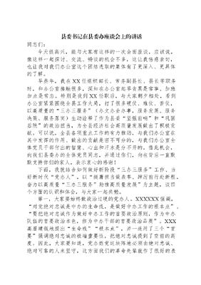 县委书记在县委办座谈会上的讲话同志们:今天很高兴,能与大家有这样的一次会面座谈,应该说,像这样一起探讨、交流、畅谈的机会不多,这让我倍感亲切,也让我对我们办公室这个团结进取的集体有了更深入、更具体的了解。早些年,我在XX任组织部长、常务副县长、县长等职务时,和办公室接触很多,深知在办公室起早贪黑是常事、加班加点是常态。特别是我到XX任职后,与大家朝夕相处,看到办公室紧紧围绕全县工作大局,打了很多硬仗、难仗、苦仗,以高质量的三办三服务(办文办会办事,服务发展、服务决策、服务落实)生动诠释了作为县委坚强前哨和巩固后院的政治担当,为全县经济社会高质量发展做出了积极贡献。可以说,全县各项重点工作的有力推动,与我们办公室在其中发挥的作用、做出的贡献是密不可分的,与我们办公室全体党员干部付出的智慧、心血和汗水是分不开的。借此机会,向我们县委办的全体党员同志,并通过你们,向在背后一直默默支持你们的家人,表示衷心的感谢!下面,我就结合如何做好新阶段三办三服务工作、当好新时代党办人,以挺膺担当做表率、踔厉前行赴新程,奋力以高质量三办三服务助推高质量发展为主题,谈四个方面的认识和体会,与大家一起共勉。第一,大家要始终做政治过硬的党办人。XXXXXX强调,对党绝对忠诚是中办的生命线,是做好中办工作的根本点、要把绝对忠诚作为做好中办工作的首要政治原则,作为中办队伍的首要政治本色,作为中办干部的首要政治品质。XXX高屋建瓴地提出生命线根本点,并一连用了三个首要强调绝对忠诚的极端重要性,把绝对忠诚提到了空前的高度。因此,大家要知道,党办姓党这块阵地必须由绝对忠诚、绝对可靠的人来坚守,这方面我们的革命先辈就作了很好的表率和示范。比如,受尽苦刑宁死不泄露党的秘密的张宝泉;又如,一身正气、两袖清风的红色管家熊瑾玎等等,他们都是我党秘书工作者中绝对忠诚的光辉典范。所以,大家要对标先辈、对标中办,必须旗帜鲜明讲政治,始终在政治上过得硬、靠得住。一要在对党绝对忠诚上作表率。办公室同志在领导身边服务,承办着很多核心和重要的工作任务,如果不忠诚或不够忠诚,立场就会偏、站位就不稳,就难以经受住各种考验。所以,大家要坚持把对党绝对忠诚作为首要政治原则,始终保持政治上的清醒与坚定,坚决贯彻党的路线、方针、政策,坚决同以XXX同志为核心的党中央保持高度一致。同时,要善于从政治上把握大局、看待问题、推动工作,不断增强政治判断力、政治领悟力、政治执行力,切实做到在大是大非面前、政治原则问题上头脑清醒、旗帜鲜明、立场坚定。二要在确保政令畅通上作表率。纵观百年党史,我们党之所以能历经艰难困苦而不断发展壮大并创造辉煌伟业,关键在于各级党组织和广大党员能不折不扣地执行党的决定。所以,大家要坚持把忠诚转化为履职尽责的实际行动,体现在一言一行、一文一事中,落实到三办三服务的方方面面,特别是对中央、省委、州委和县委的重大决策部署和工作要求,要带头执行、带头贯彻,真正做到对党的事业忠诚、对履行的政治使命忠诚、对自身的岗位职责忠诚。三要在严守纪律规矩上作表率。日常工作中,大家经常会接触到很多核心信息,包括中央和省州的重要文件、县里的重大决策、重要会议活动、领导同志的行程安排等,如果不严守纪律和规矩,是很容易出问题、出纰漏的。所以,大家无论何时何地何事,都要严守党的政治纪律、组织纪律、廉洁纪律、群众纪律、工作纪律和生活纪律,做让组织安心、领导放心的党办人。需要特别强调的是:目前办公室在办文办会、文稿起草、值班值守、督促检查、机要保密等方面建立了系列的规章制度,但在执行方面,还有一些不规范、不到位的地方。我们办公室要带头学习制度、严格执行制度、自文可居文库——海量学习资料,手机电脑均可下载www.wenkeju.com觉维护制度,切实把制度要求转化为规范到位的自觉行动,真正做到用制度管人、管事、保运转。第二,大家要始终做能力过硬的党办人。XXXXXX强调:办公厅(室)同志要克服本领恐慌,提升干事本领,强化担当作为。其实,不论哪个领域、哪个行业,但凡只要想干事,大多都是能干事、干成事的。在现实中,就不乏这样的先进典型。比如,保安大叔许一飞,从小学习书法,虽因贫寒辍学却从未放弃,写废了2000多支毛笔,终获兰亭奖;又如,外卖小哥雷海为,在忙碌的工作中坚持背诵古诗词,一举拿下了《中国诗词大会》的总冠军;再如,侏儒症患者沈明辉,一心一意苦练画技,成为了小有名气的画家等等。他们虽然很平凡,但却都因苦练本领而突破自我、成就了自我。而我们县委办作为县委的前哨后院,大家作为全县优中选优的党员干部,理应成为提笔能写、开口能讲、问策能对、遇事能办的多面手。一要提笔能写。在县委办工作,搞文字材料是敲门锤,是必须具备的一项技