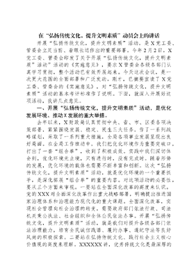 在弘扬传统文化,提升文明素质动员会上的讲话开展弘扬传统文化,提升文明素质活动,是X党工委、管委会立足当前、着眼长远作出的重要部署。今年2月2日,X党工委、管委会印发了关于开展弘扬传统文化,提升文明素质活动活动的《实施意见》,要求X管委会各级各部门认真学习贯彻,整个活动已有效开展起来。今天这次会议,是一次更大范围的全面部署和广泛发动。刚才,已摘要宣读了X党工委、管委会的《实施意见》,对弘扬传统文化,提升文明素质活动的基本考评标准作了说明。下面,就深入开展好这项活动,我讲几点意见。一、开展弘扬传统文化,提升文明素质活动,是优化发展环境、推动X发展的重大举措。去年以来,X财政局认真贯彻中央、省、市、区委各项决策部署,紧紧围绕发展、稳定、民生三大任务,作了一系列战略谋划,采取了一系列重大措施,全局各项事业发展呈现出良好局面。在全局工作推动中,我们把优化环境作为重要突破口,打出了一套组合拳,收到了积极成效。实践中我们深切体会到,优化环境无止境,只有进行时,没有完成时。随着形势的发展,优化环境的载体也需要不断丰富和创新。这次弘扬传统文化,提升文明素质活动,就是优化环境的一个重要抓手,是深化拓展组合拳的重要内容。对这项活动的必要性,要从三个方面来审视。一要站在全面深化改革的高度来认识。党的XXX对全面深化改革作出重大战略部署,明确提出推进国家治理体系和治理能力现代化的重大课题。全面深化改革,实现社会管理向社会治理的转变,需要政府部门依法行政、司法机关秉公执法、社会组织和全体公民依法办事。开展弘扬传统文化,提升文明素质活动,就是我们对提升各级各部门依法治理能力,培育全民诚信践诺、履约办事、遵纪守法等良好风尚的积极探索。二要站在弘扬传统文化、践行社会主义核心价值观的高度来理解。XXXXXX讲,优秀传统文化是最深厚的文化软实力。诚信、规则、法纪是中华民族传统文化的重要内涵,也是社会主义核心价值观的内在要求,直接标示着一个地方发展环境的优劣,影响着一个地方的核心竞争力和发展潜力。。开展弘扬传统文化,提升文明素质活动,就是要进一步提升我们的城市品质和形象,进一步坚定我们的文化自觉和自信,让人们更加珍惜荣誉,以此凝聚正能量、提升软实力、增强竞争力。三要站在深入开展群众路线教育实践活动、转变干部作风的高度来对待。新一届中央领导集体践行八项规定、铁腕反腐、开展教育实践活动等一系列举措,带来清风正气,令人耳目一新。弘扬传统文化,提升文明素质活动的一项基本内容,就是要求广大干部带头转变思维方式、工作方式、生活方式,立说立行、遵章守纪、带头示范。这也是践行XXXXXX三严三实要求的具体抓手,是弘扬焦裕禄精神的内在要求。总之,开展弘扬传统文化,提升文明素质活动,关系全局,影响长远,意义重大。全局上下要以对历史、对时代、对未来负责的态度,扎扎实实地把活动开展好,真正让传统文化在X落地生根、开花结果。二、牢牢把握活动主题,把影响环境的问题克服掉,让有利发展的风尚树起来。弘扬传统文化,提升文明素质的具体内容,X党工委、管委会的《意见》中阐释得很详细。讲诚信,就是诚实守信,守诺践诺;懂规则,就是按既定的制度或章程办事;守法纪,就是用法律规章规范社会成员的言行。讲懂守的核心是秩序。良好的秩序是一切美好事物的基础。诚信、规则、法纪,都可以归属为秩序这个范畴。开展好弘扬传统文化,提升文明素质活动,一个基本立足点,就是与X实际紧密结合起来,着力解决好X环境建设等方面存在的突出问题;一个基本着眼点,就是要传承和发扬好X的优秀传统文化,向一切沉疴陋习叫板,让清风正气进一步得到弘扬。我们英雄的X人民,向来追求文明、追求进步、文可居文库——海量学习资料,手机电脑均可下载www.wenkeju.com追求真理、追求正义,在深厚的文化传承中孕育、造就了优秀的精神品质。但是,我们也要清醒地看到硬币的另一面,一些不讲诚信、不懂规则、不守法纪的现象依然比较普遍,有的还比较严重。弘扬传统文化,提升文明素质活动的开展,就是着眼于从根本上解决上述问题,旗帜鲜明地向不良现象宣战,大张旗鼓地培树清风正气。一要向不讲诚信的行为宣战,把失信毁约的问题克服掉,让诚实践诺的风尚树起来。人无信不立,国无信则衰。诚信是现代市场经济最重要的环境,是社会良性运行的基石。每个组织、每个公民,都要把信誉看得比生命更重要。在日常生活中养成言行一致、表里如一、说到做到的人格操守,绝不能做出尔反尔、当面一套、背后一套的事情;在经济交往中形成守法经营、遵守契约、良心待人的行为习惯,绝不能有见利忘义、利令智昏、欺生排外的行径;在职业生涯中信奉忠诚事业、敬业爱岗、勤奋进取的职业道德,绝不能出现欺上瞒下、投机取巧、偷奸耍滑的问题。同时,要加强政府公