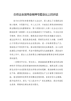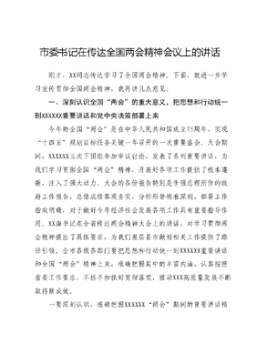 市委书记在传达全国两会精神会议上的讲话刚才,XX同志传达学习了全国两会精神。下面,就进一步学习宣传贯彻全国两会精神,我再讲几点意见。一、深刻认识全国两会的重大意义,把思想和行动统一到XXXXXX重要讲话和党中央决策部署上来今年的全国两会是在中华人民共和国成立75周年、实现十四五规划目标任务关键一年召开的一次重要盛会。大会期间,XXXXXX三次下团组参加审议讨论,发表了系列重要讲话,为我们学习贯彻全国两会精神,开展好各项工作提供了根本遵循、注入了强大动力。大会的各份报告特别是李强总理所作的政府工作报告,总结成绩客观务实,分析形势精准深刻,部署工作指向明确,对于做好今年经济社会发展各项工作具有重要指导作用。XX海书记在全省传达两会精神大会上的讲话,对学习贯彻两会精神提出了具体要求,为我们基层县市做好相关工作提供了路径引领。全市各级各部门要把思想和行动统一到XXXXXX重要讲话和全国两会精神上来,准确把握其中的丰富内涵,认真按照省委工作要求,不折不扣抓好贯彻落实,推动XXX高质量发展不断取得新成效。一要深刻认识、准确把握XXXXXX两会期间的重要讲话精神。全国两会期间,XXX站在党和国家事业发展的战略高度,就因地制宜发展新质生产力、激发各类人才创新活力潜力、夯实高质量发展生态基础、全面提升新兴领域战略能力等方面,发表了系列重要讲话,提出了一些新思想新论断新要求,强调了一些关键事关键点关键处。XXX的这些讲话高屋建瓴、视野宏大、思想深邃,是我们做好新时代经济社会发展各项工作的根本遵循。全市上下要准确把握精神实质,深刻领悟丰富内涵,真抓实干、奋发进取,凝心聚力推动各项事业发展。二要深刻认识、准确把握大会对去年发展成就的客观总结。报告指出,面对异常复杂的国际环境和艰巨繁重的改革发展稳定任务,以XXX同志为核心的党中央团结带领全党全国各族人民,顶住外部压力、克服内部困难,付出艰辛努力,新冠疫情防控实现平稳转段、取得重大决定性胜利,全年经济社会发展主要目标任务圆满完成,高质量发展扎实推进,社会大局保持稳定,全面建设社会主义现代化国家迈出坚实步伐。这些重大成就的取得,根本在于XXXXXX把脉定向和掌舵领航,在于党中央的集中统一领导在于XXX新时代中国特色社会主义思想的科学指引。我们要把这些伟大成就宣传好、领会好,更加深刻认识两个确立的决定性意义,进一步增强四个意识、坚定四个自信、做到两文可居文库——海量学习资料,手机电脑均可下载www.wenkeju.com个维护。三要深刻认识、准确把握政府工作报告对今年经济社会发展的目标要求。政府工作报告提出了今年经济社会发展的预期目标把经济增长预期目标设定在5%左右,从推进现代化产业体系建设深入实施科教兴国战略、着力扩大国内需求、坚定不移深化改革扩大高水平对外开放、更好统筹发展和安全、坚持不懈抓好三农工作、推动城乡融合和区域协调发展、加强生态文明建设、保障和改善民生等十个方面对今年政府工作进行了谋划部署,为我们做好今年工作厘清了思路、明确了路径。要锚定目标任务,深入研究明政策、追政策,主动对接争项目、争资金,细化工作举措、压实工作责任,确保全国两会精神在我市落地落实、见行见效。二、对标对表全国两会的部署要求,奋力开创XXX高质量发展新局面紧紧围绕党中央、国务院对今年经济社会发展的重大决策部署,进一步明确时间表、划定路线图、完善任务书奋力推进XXX高质量发展再上新台阶。一要狠抓项目支撑,在投资增效上创新突破。牢固树立项目为王理念,始终把招商引资作为头等大事、把项目落地作为文可居文库——海量学习资料,手机电脑均可下载www.wenkeju.com根本评价标准,推动经济实现质的稳步提升和量的合理增长。紧盯项目开工。全力以赴推动计划实施的XX个5000万元以上重点项目早日落地开工,特别是对XX个春季早开工项目,强化问题破解及前期手续办理,力争项目开工2个月内完成入库。强化服务保障扎实推进九解一协调帮扶企业提质增效十项攻坚行动,抓好项目建设四位一体、五项联保、项目秘书等工作机制落实,推动项目加快建设。开展精准招商。围绕我市现代产业体系建设,紧盯行业龙头、头部企业,坚持锻长板、补短板相结合,积极开展招商活动,力争年内签约落地5000万元以上项目不少于XX个。二要狠抓现代产业,在转型升级上积聚动能。立足我市资源禀赋、产业优势,加快新旧发展动能接续转换,加快培育形成新质生产力。要推动旅游业提质。启动实施XXX市百亿级旅游产业攻坚行动,全力XX、XX、XX等项目建设,统筹抓好XX至XX水上旅游航线、XX等项目前期工作,力争XX、XX旅游综合开发、XX特色小镇等项目取得实质性进展。要推动新兴产业提速。抢抓新能
