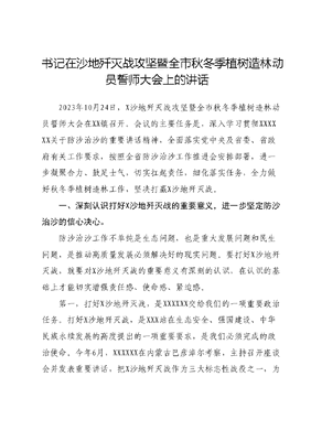 书记在沙地歼灭战攻坚暨全市秋冬季植树造林动员誓师大会上的讲话2023年10月24日,X沙地歼灭战攻坚暨全市秋冬季植树造林动员誓师大会在XX镇召开。会议的主要任务是,深入学习贯彻XXXXXX关于防沙治沙的重要讲话精神,全面落实党中央及省委、省政府有关工作要求,按照全省防沙治沙工作推进会安排部署,进一步凝聚合力、鼓足士气,切实扛起责任,细化落实任务,全力做好秋冬季植树造林工作,坚决打赢X沙地歼灭战。一、深刻认识打好X沙地歼灭战的重要意义,进一步坚定防沙治沙的信心决心。防沙治沙工作不单纯是生态问题,也是重大发展问题和民生问题,是推动高质量发展必须解决好的现实问题。要打好X沙地歼灭战,就要对X沙地歼灭战的重要意义有深刻的认识,在认识的基础上才能切实增强责任感、使命感、紧迫感。第一,打好X沙地歼灭战,是XXXXXX交给我们的一项重要政治任务。打好X沙地歼灭战,是XXX站在生态安全、强国建设、中华民族永续发展的高度提出的一项重要要求,是我们必须完成的政治使命。今年6月,XXXXXX在内蒙古巴彦淖尔考察,主持召开座谈会并发表重要讲话,把X沙地歼灭战作为三大标志性战役之一,为我们指明了方向。X地处X沙地南缘,是遏制X沙地南侵的重要屏障是我省打赢X沙地歼灭战的主阵地、桥头堡,X特殊的地理位置和治沙历史为国家林草局开启三大战役开辟了第一个篇章,启动了第一个战役,可以说,X沙化土地治理的好坏,不仅关系到我市的生态环境,更关系到X现代化都市圈和京津冀地区的生态安全。维护国家五大安全,筑牢我国北方生态安全屏障,是我们必须牢记的国之大者、义不容辞的政治责任。我们要牢记XXX嘱托,站在讲政治、讲大局的高度谋划推进好防沙治沙工作,以工作的实绩向XXX和党中央交上满意的答卷。第二,打好X沙地歼灭战,是加快实现全面振兴新突破的强力支撑。X的振兴是全面振兴、全方位振兴,加强生态保护和修复、让生态安全屏障更加牢固,是实现全面振兴新突破的题中应有之意。去年以来,我们把沙化土地治理作为八大攻坚战的重要组成部分,坚持打生态牌,走绿色路,就是注重和发挥生态环境对振兴发展的战略支撑作用,以良好的生态环境为产业发展招商引资、招才引智等提供助力。我们打好X沙地歼灭战不仅是在改善生态环境,更是在促进经济发展。我们要牢固树立和践行绿水青山就是金山银山的理念,把防沙治沙纳入到经济社会发展总体布局,像保护眼睛一样保护自然和生态环境,以高品质的生态环境支撑高质量发展。文可居文库——海量学习资料,手机电脑下载www.wenkeju.com第三,打好X沙地歼灭战,是更好满足人民群众对美好生活向往的现实需要。良好的生态环境是最公平的公共产品,是最普惠的民生方式,当前,全市还有52个乡镇的群众生活在沙化荒漠化的地区,部分地区生态治理水平还不高,村容村貌治理有待提高现址旧屋亟待处理,人民群众生产生活条件较差,只谈收入很难提升幸福感。同时,全市人民在春秋季节仍然承受风沙袭扰。我们要清醒认识沙化土地带来的现实问题,坚持生态惠民、生态利民、生态为民,着力改善沙区生态环境质量和群众生产生活条件让人民幸福生活的成色更足。第四,打好X沙地歼灭战,是锤炼干部作风的有力举措。XXXXXX对全国防沙治沙工作大局及面临的机遇与挑战进行了深入系统剖析,特别指出防沙治沙工作具有长期性、艰巨性、反复性和不确定性等困难特点,点明了生态建设的瓶颈问题。打好X沙地歼灭战是对我们党员干部意志、能力、作风的重大考验,也是我们推动干部经风雨、见世面、长才干的磨刀石。省委郝鹏书记在全省防沙治沙工作会议上,对我们的治沙工作给予高度评价,强调今天的共产党人就要这么去学、去干,不这么干就愧对我们这一代人的使命。我们要传承和赓续彰武治沙精神,弘扬新时代三沟精神,不断凝聚打赢X沙地歼灭战的精神动力,锲而不舍、迎难而上,在与风沙斗争中增长才干、磨炼意志、收获成果。文可居文库——海量学习资料,手机电脑下载www.wenkeju.com二、准确把握防沙治沙工作新任务新要求,推进X沙地歼灭战取得扎实成效。当前,X沙化治理呈现整体好转、改善加速这种良好态势但防沙治沙任务依然艰巨,全市沙化土地面积占全市国土面积的19.3%,占全省沙化土地面积的44.7%;另外我们还存在着水资源供给不平衡,沙化农田的治理,水利工程的治理,相互割裂、各自为战、单摆浮搁。这种问题仍然存在,当然不仅仅是治沙方面,还有其他方面也存在没有真正建立起高效、有序的工作模式和运行机制,节约高效的体制机制不完善,如何破解花更小的钱能够获得更大的效果,这是我们今后工作努力的方向,还有提升的空间,下一步要加快进程、集中力量,坚持问题导向、成果导向,以补齐环境要素、修复生态系统功能为主攻方向,把培育健康稳定、功能完备的生态系统放在新目标里,把这个作为刚性