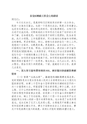 在全区财政工作会上的讲话同志们:今天这次会议,是我到咱们区财政局后的第一次全体会,既是一次集体见面会,也是一个思想交流会;既是工作部署会,也是作风建设会。我来的这段时间,通过熟悉情况,与咱们同志进行交流沟通,对财政局的工作和同志们也有了初步的认识和了解。总体感觉是:咱们财政局干部职工很团结,队伍素质高,执行力很强,工作氛围很好,同大家相处比较愉快与顺畅,没有障碍,更没有隔阂。所以,能够与在座的各位一块儿工作,我感到十分荣幸。这既是机遇,更是缘份。在今后的工作中,还望同志们给予支持、帮助。近段时间来,通过深入学习宣传贯彻党的XXX精神,认真落实省、市财政工作会议安排部署,谋划今后一个时期的重点工作任务。同时对如何进一步加强队伍建设,如何更好地培养锻炼干部,如何更好地发挥财政的保障作用等方面进行了一些思考。借此机会,谈几点认识、提几点要求,同各位同仁共同提高。下面,就做好今后工作,我讲几点意见。一、深入学习宣传贯彻党的XXX,更好履行财政新职责新使命(一)坚持三抓三促,推进党的XXX精神走深走实。党的XXX是在全党全国各族人民迈上全面建设社会主义现代化国家新征程、向第二个百年奋斗目标进军的关键时刻召开的一次十分重要的大会,郑重宣誓了党在新征程上举什么旗、走什么路、以什么样的精神状态、朝着什么样的目标前进,为新时代新征程党和国家事业发展、实现第二个百年奋斗目标指明了前进方向、确立了行动指南。党的二十届一中全会选举产生以XXX同志为核心的新一届中央领导集体,充分体现了全党共同意志,充分反映了亿万人民共同心愿。全局党员干部要从事关党和国家事业继往开来、事关中国特色社会主义前途命运、事关中华民族伟大复兴的高度,深刻认识党的XXX的重大意义,深刻领悟两个确立的决定性意义,始终牢记国之大者,坚决做到两个维护,切实把思想统一到党的XXX精神上来,把力量凝聚到实现党的XXX确定的目标任务上来。要把深入学习宣传贯彻党的XXX精神作为当前和今后一个时期的首要政治任务,迅速掀起学习热潮。一是紧抓安排部署,提前谋划促落实。认真研究制定学习贯彻实施方案,细化工作安排,切实把学习宣传贯彻大会精神提上日程,有力有效推进,不断把学习宣传贯彻工作引向深入,确保大会精神落到实处。坚持领导干部先学一步、学深一层,带头开展学习研讨、撰写体会文章,党员干部原原本本学、逐字逐句学,在深钻细研中把握精髓要义、吃透精神实质,深入理解党的XXX提出的一系列新思路、新思想、新举措,切实把思想和行动统一到党的XXX精神上来,把智慧和力量凝聚到抓贯彻抓落实各项工作中。二是紧抓学习宣传,营造氛围促提升。利用大厅LED电子屏幕,滚动播放XXX报告金句,在深读原本的基础上,提炼党的XXX报告要点,制作宣传展板,将党的XXX精神全方位、多角度展示出来,进一步营造学原文、悟原理的浓厚学习氛围。组织党员干部到分包村开展党的XXX宣讲活动,紧密联系干部群众思想和工作实际,深入解读重大思想观点、重大判断、重大举措,带领广大党员群众进一步往深里学、往实里学。通过微信公众号、网络云课堂等载体形式,开展线上学习培训、发布学习动态,不定期在局工作微信群中推送党的XXX金句、《学习党的XXX辅导百问》、评论员文章等内容,让全体党员干部把学习宣传党的XXX精神作为一项重要任务,学在日常,落实在经常,确保党的XXX精神落地生根。三是紧抓深学细悟,凝心聚力促成效。结合理论学习,三会一课、主题党日活动,组织全体党员开展学习党的XXX精神专题学习、集中研讨,通过党员干部谈认识体会、谈感想感言、谈工作落实,不断提高思想认识,增强凝聚力。把学习党的XXX精神与《XXX谈治国理政》第四卷结合起来,与XXXXXX视察河南时的重要精神文可居文库——海量学习资料,手机电脑均可下载www.wenkeju.com结合起来,用学习成果激发党员干部担当干事的激情和动力。(二)聚焦重点工作,更好履行财政职责使命。贯彻落实党的XXX报告精神,关键要落实到行动上、体现在实效上,把党中央的各项决策部署贯彻到财政工作的全过程。当前距离年底不到20天,时间紧迫,任务艰巨,要全面落实党中重要要求,拿出更加扎实有力的行动,抓好财政收入、民生保障、专项债券争取、财政体制改革等重点工作,争取圆满完成2023年各项重点工作。一是继续狠抓稳经济一揽子政策和接续措施落地。深入落实各项减税缓税降费、大规模增值税留抵退税等政策,持续优化营商环境,激发市场主体活力。二是强化征管措施,提升财政保障能力。注重内部挖潜、向上争取、培育税源,强化税收征管,完善税收保障措施,加强重点税源监控,做到应收尽收。三是突出人民至上,提高民生保障水平。积极统筹资金支持就业、教育、养老、医疗、社会保障、住房等民生事业发展,落实各项惠民强农政策,全面增进民