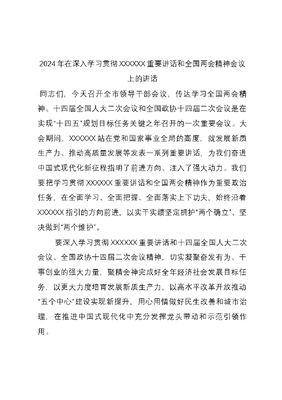 2024年在深入学习贯彻XXXXXX重要讲话和全国两会精神会议上的讲话 同志们,今天召开全市领导干部会议,传达学习全国两会精神。十四届全国人大二次会议和全国政协十四届二次会议是在实现十四五规划目标任务关键之年召开的一次重要会议。大会期间,XXXXXX站在党和国家事业全局的高度,就发展新质生产力、推动高质量发展等发表一系列重要讲话,为我们奋进中国式现代化新征程指明了前进方向、注入了强大动力。我们要把学习贯彻XXXXXX重要讲话和全国两会精神作为重要政治任务,在全面学习、全面把握、全面落实上下功夫,始终沿着XXXXXX指引的方向前进,以实干实绩坚定拥护两个确立、坚决做到两个维护。 要深入学习贯彻XXXXXX重要讲话和十四届全国人大二次会议、全国政协十四届二次会议精神,切实凝聚奋发有为、干事创业的强大力量,聚精会神完成好全年经济社会发展目标任务,以更大力度培育发展新质生产力,以高水平改革开放推动五个中心建设实现新提升,用心用情做好民生改善和城市治理,在推进中国式现代化中充分发挥龙头带动和示范引领作用。 一、深刻领会党中央对国内外形势的科学判断,保持战略定力,提振发展信心,在培育发展新质生产力上展开新的探索,作出新的贡献 要把学习贯彻XXXXXX重要讲话和全国两会精神,同深入学习贯彻XXXXXX考察**重要讲话精神紧密结合起来,认真抓好贯彻落实。深刻领会党中央对国内外形势的科学判断,保持战略定力,提振发展信心,在培育发展新质生产力上展开新的探索,作出新的贡献。坚持稳中求进、以进促稳、先立后破,以改革创新办法破解发展中的难题,更好引导社会预期、增强经济活力。深入贯彻以人民为中心的发展思想,把改善民生摆在突出位置,着力解决人民群众急难愁盼问题。 要深入学习领会XXXXXX重要讲话精神,深刻把握当前国际国内形势,深刻把握因地制宜发展新质生产力、全面深化改革开放、促进区域协调发展、加强生态文明建设、形成推动发展强大合力等重要要求,深刻把握做好新时代人大和政协工作、全面提升新兴领域战略能力、加强党的建设等重要要求,不折不扣把党中央各项决策部署落到实处。要把学习贯彻XXXXXX重要讲话精神同学习贯彻XXXXXX历次来**考察重要讲话重要指示精神结合起来,自觉用以统一思想、统一意志、统一行动。文可居文库——海量学习资料,手机电脑均可下载www.wenkeju.com 二、向前一步作为、更加主动担责,奋力抢抓工作先机,完成全年目标任务 要向前一步作为、更加主动担责,奋力抢抓工作先机,完成全年目标任务。强化内需拉动,提前做好项目储备,切实发挥政策效应。加快实施城市更新行动。围绕企业新建项目、竣工达产项目、技改投资项目等改进审批服务。加快商务楼宇改造和重点商圈改造提升,促进服务消费提质扩容,深入实施重点消费品类以旧换新政策。突出集聚流量,加强商旅文体、会展论坛的统筹,加强各类活动的时间协同、节奏协调,实现同频共振。坚持落细落实,各项政策举措要落到企业和项目上,体现到开工进度和实物工作量上。结合重点企业服务包制度,及时发现、反映和解决企业发展中遇到的困难和问题。注重市区协同,压紧压实各区稳增长、促发展责任,市级职能部门要提高政策供给的精准性有效性,面向基层、面向企业做好服务,通过解决一件事带动解决面上一批事。 三、在因地制宜培育新质生产力上加大力度,形成高质量发展源源不断的澎湃动力 要在因地制宜培育新质生产力上加大力度,形成高质量发展源源不断的澎湃动力。以科技创新引领产业创新,深化科技体制机制改革,强化科技创新策源功能。围绕集成电路、生物文可居文库——海量学习资料,手机电脑均可下载www.wenkeju.com医药、人工智能三大先导产业深入实施新一轮建设。加强前沿领域和未来产业布局,各区要发挥自身优势,做深做细赛道,提升深耕细分领域、培育产业生态能力。抢抓高端化、智能化、绿色化机遇,加快推动新型工业化。结合大规模设备更新,引导企业加快产线改造和升规提质。加快工业互联网规模化应用,加快发展工业服务业,推动航运贸易转型升级,构建绿色低碳供应链体系,实现产业园区规模化集约化发展。要积极扩大有效投资和激发消费潜能,加快推进重大投资项目,积极引进引领性、标志性外资项目,建立健全要素联保机制,稳定和扩大民间投资办好第四届消博会,打造消费新增长点,吸引更多国际游客,加快建设国际旅游消费中心。 四、在更高起点推进首创性改革、引领性开放,推动五个中心建设取得更大突破,更好为国家试制度、补短板、探新路 要在更高起点推进首创性改革、引领性开放,推动五个中心建设取得更大突破,更好为国