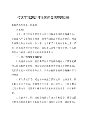传达学习2024年全国两会精神讲话稿尊敬的各位领导、同事们:大家好!今天,我们在这里召开传达学习2024年全国两会精神大会,旨在深入学习贯彻两会精神,推动我们的工作再上新台阶。两会是我国政治生活中的一件大事,它汇聚了人民的智慧和力量,明确了国家发展的方向和重点。我们要认真学习两会精神,切实把思想和行动统一到党中央的决策部署上来。一、学习领悟要更加自觉1.提高政治站位:我们要深刻认识到两会精神对于国家发展和人民福祉的重要性。政治觉悟是理解和贯彻两会精神的基础,我们要从党和国家的全局出发,以政治高度看待两会精神的学习和贯彻。2.深入系统学习:两会精神涵盖了国家政策、经济发展、社会民生等多个领域,我们要进行全面、深入的学习,不仅了解会议的主要内容,还要深入研究相关政策和法规的背景、目的和影响。3.结合实际工作:将两会精神与自身工作相结合,将会议提出的目标和任务转化为具体的工作计划和行动方案。通过学习,我们应该能够将两会精神运用到实际工作中,为国家的发展和人民的福祉作出贡献。4.学习交流:积极参与学习交流活动,与同事们分享学习心得和体会,共同提高对两会精神的理解和认识。通过交流,我们可以借鉴他人的经验和观点,拓宽自己的视野,进一步加深对两会精神的理解。5.增强政治觉悟和责任意识:学习两会精神的过程也是提高自身政治觉悟和责任意识的过程。我们要深刻认识到自己作为一名公民的责任和使命,积极履行职责,为国家的发展和人民的幸福贡献自己的力量。二、作风建设要更加到位1.实事求是,反对形式主义和官僚主义:我们要秉持实事求是的原则,注重实际工作,摒弃形式主义和官僚主义。形式主义和官僚主义会浪费资源、降低效率,我们要坚决与之作斗争,追求真实和实效。2.树立宗旨意识,关注群众利益:我们必须时刻将人民群众的利益放在首位,牢记为人民服务的宗旨。要深入了解群众的需求,切实解决他们关心的实际问题,不断增强人民群众的获得感和幸福感。3.加强纪律建设,严守党纪党规:纪律是党的生命线,我们文可居文库——海量学习资料,手机电脑下载www.wenkeju.com要严格遵守党的纪律和规矩,保持廉洁奉公的作风。坚决抵制各种腐败行为,做到清正廉洁,以身作则,为党和人民事业的发展提供坚实的纪律保障。4.提高工作效率,勇于担当负责:在工作中,我们要勇于担当,敢于负责,积极主动地推动工作的落实。要提高工作效率,摒弃拖延和推诿,以高效的工作态度和卓越的执行能力,为事业发展贡献力量。5.建立长效机制,确保取得实效:作风建设是一个长期的过程,需要建立健全长效机制。通过加强监督检查,及时发现和纠正问题,确保作风建设取得实实在在的成效。同时,要不断总结经验,完善制度,推动作风建设的持续深入。三、服务大局要更加精准1.紧密围绕国家大局,找准工作重点:我们要紧密围绕国家发展的大局,明确工作的切入点和着力点。深入了解国家战略和政策,与国家发展的方向保持一致,确保我们的工作具有针对性和前瞻性。2.深入了解需求,提供精准高效服务:要通过深入调查研究了解市场需求和群众期待,以便提供更加精准、高效的服务。与各方面保持密切沟通,及时掌握信息,不断优化服务内容和方式满足人民群众日益增长的需求。文可居文库——海量学习资料,手机电脑下载www.wenkeju.com3.创新工作方式,提高服务针对性:我们要勇于创新工作方式和方法,不断探索适应新形势的工作模式。通过创新,提高服务的针对性和实效性,为解决实际问题提供更多有效的途径和手段。4.加强沟通协调,形成发展合力:加强与各方面的沟通协调包括政府部门、企业、社会组织等,形成工作合力。通过密切合作,实现资源共享、优势互补,共同推动事业的发展,取得更好的成果。5.以人民满意为出发点和落脚点:人民满意是我们工作的最终目标。我们要以人民的需求为导向,不断提升服务质量和水平积极回应人民群众的关切,努力创造让人民满意的工作成果,为人民谋幸福、谋发展。四、结合城乡实际要更加紧密。1.我们要深入了解城乡发展的现状和需求,包括城市和农村的人口、经济、社会、环境等方面的情况,以及城乡之间的差距和不平衡问题。只有深入了解实际情况,才能更好地制定政策和措施,促进城乡协调发展。2.要找准城乡结合点,推动两会精神在具体工作中的落地生根。例如,在城市规划和建设中,要考虑到农村人口的转移和就业问题,为农村人口提供更好的公共服务和社会保障。在农村发文可居文库——海量学习资料,手机电脑下载www.wenkeju.com展中,要考虑到城市的需求和支持,发展特色农业、生态农业等为城市提供优质的农产品和生态环境。3.要注重工作的针对性和可操作性,确保各项工作取得实实在在的成效。在制定政策和措施时,要根据城乡的实际情况和需求,制定具体的工作计划和目标,明确责任主体和工作重点,