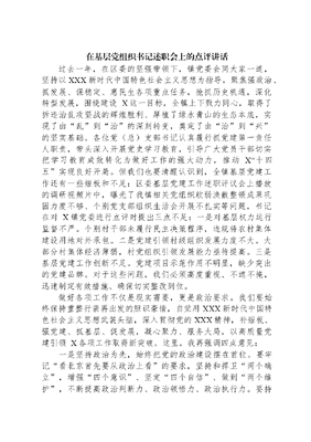 在基层党组织书记述职会上的点评讲话过去一年,在区委的坚强带领下,镇党委会同大家一道,坚持以XXX新时代中国特色社会主义思想为指导,聚焦强政治、抓发展、保稳定、惠民生各项重点任务,抢抓历史机遇,深化转型发展,围绕建设 X这一目标,全镇上下戮力同心,取得了拆违治乱攻坚战的辉煌胜利、厚植了绿水青山的生态本底,实现了由乱到治的深刻转变,奠定了由治到兴的坚实基础。各位党(总)支部书记认真履行抓党建第一责任人职责,带头深入开展党史学习教育,引导广大党员干部切实把学习教育成效转化为做好工作的强大动力,推动 X十四五实现良好开局。但我们也要清醒认识到,全镇基层党建工作还有一些短板和不足:区委基层党建工作述职评议会上播放的调研视频片中,曝光了我镇相关党组织软弱涣散整顿成果巩固力度不够、个别党支部组织生活会开展不扎实等问题,书记在对 X镇党委进行点评时提出三点不足:一是对基层权力运行监督不严。个别村干部未履行民主决策程序,违规将农村集体建设用地对外承包。二是党建引领村级组织发展力度不大。大部分村集体经济薄弱,村党组织引领发展能力亟待提高。三是基层党建工作创新不足。党建项目示范作用不明显,缺少突出的党建品牌。对于这些问题,我们必须高度重视、不遮不掩,迅速制定有效措施、确保切实整改到位。做好各项工作不仅是现实需要,更是政治要求。我们要始终保持重整行装再出发的胆识豪情,自觉用XXX新时代中国特色社会主义思想武装头脑,深入贯彻党的XXX精神,补短板、强党建、抓基层、促发展,凝心聚力、服务大局,以高质量党建引领 X各项工作取得新突破。这里,我再强调四点意见:一是坚持政治为先,始终把党的政治建设摆在首位。要牢记看北京首先要从政治上看的要求,坚持和捍卫两个确立,增强四个意识、坚定四个自信、做到两个维护,不断提高政治判断力、政治领悟力、政治执行力。要持续强化思想理论武装,推进党史学习教育常态化长效化,进一步学懂弄通做实XXX新时代中国特色社会主义思想,切实从中汲取政治力量、思想力量和实践力量。要严明党的政治纪律和政治规矩,带头维护镇党委权威,严格执行重大事项请示报告制度,确保中央决策、市委要求、区委部署执行不偏向、不变通、不走样,真正做到令行禁止、真正确保政令畅通。要严格落实意识形态责任制,不断提高舆论引导水平,坚决守住不发生舆情事件的底线。二是坚持党建为纲,推动基层党组织全面进步、全面过硬要更加精准有效抓好各领域基层党组织建设,以提升组织力为重点,突出政治功能,着力破解重点难点问题,切实增强基层党建工作的针对性、实效性。结合区委固本强基年活动,镇党委将在今年开展基础工作年和作风建设年双年专项教育活动,各党(总)支部书记要发挥带头作用,认真开展好这项活动,真正做到夯工作基础、强政治素质、增实践本领、严纪律作风,努力实现党员干部思想引领力、解决历史遗留公信力、弘扬 X精神影响力、推动改革发展执行力和全面从严治党约束力五个方面能力的大幅提升。要认真开展党支部分类晋级和晋位提升工作,深入实施村书记头雁工程、两委干部骨干工程和后备干部育才工程,持续增强党支部政治功能。要全面加强各党(总)支部干部人才队伍建设,抓紧推动村以外的党组织完成换届。要充分发挥党建协调委员会作用,加强各村、各机关科队站所和各非公企业党组织的沟通交流、结对帮扶,建好资源、需求、项目三个清单,构建条块结合、资源共享、优势互补、共驻共建的区域化大党建工作体系。三是坚持发展为要,以高质量党建引领高质量发展。各党(总)支部要充分发挥把方向、管大局、作决策、保落实作用,推动各方面工作取得新成绩。要紧紧围绕全区加快建设四区、全镇建设 X的目标,全力以赴落实好各项发展任务。今年年初工作会上,我提出今年工作1+2+4的的总思路,即文可居文库——海量学习资料,手机电脑均可下载www.wenkeju.com突出高质量发展这个重点,严守安全稳定和生态环境两条底线,全面抓好环境建设、美丽乡村、接诉即办和民生保障四项中心工作,各党(总)支部要紧紧围绕这个思路,在各项任务的落实中检验党建成果。今天在座各位,既是我们党组织的带头人,也是我们各单位、各领域的主心骨,是全镇党的建设和发展事业的绝对主力,大家一定要把心思集中在谋事上、把本领体现在干事上、把目标锁定在成事上,以时不我待、只争朝夕的精神推动任务早落实、早见效。四是坚持纪律为尺,全面落实管党治党政治责任。要把纪律和规矩挺在最前面,压紧压实各级党组织主体责任和书记的第一责任、分管领导责任和纪委监督责任,强化四责联动、共同发力,不断把全面从严治党引向深入。要严格落实中央八项规定精神,毫不松懈纠治四风。要始终坚持严的主基调,持续强化党性党规党纪教育和警示教育,加强廉洁文化建设。要认真对照区委对我