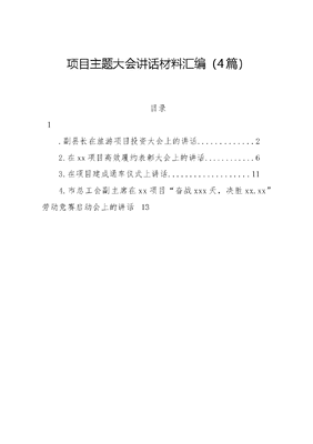 项目主题大会讲话材料汇编(4篇)目录1.副县长在旅游项目投资大会上的讲话.22.在xx项目高效履约表彰大会上的讲话63.在项目建成通车仪式上讲话.114.市总工会副主席在xx项目奋战xxx天,决胜xx.xx劳动竞赛启动会上的讲话13副县长在旅游项目投资大会上的讲话尊敬的各位专家,各位企业家,各位领导嘉宾,大家下午好!非常感谢xx的邀请,非常感谢xx文旅为我们搭建了这么好的平台,使我们有机会与业内精英大咖进行近距离的交流和学习。我想在这里推荐一下我的家乡,潇洒xx,希望大家关注xx,走进xx,甚至喜欢xx,投资xx。xx隶属于xxxx,位于xx国家级黄金旅游线中心地段。县域面积xxxx平方公里,素有钟灵毓秀之地,潇洒文明之邦的美誉。有三条高速,两条高铁。县城距xx机场一小时车程,坐高铁到xx仅一个半小时,抵达xx西站仅需xx分钟。便利的交通条件,优美的山水环境,孕育了幸福富裕的现代生活。xx先后荣获了国际花园城市、全国文明城市、中国最具幸福感的县级城市、国家全面旅游示范区等一系列的城市名片。xx是一个风光秀丽的山水画城。xx你也许会惊讶,它同时结合了江河、临海、山谷、清泉、深潭、溶洞这么多优质的旅游资源,每一处拿出来都足够让人向往。xx的森林覆盖率为xx.xx%,年均空气优良天数xxx天,境内xxx条主要溪流,二类以上水质的占xx%。xx人十分珍爱与文可居文库——海量学习资料,手机电脑均可下载www.wenkeju.com呵护这片山水,十分注重生态环境的保护与修复,在全国率先开展了农村生活污水生态治理和垃圾分类处理。我们延续十多年保持着出境水优于入境水的良好记录。无数的名篇佳句都在赞颂这方山水的灵动与美好。今天的xx人也在继续呵护和续写着这份灵动与美好。江南忆,最忆是xx,xx美,最美丽在xx。xx还是一座历史悠久,人文璀璨的文化名城,xx置县于公元xxx年,历史上,xx等无数文人墨客,被xx山水所陶醉,在此流连忘返,留下了xxxx余篇诗词华章,山水名画。xx还是中国诗歌之乡,中国民间剪纸之乡,中国书法之乡、故事之乡、散文之乡。xx走出来的五位中国戏剧最高奖梅花奖得主,至今还跃居舞台引领风潮。近年来,我们连续多年举办xx山水艺术季、xx诗歌节。到xx,你可以登桐君山,可以探xx仙境,感受大自然的鬼斧神工,可以体验滑雪的刺激和漂流的激情,可以住一住民宿,体验现代生活,到天空之城观最美星空。xx的美食也非常诱人,xx菜菜馆遍布xx,深受市民的喜爱。xx还是一座运动之城,全民运动氛围深厚,竞技体育成果丰硕。xx一个四十多万人的人口小县,涌现出一批批奥运冠军文可居文库——海量学习资料,手机电脑均可下载www.wenkeju.com人才。作为亚运马术项目的举办地,有xx多个国家和地区的运动员和参赛马匹,在马术中心上演了巅峰对决。亚运后,多个马术观演产业项目也正在招引落户,从马术开始的赛事、培训、演绎等产业整装待发。看马术,游xx,未来,相信精彩会远超期待。xx是中国民营快递乡,中国快递行业xx%以上的市场份额是由xx人创办的,中通、申通、韵达、圆通等三通一达的快递企业在xx。xx的产业集群特色十分鲜明,全国最大的百亿规模的xx就坐落于xx。今年又签约落户了环球新材等几个百亿级项目,重大项目建设跑出加速度,为xx发展注入新动能。最近,xx省委省政府、xx市委市政府提出要把xx打造成世界级的旅游行道,xx拥有最深厚的人文底蕴,我们也立足于自身的禀赋,提出了要打造长三角最佳旅游目的地的目标,实施文化标识打造、重大项目牵引、产业龙头拓展等八大攻坚行动,系统整体的推进文旅深度融合。xxxx年,我们招了亿元以上的项目xx个,其中xx亿元的项目两个,一些重大的文旅项目也在加紧商务谈判。在这里,我推荐几块招商地块。xx综合码头区块,位于县城xx街道,拥有xxx米的江岸线,文可居文库——海量学习资料,手机电脑均可下载www.wenkeju.com周边有现成的规划用地xxx亩,我们的目标是招文旅综合体。xx区块,位于老城的xx,是原自行车厂厂区,有xx亩现成的建设用地和xx幢工业依存厂房,招商需求也是民宿集群或者文创综合体项目。xx村xx区块,位于慢生活体验区xx庐茨板块,拥有最原始的风貌,距县城仅半个小时的车程,里面有xx亩建设用地和xx栋老旧房屋,全年空气质量均为优,水质全为一类水质以上,我们希望招引民宿集群。xx商业区块,建设用地xxx亩,刚好是xA级景区xx仙境的洞口,招引大型文旅项目。xx有绝美的山水环境,深厚的人文底蕴,有便利的交通条件和完善的城市配套,周围又有庞大的长三角既有消费愿望和消费能力的近距离的人口。在这里希望大家