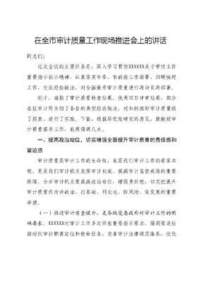 在全市审计质量工作现场推进会上的讲话同志们:这次会议的主要任务是,深入学习贯彻XXXXXX关于审计工作重要指示批示精神,认真落实市委、市政府工作部署,回顾梳理工作,交流经验做法,对全面提升审计质量进行再动员再部署。刚才,通报了审计质量检查结果、优秀项目评审结果,部分县区审计局介绍了各自的典型经验做法,对如何抓好审计质量做了探索、进行了实践。下面,根据局党组研究的意见,就做好审计质量提升工作,我再强调几点。一、提高政治站位,切实增强全面提升审计质量的责任感和紧迫感审计质量是审计工作的生命线,也是我们审计工作的看家本领,更是我们审计机关发挥审计权威、提高审计监督成效的重要保障。全市审计机关要提高政治站位,增强责任感,切实把提升审计质量作为讲政治、打基础、利长远、防风险、促发展的重要举措。(一)推进审计质量提升,是各级党委政府对审计工作的明确要求。XXXXXX对审计工作多次作出重要指示要求,强调要适应新时代审计职责定位和使命任务,完善审计法律规范体系,优化审计运行机制和审计工作流程。审计署审计长强调,审计质量的好坏直接决定了审计工作的成败,要切实加强审计质量控制,确保审计查出问题事实清、证据实、定性准。省审计厅长在审计质量工作会议上指出,审计质量是审计机关践行两个维护、有效发挥职能作用的重要保障。这些重要指示批示精神,为我们全面推进审计质量提升,做好新时期审计工作,指明了前进方向、提供了根本遵循。要不折不扣地落实好XXXXXX重要指示要求和省市委决策部署,完整准确全面贯彻新发展理念,始终把审计质量作为生命线抓实抓牢,深入推进审计法治化、科技化、专业化、系统化建设。(二)推进审计质量提升,是服务现代化强市建设的重要举措。进入新时代,审计工作承担的任务越来越重、责任越来越大越来越受到各级党委政府的重视和社会各界的关注。这些都要求我们,要紧紧围绕市委、市政府决策部署,及时跟进审计,坚决纠正有令不行、有禁不止行为,不断推动各项目标任务落实落地要增强审计质量意识,完善制度机制,加强质量管控,切实把推进审计质量提升转化为审计人员的自觉实践行动,把保证审计质量作为服务和保障全市经济社会发展的核心和关键,以常态化经济体检和高质量审计监督助力现代化强市建设。(三)推进审计质量提升,是审计事业高质量发展的内在要文可居文库——海量学习资料,手机电脑均可下载www.wenkeju.com求。审计是党和国家监督体系的重要组成部分,审计事业持续健康发展必须以高质量审计监督为前提。总体来看,近年来全市审计质量有了很大提升,但也还存在一些问题和不足,主要是:持之以恒抓审计质量的意识不强,重项目审计、轻质量管理的现象依然存在;用政治眼光看待审计发现经济社会问题的意识和能力存在欠缺;审计监督着力点抓得不够精准,审计治已病、防未病作用发挥还不充分,综合性、深层次揭示问题的能力还远远不够。二、把握关键、精准发力,切实推进审计质量提升审计质量的好坏直接决定了审计工作的成败。全市审计机关和广大审计人员要牢牢把握审计关键环节和重点事项,一个审计项目一个审计项目地抓,确保审计查出问题真实、完整、准确,切实推动全市审计质量提水平、上层次。(一)项目立项要精准科学。立项是审计工作的起点,决定着整个项目的质量。要加强立项研究。坚持政治导向、目标导向加大对十四五规划和省、市、县政府工作报告的学习研究力度,把准党委政府工作的脉搏、工作的大局、工作的重点、工作的方向,做到项目立项必须落实好上级审计机关决策部署要求,必须紧紧围绕党委政府中心工作和阶段性重点任务,必须符合审计力量摆布。要筛选优秀审计项目种子。在项目立项时,要紧盯文可居文库——海量学习资料,手机电脑均可下载www.wenkeju.com重大政策、重大战略,突出民生项目、民生资金,关注重大风险问题隐患,瞄准党政领导关心关注点、人民群众关注的热点难点堵点问题,进行梳理研判,建好项目储备库,选好优秀项目种子合理安排审计资源。(二)审计方案要合理可行。审计实施方案是审计工作的基础、依据和保证,在整个审计实施过程中发挥着全面指导作用。各审计组要严格依据审计工作方案编制审计实施方案,在充分调查了解的基础上,根据审计对象的不同特点,合理确定审计范围明确措施要求,做到审计重点突出、方法步骤具体、责任分工明晰,充分发挥审计实施方案作为施工图的作用。要严格按照实施方案确定的审计事项、审计任务、审计分工和时间进度要求依照法定职责和程序实施审计,并在实施过程中对方案进行不断补充、完善,做到既不漏项,又会抓重点,不能眉毛胡子一把抓。(三)现场审计要规范有序。现场审计是审计质量控制的关键环节,也是审计质量控制的基础和核心。要明确审计现场任务分工。审计方案中都有这一块,审计分工就是明确责任,谁干什么、怎么干、