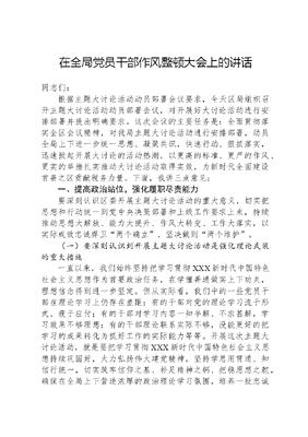 在全局党员干部作风整顿大会上的讲话同志们:根据主题大讨论活动动员部署会议要求,今天区局组织召开主题大讨论活动动员部署会议,对开展好大讨论活动进行安排部署并提出明确要求。这次会议的主要任务是:全面贯彻落实全区会议精神,对我局主题大讨论活动进行安排部署,动员全局上下进一步统一思想、凝聚共识,快速行动、狠抓落实,迅速掀起开展大讨论的活动热潮,以更高的标准、更严的作风、更实的举措扎实推动大讨论活动取得实效,为新时代全面建设首善之区贡献税务力量。下面,我讲三点意见:一、提高政治站位,强化履职尽责能力要深刻认识区委开展主题大讨论活动的重大意义,切实把思想和行动统一到党中央决策部署和上级工作要求上来,持续推动思想大解放、能力大提升、作风大转变、工作大落实,以实际成效忠诚捍卫两个确立,坚决做到两个维护。(一)要深刻认识到开展主题大讨论活动是强化理论武装的重大措施一直以来,我们始终坚持把学习贯彻XXX新时代中国特色社会主义思想作为首要政治任务,在学懂弄通做实上下功夫,理想信念得到进一步坚定。但从实际看,我们中的一些党员干部在理论学习上仍存在差距;有的干部对党的理论学习流于形式、疲于应付;有的干部对学习内容一知半解、不求甚解,学习效果不够理想;有的干部理论联系实际不够,没能更好的把学习的成果转化为抓好工作的实际能力等等。开展这次主题大讨论活动,就是要把学习贯彻XXX新时代中国特色社会主义思想持续巩固好,大力弘扬伟大建党精神,坚持学思用贯通、知信行统一,切实筑牢信仰之基、补足精神之钙、把稳思想之舵,确保在全局上下营造浓厚的政治理论学习氛围,培养一批忠诚担当、理论扎实的干部,为推动全区各项事业发展提供坚实税务保障。(二)要深刻认识到开展主题大讨论活动是推动全面从严治党的重要抓手党的十九大以来,以XXX同志为核心的党中央对持之以恒正风肃纪作出新部署、提出新要求,推进全党作风建设不松劲、不停步、再出发,刹住了一些长期没有刹住的歪风邪气,解决了一些长期没能解决的顽瘴痼疾。我局深入贯彻落实党中央全面从严治党方针和省委、市委部署要求,以钉钉子精神狠抓作风建设,融入日常、严在经常,纠建并举、标本兼治,取得了一定成效。但也要清醒看到,我们个别党员干部还不同程度存在思想、政治、组织、作风等方面的问题。比如,在落实涉税(费)优惠政策方面打折扣、做选择、搞变通;办税服务工作中态度冷漠,在解决企业诉求时久拖不结、置若罔闻、敷衍塞责,不担当、不作为、慢作为;比如,在落实税费征管、税收执法、行政管理等重大工作部署上,存有畏难情绪,缺乏敏感性与斗争精神,贯彻度低,创新能力差;甚至是还有极个别同志利用职权之便在管理服务对象中吃、拿、卡、要、报,逢年过节等特殊时间节点给企业打电话,接受企业礼品礼金,借款、赊物、低价购买商品问题等等。开展这次主题大讨论活动,就是要贯彻新时代党的建设总要求,以刮骨疗伤的勇气、坚忍不拔的韧劲整治官僚主义、特权思想和特权行为等作风建设的突出问题,把各级党组织建设得更加坚强有力,始终保持党的先进性和纯洁性。(三)要深刻认识到开展主题大讨论活动是加强队伍建设迫切需要在X处在大事可期、大事可成的黄金机遇期重要时期,如何把党的XXX精神贯彻落实好,如何把省委十届三次全会、市委十五届七次全会、区委九届五次全会确定的发展目标、发展定位、发展路径落实好,如何把中国式现代化实践场景建设好,文可居文库——海量学习资料,手机电脑均可下载www.wenkeju.com需要X局全体干部的共同努力。但也要清醒认识到,我们部分领导干部思想观念、能力水平和工作作风始终与高质量发展要求不相匹配。比如,担当意识不强,遇到问题首先想到的是自己会不会担责任,只要不出事儿、宁愿不干事儿;比如,竞争意识不强,在全省上下大抓考核的大背景下,仍然提不起精气神,不愿争先、不敢争先、不想争先,工作只满足于一般化,过得去;比如,因循守旧,眼界胸襟不开阔,想问题、办事情首先考虑自己一亩三分地,站位不高,导致工作延误不能达到预期等问题;比如,等靠要思想比较严重,面对优化营商环境中的重点任务,缺乏实际行动和开拓创新思路举措,甘于落后,比学赶超精神不足等问题等等。开展这次主题大讨论活动,就是要动员全局上下深入查究、认真整改,精准监督、靶向施治,不断净化干部队伍,提升服务群众的宗旨意识,以更加严格的纪律规矩更好地服务经济社会发展。二、明确目标任务,强化活动开展力度我们要认真贯彻区委工作要求,聚焦根本任务,把握总体要求,紧扣具体目标,强化重点措施,确保主题大讨论活动取得应有效果。(一)驰而不息强化理论武装学思想坚持不懈以XXX新时代中国特色社会主义思想凝心铸魂,用党的创新理论武装头脑、指导实践、推动工作。1.加强理论学习。要通过理论学习中心组学习、专题党课和党支部三会一课等形式,组织
