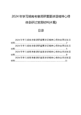 2024年学习湖南考察调研重要讲话精神心得体会研讨发言材料(4篇)目录2024年学习湖南考察调研重要讲话精神心得体会研讨发言材料.22024年学习湖南考察调研重要讲话精神心得体会研讨发言材料.52024年学习湖南考察调研重要讲话精神心得体会研讨发言材料.82024年学习湖南考察调研重要讲话精神心得体会研讨发言材料..112024年学习湖南考察调研重要讲话精神心得体会研讨发言材料近日,XXXXXX来到湖南考察调研,全国两会闭幕仅仅一周,XXXXXX就踏上三湘大地,体现了XXX传递的时不我待,实干为先的鲜明导向。此次调研之行,既重温了中国革命的红色摇篮,又积极探索发展新质生产力,更牵挂着湘江两岸的民生发展。让湖南人民进发出油然而生的历史文化自信,汲取了发展新质生产力的力量源泉,感受到草长莺飞二月天的澎湃生机。要想做人民的先生,先做人民的学生,以谦虚好学的态度做到人民的好学生。XXXXXX考察的第一站,就是有着千年学府、百年师范美誉的湖南第一师范学校,千年传承的是南宋理学,百年弘扬的是红色经典。百年大计,教育为本,为人师者,传道授业解惑也,作为人民教师,要以师德为先,多向人民请教问题,多做绝知此事要躬行的实事。从湖南第一师范学校毕业的毛泽东同志,在1927年土地革命战争的艰难时期,依然亲自下沉农村,在32天的时间里,步行700多公里,广泛地接触和询问群众,找准关键问题,深挖核心矛盾,提出解决方法,洋洋洒酒地撰写了一万七千余字的《湖南农民运动考察报告》,从而鲜明地体现了没有调查,就没有发言权。因此,想要建设教育强国,一定要以立德树人为根本任务,以服务中华民族伟大复兴为重要使命,在教育兴国的康庄大道上走稳走好,以负责任的态度让学生们奋斗有源、学习有德、拼搏有力。要想掌握先进的技术,就要海纳百川容精髓,以敢闯敢为的拼劲做到创新求精的好学生。XXXXXX考察的第二站是湖南 2021年引进的中西联姻好企业--巴斯夫杉杉电池材料有限公司创新是企业发展的力量源泉,作为中外合资企业,巴斯夫杉杉融合了西方的思想和东方的智慧,不断推进科技创新、管理创新、产品创新、市场创新、品牌创新,从而促进制造业行业高质量发展。今年的政府工作文可居文库——海量学习资料,手机电脑均可下载www.wenkeju.com报告中提出,大力推进现代化产业体系建设,加快发展新质生产力此次XXXXXX的湖南考察调研,就是XXX对加快发展新质生产力的实地指导,实地掌握新能源汽车配件领域的发展情况,从而巩固扩大新能源汽车等产业领先优势,加强新能源汽车行业的统筹布局和投资引导。要想让人民过上更好的日子,就要保障好人民的方方面面以求真务实的态度做到全心为民的好学生。XXXXXX在2024年新年贺词中指出,我们的目标很宏伟,也很朴素,归根到底就是让老百姓过上更好的日子。此次湖南常德之行,XXXXXX了解历史文化街区修复利用、城市水环境综合治理和春耕备耕、提升基层治理效能等情况。心事浩茫连广字,于无声处听惊雷。XXX时刻牵挂人民的冷暖,从各方面关注人民的衣食住行、历史情怀、粮食安全、民生保障等。我们拜人民为师就要让人民评价我们这位学生服务的好不好亲不亲,为我们打分,指出工作中还存在的不足,从而不断改善提升工作能力,以求真务实的态度做到全心为民的好学生。2024年学习湖南考察调研重要讲话精神心得体会研讨发言材料3月18日至19日,XXXXXX来到湖南考察调研。此次考察调研正值全国两会闭幕刚刚一周,XXXXXX就踏上三湘大地,开启两会之后首次考察。今年是新中国成立75周年,是实现十四五规划目标任务的关键一年。关键一年、关键时刻再到湖南,XXXXXX去了哪里,关