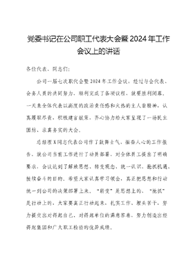 党委书记在公司职工代表大会暨2024年工作会议上的讲话各位代表、同志们:公司一届七次职代会暨2024年工作会议,经过与会代表、会务人员的共同努力,顺利完成了各项议程,就要胜利闭幕。一天来全体代表以高度的政治责任感和火热的主人翁精神,认真履职尽责,积极建言献策,齐心协力给大家呈现了一场民主团结、求真务实的大会。总经理X同志代表公司作了鼓舞士气、振奋人心的工作报告,就公司当前工作进行了动员部署,对全体员工提出了明确要求,会议达到了解放思想、转变观念、统一认识、抢抓机遇、接续奋斗的目的。希望大家认真学习领会,真正把思想和行动统一到公司的决策部署上来。转变是思想上的、抢抓是行动上的,大家要真正行动起来,扎实工作、埋头苦干,努力提交出对得起自己、对得起单位的满意答卷,努力创造出经得起集团和广大职工检验的优异成绩。今天是中国传统节日农历二月二日龙抬头,是阳气生发、万物生机盎然,是祈愿风调雨顺、五谷丰登、寄托生存希望的好日子。人勤春早功不负,实干奋斗启新程。现在我就全面落实本次职代会精神讲几点意见。一、存在的问题与挑战2023年的发展大家有目共睹,取得的成绩和工作亮点曾总也总结的非常具体。但是问题与挑战不容忽视,希望大家解决问题、化解挑战。(一)产业发展不优。地质工作仍处于分散、不系统、不能优质高效完成的阶段;矿山工作面临资源匮乏、采矿难度大、不能满负荷生产的现状;各个产业规模较小,缺少核心竞争力。(二)经营质量不高。公司营收结构单一、利润较少,盈利稳定性不强,缺少新的经济增长点。(三)债务负担沉重。历史形成的巨大债务存量,已成为制约当前公司健康发展的突出问题。(四)安环压力增加。安全环保消防各方面监管持续升级,公司生产发展的难度进一步加大。文可居文库——海量学习资料,手机电脑均可下载www.wenkeju.com(五)科创能力薄弱。科技是第一生产力、创新是第一动力,但公司的科技和创新已跟不上现代化企业的步伐。(六)人才梯队堪忧。公司的人才梯队建设不够,专业技术人才严重不足,吸引人才和留住人才的办法不多。二、工作的方法与建议2024年是公司守正创新、蓄势突破的关键之年,我们要把握大势,尽力而为。(一)贯彻新要求新任务因势而谋。要贯彻稳中求进、以进促稳、先立后破的总要求,坚持稳中求进工作总基调,努力构建大地质产业链,做好延链、补链、强链、建链工作,形成优势互补、高质量发展的产业格局。(二)紧扣新定位新使命乘势而上。要营造永不止步、永不懈怠、永不满足的奋进态势,保持现有优势、挖掘潜在优势、放大特色优势、形成新的优势,正视差距、迎头赶上,助力各个产业板块做强做优。(三)直面新问题新挑战逆势而进。要发扬准确识变、科学应变、主动求变的创新精神,当前面临的不稳定不确定因素文可居文库——海量学习资料,手机电脑均可下载www.wenkeju.com较多,公司已进入爬坡过坎的关键时期,这是发展过程中成长的烦恼,必须迎难而上,走好爬坡路。(四)把握新趋势新变化顺势而为。要抓住科技创新、产业变革、转型升级的有利时机,努力弯道超车换道超车,抢抓国家新一轮找矿突破战略行动、一带一路、高质量发展、陕西有色金属集团地勘基金项目等机遇,借船出海、借梯登高、借势发力,实现公司健康发展。三、做好今年工作的要求总体工作思路是以A新时代中国特色社会主义思想为指导,认真贯彻两集团聚焦主业、双轮驱动、多业并举、跨越发展战略,努力实现公司做强地质、做优矿业目标。(一)实行量、质、效是发展的核心要素集团倡导的以量、质、效指标为倍增的发展规划,我认为量、质、效是一体多面、互为表里,各有侧重、层层递进,是企业发展最核心的三要素。量、质、效可以指物、亦可指人,量是产量和体量,是经营发展的规模,是企业发展的基础;质是品质和素文可居文库——海量学习资料,手机电脑均可下载www.wenkeju.com质,是企业高质量发展的要求,是企业发展的保障;效是效率和效益,是生产经营的指标,是企业发展的目的。企业有了量的合理增长和质的有效提升,才能真正实现可持续的高质量发展。(二)实施高质量项目是发展的根本保障一是凭重点项目获奖励。将项目作为公司经营的基本盘,将高质量高效益完成项目作为推进工作的第一动力,以高质量项目引领公司高质量发展。工作项目化、项目清单化、清单责任化。要推行一重点一奖励、一新品一奖励、一成果一奖励等专项激励措施。二是以新增长点论英雄。产业是硬实力,项目是硬支撑。一个重大项目,往往就是新的经济增长点,重点项目建设,往往就是高质量发展的强劲支撑。有项目就有收益,有增长就有发展,我们要抢抓机遇,承揽优质项目,不断为公司发展注入新动能。(三)