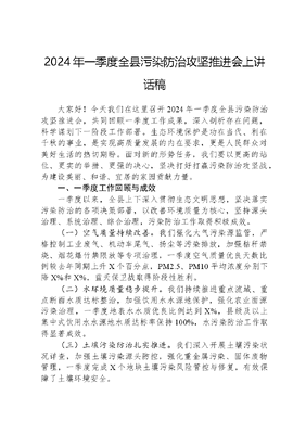 2024年一季度全县污染防治攻坚推进会上讲话稿大家好!今天我们在这里召开2024年一季度全县污染防治攻坚推进会,共同回顾一季度工作成果,深入剖析存在问题,科学谋划下一阶段工作部署。生态环境保护是功在当代、利在千秋的事业,是实现高质量发展的内在要求,更是人民群众对美好生活的热切期盼。面对新的形势任务,我们要以更高的站位、更实的举措、更强的决心,坚决打好打赢污染防治攻坚战,为建设美丽、和谐、宜居的家园贡献力量。一、一季度工作回顾与成效一季度以来,全县上下深入贯彻生态文明思想,坚决落实污染防治的各项决策部署,以改善环境质量为核心,坚持源头治理、系统治理、综合治理,污染防治工作取得积极成效。(一)空气质量持续改善。我们强化大气污染源监管,严格控制工业废气、机动车尾气、扬尘等污染排放,加强秸秆禁烧、烟花爆竹禁限放等专项治理,一季度空气质量优良天数比例较去年同期上升X个百分点,PM2.5、PM10平均浓度分别下降X%和X%,蓝天保卫战取得阶段性胜利。(二)水环境质量稳步提升。我们持续推进重点流域、重点断面水质达标整治,加强饮用水水源地保护,强化农业面源污染治理,一季度地表水水质优良比例达到X%,县级及以上集中式饮用水水源地水质达标率保持100%,水污染防治工作取得显著成效。(三)土壤污染防治扎实推进。我们深入开展土壤污染状况详查,加强土壤污染源头防控,强化重金属污染、固体废物管理,一季度完成X个地块土壤污染风险管控与修复,有效保障了土壤环境安全。(四)环境监管能力持续增强。我们完善环境监测网络,提升环境执法效能,一季度查处环境违法案件X起,罚款金额达X万元,有力震慑了环境违法行为,环境监管体系进一步完善。二、存在的问题与挑战在肯定成绩的同时,我们也应清醒认识到,当前全县污染防治工作还面临一些问题与挑战:(一)部分企业环保意识淡薄,偷排漏排、超标排放现象时有发生,环境违法行为查处难度大。(二)农村面源污染问题突出,畜禽养殖废弃物处理、农药化肥使用等环节监管力度不够。(三)生态环境基础设施建设滞后,污水处理厂、垃圾处理设施等运行不畅,环境承载压力大。(四)公众参与度不高,环保知识普及、环保意识培育还需加强,共建共治共享的环保格局尚未完全形成。三、二季度工作部署与要求面对新的形势任务,我们要以更大的决心、更实的举措,坚决打好打赢污染防治攻坚战,为建设美丽、和谐、宜居的家园贡献力量。(一)坚持问题导向,精准施策。针对一季度工作中暴露的问题,我们要深入剖析原因,精准制定整改措施,确保问题得到有效解决。对环境违法行为要依法严惩,对农村面源污染要加强源头治理,对生态环境基础设施要加大投入、提升运行效率,对公众参与要创新方式、加大宣传力度。(二)强化责任落实,形成合力。各级各部门要切实履行环保职责,形成齐抓共管的工作格局。县环保部门要充分发挥牵头抓总作用,各乡镇、街道要落实属地责任,企业要履行环保主体责任,全社会要积极参与,形成上下联动、左右协同、内外互动的环保工作合力。(三)创新工作方式,提升效能。我们要充分利用现代科文可居文库——海量学习资料,手机电脑均可下载www.wenkeju.com技手段,提升环保监管效能。推进智慧环保建设,实现环境数据实时采集、智能分析、精准监管。推广环保管家、第三方治理等模式,引入市场机制,提高环保服务质量和效率。(四)加强宣传引导,营造氛围。我们要加大环保法律法规、政策标准、科普知识的宣传力度,提高公众环保意识。开展环保公益广告、环保志愿者行动等宣传活动,营造全社会关注环保、参与环保的良好氛围。总结,一季度全县污染防治工作取得一定成效,但挑战与压力犹存。我们要坚定信心、保持定力,以更高标准、更严要求、更实举措,坚决打好打赢污染防治攻坚战,为建设美丽、和谐、宜居的家园贡献力量。让我们携手共进,为守护蓝天碧水净土、建设美丽家园而努力奋斗!谢谢大家!文可居文库——海量学习资料,手机电脑均可下载www.wenkeju.com