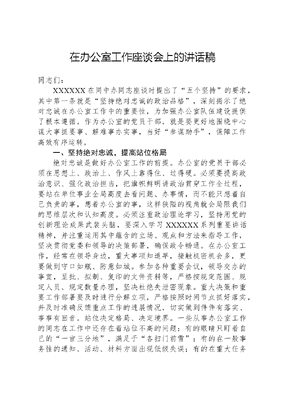 在办公室工作座谈会上的讲话稿同志们:XXXXXX在同中办同志座谈时提出了五个坚持的要求,其中第一条就是坚持绝对忠诚的政治品格,深刻揭示了绝对忠诚在办公室工作中的重要性,为加强办公室队伍建设提供了根本遵循。作为办公室的党员干部,就是要更好地围绕中心谋大事抓要事、解难事办实事,当好参谋助手,保障工作高效有序运转。一、坚持绝对忠诚,提高站位格局绝对忠诚是做好办公室工作的前提。办公室的党员干部必须在思想上、政治上、作风上靠得住、过得硬。必须要提高政治意识、强化政治担当,把旗帜鲜明讲政治贯穿工作全过程,要站在单位事业全局高度去看问题、办事情,而不能只想着自己负责的事,想着办公室的事,这样狭隘的视角就会局限我们的思维层次和认知高度。必须注重政治理论学习,坚持用党的创新理论成果武装头脑,要深入学习XXXXXX系列重要讲话精神,并注重运用其中蕴含的立场、观点和方法来指导工作,坚决贯彻党委和领导的决策部署,确保政令畅通。在办公室工作,经常在领导身边,重大事项知道早,接触机密机会多,更要做到守口如瓶、防意如城。参加各种重要会议,领导交办的事宜,呈批、拟制、复印的文件资料等,严格按规定范围、规定人员、规定数量办理,坚决杜绝失泄密现象。重大决策和重要工作部署要及时进行分解立项,严格按照时间节点抓好落实,并及时准确反馈重点工作的进展情况,切实做到件件有落实、事事有回音。站位决定格局、决定境界。一些从事办公室工作的同志在工作中还存在着站位不高的问题:有的眼睛只盯着自己的一亩三分地,满足于各扫门前雪;有的在一般事务性的通知、活动、材料方面出现低级失误;有的在重大任务面前担当不够,没有表现出应有的姿态和干劲。消除这些不良现象要提高站位,要善于站在全局的高度,把注意力集中在牵动全局、涉及长远的大事上,集中在情况复杂、矛盾突出的热点难点问题上。要弄清找准工作的着眼点,形成思考的聚焦点,把握落实的切入点。二、优化工作方法,提升服务水平办公室的每一名党员干部都要找准角色、摆正位置,厚道做人、公道行事。办公室日常工作任务十分繁重,面临着许多的困难挑战,在关键时刻都要站得出、顶得上,把该挑的担子担起来,把分内职责履行好,把交办任务完成好。在具体工作中,要多动脑筋,不要嫌麻烦,要积极主动,多制定几套方案,这样工作开展才更有效。从事办公室工作的同志因为长期严谨细致的要求,使得思路相对比较窄,固守陈规、被动执行多,主动变革、创新少。做好新形势下的办公室工作,必须要有开拓进取的闯劲和誓争一流的拼劲,把创新贯穿于办公室工作的始终,多尝试新做法、探索新方式,以更优的服务当好参谋助手,以更高的效率做好统筹协调,以更严的举措抓好督促检查,以更顺的机制搞好运行保障。要不断提高协调能力。要做到勤于汇报、善于沟通、长于联系,正确处理好与党委领导、上级机关、兄弟处室等的关系。对上讲服从,对下讲服务,对内讲团结,工作讲规范,切实把协调工作做好,把各方面关系理顺。面对服务理念、服务要求的新变化,要敢于创新、勇于实践,切实转变工作理念,拓宽工作思路,创新工作方法,不断提高服务水平。在办公室工作,不仅要办好事务,同时还要坚决维护好团结,还要牢牢把全面从严治党主体责任扛在肩上、抓在手上,种好责任田,架起高压线,扎紧铁笼子,筑牢权力制约制度防线,完善内部监督机制,强化日常管理监督,防止灯下黑,全力维护办公室的威信和形象。三、专精业务工作,不断自我提升文可居文库——海量学习资料,手机电脑均可下载www.wenkeju.com办公室是一个培养人、锻炼人、造就人的地方。在办公室工作的同志要树立靠素质立身、靠实干进步的正确导向,以本领恐慌感提升素质、淬炼能力,不仅要成为本职工作的行家里手,还要成为开口能讲、提笔能写、遇事能办、问策能对的多面手。每个人都要成为各自工作岗位上的行家里手,精通本岗位业务知识,全面了解基本情况,准确分析判断形势,涉及本人职责的有关问题都能够及时准确地回答,并提出有价值的意见和建议。对于在办公室工作的同志来说,关系沟通协调的表达能力十分重要。能讲不是夸夸其谈,而是要讲符合原则的话,讲言简意赅的话,讲务实管用的话。不能信口开河,特别是在上传下达、接待群众来访时,更要善于把握说话的技巧和分寸,避免出现说不上话、对不上话、听不懂话的现象。能写是办公室工作人员的一项基本功。每一位同志都要具备相当的文字表达能力,做到提笔能写、文能达意。必须注重培养办公室工作所需要的文字功底,注重提升文稿写作水平。作为办公室工作人员,还要处变不惊,做到沉着果断、有条不紊。要学会十个指头弹钢琴,绝不能因为事急而眉毛胡子一把抓,要善于区分轻重缓急,急事急办,特事特办,力求把每件事情都办得有章有法、有始有终。总的来说,我认为要做好办公室工作要始终牢