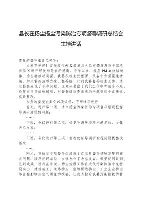 县长在扬尘扬尘污染防治专项督导调研总结会主持讲话尊敬的督导组各位领导:大家下午好!首先我代表X政府对各位市领导及市专家组莅临X进行帮扶指导表示感谢。今年以来,我县PM10持续倒排,为扭转被动局面,我县积极查找根源,从各个方面强化措施,加大管控治理力度。督导组一行到我县督导检查工作,通过检查发现了不少问题,这充分暴露了我们工作中有很多不足,还存在很多短板弱项,对督查组检查出来的问题我们全盘接收,抓紧整改。今天的座谈会共有四项议程,下面逐项进行:首先,进行第一项,请市扬尘污染防治专项督导组通报督导调研发现的问题;……下面,会议进行第二项,请督导调研涉及问题单位、乡镇表态发言;……下面,会议进行第三项,由我就督导调研发现问题提整改要求……刚才,市扬尘专项督导组通报了在我县督导调研发现的重点问题,涉及问题单位、乡镇也作了表态发言,希望说到做到、见到成效。就我县来说,扬尘治理工作在大气污染防治中也特别突出,建筑施工、道路扬尘、空地裸地扬尘、工业企业扬尘等直接影响到空气质量的改善,已成为拉升我县污染指数的首要污染物。为全面做好扬尘治理工作,下面,我讲三点意见:一、务必认清形势,切实提高扬尘治理攻坚的重要性认识扬尘治理工作成效如何,直接影响到全年我县在省市的排名,这是一场输不起的攻坚硬仗。对此,大家务必保持高度敏感、高度重视、高度负责、高度自觉,必须坚决守住目标底线、工作底线、纪律底线,全力扭转我县的不利局面。二、务必刚性管控,以更严更细的措施推进扬尘治理工作刚才,市扬尘专项督导组通报了我县共26个问题,其中建筑工地扬尘8个,城中村扬尘5个,工业企业扬尘2个,停车场扬尘9个,餐饮油烟2个;涉及X个、X个、X个、发改局4个、X个、X个、农业农村局2个、市监局1个、乡村振兴局1个、自然资源局1个、X个、X个。以上问题,涉及部门、乡镇已迅速行动,基本全部整改到位。下来,政府督查室、大气办要加大盯办力度,及时进行回头看,确保高标准落实整改。一是建筑施工扬尘问题整改方面。住建局要严管建筑施工工地落实扬尘治理八条标准。督促8个问题工项目在达到八条标准基础上,要进一步加强施工精细化管理。二是城中村扬尘问题整改方面。主要涉及到自建房及农村道路扬尘。自建房扬尘问题整改上,结合实际,落实物料全部覆盖、物料棚化、拆除工程使用雾炮湿法作业、杜绝工程占道施工、30m范围内常态化洒水保湿等五项标准。农村道路扬尘问题整改上,加大村庄道路冲洗、洒水降尘力度,严格落实每天不少于2-3次洒水冲洗要求达到洒水降尘、喷雾抑尘效果,做到路见本色,无泥沙,无积水,便道整洁无积尘。根据气象条件合理调整冲洗降尘作业次数,净化村庄道路。三是工业企业扬尘治理整改方面。生态环境分局要持续加大帮扶及监管,严格旁站式督导整改,完善排放监管制度,实现企业扬尘及无组织排放大幅度减少。四是停车场扬尘治理整改方面。规范停车场双冲洗设备,安装运输车辆侧向全覆盖式强制喷淋清洗设施,对出场车辆进行100%冲洗,确保车轮、车体洁净无浮尘。露天停车场内和文可居文库——海量学习资料,手机电脑均可下载www.wenkeju.com进出口应进行硬化,对不宜硬化的区域实施绿化。路面每天洒水、清扫不少于6次,确保路面无浮土,车辆过往不起尘。五是餐饮油烟治理整改方面。生态环境分局、市监局、住建局分片管理,严格每20天至少清洗一次油烟净化装置,并保留清洗记录,确保稳定实现三个百分百。三、多措并举,强力攻坚,确保扬尘各项管控措施落实见效一要压死压实责任。各乡镇政府,各相关职能部门要以此次督导帮扶为契机,认真履行属地责任和行业监管责任,进一步加大排查、治理和日常监管工作力度,对排查出的扬尘问题,要及时向担负治理任务的有关部门进行交办,各治理主体要限期整改到位。同时,各部门要进一步强化日常监管,完善专职督查队伍,定期向县大气办报送治理工作开展情况。县大气办负责牵总协调,要统筹做好沟通、指导、督促、反馈等各项工作。二要严格执法检查。政府督查室、县大气办在开展问题回头看的同时,要协调全县执法力量,对全县开展地毯式检查,持续完善问题清单、责任清单、整改清单和效果清单,确保整治一处,达标一处、销号一处。各乡镇和相关部门均要加大检查频次和密度,确保扬尘问题及时发现、及时整治到位。三要强化督查问责。严格按照《扬尘污染防治量化问责实施办法》落实相关工作,对工作不作为、慢作为,履职不到位,扬尘管控措施不力、治理效果不好,造成扬尘污染的,要将问责调查材料移交县纪委监委启动问责程序。同时,县大气办要安排专人负责问责情况的跟踪落实,并及时报告和公开问责情况。下面,会议进行第四项,请X讲话……同志们,刚才X讲了很好的意见,会后各部门各乡镇要及文可居文库——海量学习资料,手机电脑均可下载www.wenkeju.com
