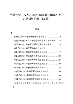 党委书记、校长在2024年春季开学典礼上的讲话材料汇编(13篇)目录1.校长在2024年春季开学典礼上的讲话22.党委书记在2024年春季学期开学典礼上的讲话53.校长在2024年春季学期开学典礼上的讲话84.校长在2024春季开学典礼上的致辞125.校长在2024年春季开学典礼上的讲话.176.校长在2024年春季开学典礼上的讲话.207.校长在2024年春季开学典礼上的讲话.248.校长在2024年春季开学典礼上的讲话.289.校长在2024年春季开学典礼上的讲话.3310.校长在2024年春季开学典礼上的讲话..3611.校长在2024年春季开学典礼上的讲话..3912.校长在2024年春季开学典礼上的讲话..4413.校长在新学期首次升旗仪式上的讲话:有所爱亦被爱48校长在2024年春季开学典礼上的讲话尊敬的各位老师、亲爱的同学们:大家上午好!玉兔送春归,金龙迎新来。短暂充实的寒假结束了,我们再次相约在美丽的xx校园。看到大家抖擞的精神、灿烂的笑脸,相信同学们一定度过了一个温馨、祥和、愉快的春节。在这里,我代表学校向全体师生致以最诚挚的祝福:祝愿大家在新的一年里平安、健康、快乐、进步!每一个晨光揭开的瞬间,都蕴含着无尽的希望与梦想。在刚刚过去的2023年里,在全校师生的共同努力下,学校荣获了全国国防教育示范校、xx省中小学德育工作示范基地、xx区2022--2023年度教学质量标兵学校等20余项荣誉;校长xx喜获全国新教育实验十佳智慧校长、第五届xx区道德模范等荣誉称号;xx等6位教师荣获省市区级教学荣誉称号。徜徉在xx这个大家庭里的同学们是幸福的,读书节、体育节、艺术节、科技周、英语节、晨诵庆典、研学旅行等丰富多彩的活动,让大家展示风采,收获成功,锻炼能力,这一年你们成长的不仅是身体,更多的是知识的积淀,能力的提升,让自己向能歌善舞、能说会写、强身健心,品学兼优、面向世界的xx娃迈进了一步。春回大地,万象更新。春天是万物复苏的季节,更是播种希望的季节。在新的学期,希望同学们博采众长,持之以恒;希望老师们言传身教,善导恒严。为此,我提出四点期望:一要勤学上进,追求卓越。你们要时刻牢记学生的天职就是学习,希望大家在xx乐学善问学风、厚德启智教风、求真创新校风熏陶下,都能扣好人生第一颗纽扣,懂得更宏大的使命担当;希望你们知新致远而不自满,在汲取新知的进程中,对知识保持渴望,对学习保持专注,自信而谦逊,全面发展的良好风貌;要掌握高效科学的学习方法,养成良好的学习习惯,不断提升自我,完善自我,超越自我。二要坚持阅读,提升素养。阅读是一种习惯,让心灵丰盈的习惯。我们在书中知过去,懂现在,明未来。当我们静下心来读书,就能感受到字里行间的意蕴,体会到人生哲理,使人能正确对待荣辱,明理得失,正确面对生活中的挫折和失落。当你处于闹市喧嚣,一句采菊东蓠下,悠然见南山就可以让你感受到自然的宁静;当你身处逆境心灰意冷时,一句天将降大任于斯人也,必先苦其心志,劳其筋骨,饿其体肤就能让你重拾信心;当你志得意满,目空一切时,一句勿以善小而不为,勿以恶小而为之就能使你警醒。三要勇敢面对,持之以恒。同学们,花有重开日,人无再少年。在学生阶段,好好学习就是一种责任、一种使命,更是一种对自己的负责。你们要知道,现在不吃学习的苦,将来就要吃生活的苦。新的学期、新的希望,新的征程已经开启,你必须学着忍耐、学着坚持、学着付出,同学们,在新的一年里,希望你们都能沉着冷静、不骄不躁、不卑不亢、不气不馁,重整旗鼓,重新出发。四要语言文明,举止优雅。同学们,文明是每个人种植幸福的结果!行动有序、行为有礼、语言文明是我们xx校园的特色。每位同学都是学校的缩影,我们要树立正确的荣辱观,从仪表整洁、不说脏话、不乱扔纸屑、不带零食入校等小事做起,做到时时讲安全,人人讲卫生,处处讲文明,让我们的xx校园井然有序、富有温度。今年,是安康市创建全国文明城市关健年,它更需要我们每个人以向上至善之精神、全力以赴之姿态,凝聚文明共识,聚力文明创建。就让我们从现在开始一起行动起来,将语言文明、行动有序、行为有礼根植于心,外化于