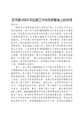 在市委2024年巡察工作动员部署会上的讲话同志们:2024年市委第X轮巡察工作即将开始。今天我们召开会议的目的就是,深入学习贯彻XXXXXX关于巡视巡察工作重要论述,贯彻落实中央和省委巡视巡察工作会议精神,动员部署市委第X轮巡察,扎实推动2024年市委巡察工作高质量发展。2023年,全市巡察工作坚持稳中求进、稳中提质,巡察力度持续加大,联动监督更加协同,利剑作用更加彰显,各项工作取得新成效。抓好2024年巡察工作,要深入学习贯彻新修订的巡视工作条例,认真贯彻落实XXXXXX关于党的自我革命的重要思想和关于巡视工作重要论述,更加突出强基固本、突出守正创新、突出提质增效,着力在加强组织领导、强化政治监督、做实后半篇文章、健全完善监督格局、推进巡察工作规范化建设上实现新突破新提升,持续推动巡察工作高质量发展。下面,我强调三点意见:第一,深入领会XXXXXX关于巡视工作重要论述,进一步增强做好巡视工作的使命感责任感。巡视巡察是党章赋予的重要职责,是全面从严治党的重要手段,是加强党内监督的战略性制度安排。要准确把握巡察职责定位,更加突出政治性和人民性,切实把为民政策落实好、把群众急难愁盼问题解决好,真正把两个维护落到基层、落到实处。全面贯彻巡视工作方针,巩固深化政治巡视,始终把两个维护作为巡察的根本任务,自觉跟进、服务、保障国之大者,重点围绕党的XX大精神、XXXXXX重要讲话指示精神贯彻落实和落实十四五规划、贯彻新发展理念等方面加强监督检查,保障党的路线方针政策和党中央重大决策部署得到贯彻落实,更好地发挥巡察利剑作用。要准确把握巡视工作方针,更加突出震慑力和穿透力,推动巡察向深拓展、向专发力、向下延伸,以精准监督纠治突出问题。要了解遵守和执行党的领导各项制度、学习领会XXX新时代中国特色社会主义思想、贯彻落实XXXXXX重要指示批示情况,了解落实意识形态工作责任制情况,注意发现四个意识四个自信不坚定、两个维护不坚决、停留在口号上,政治意识淡漠、政治纪律松弛,人民立场不牢固、忽视群众关切、损害群众利益等问题。要准确把握巡察最终目的,更加突出实效性和满意度,不断补齐各项工作短板,以扎实过硬的整改成效取信于民。面对党章赋予巡察干部的神圣职责和重要使命,必须坚持以人民利益为出发点和落脚点去思考问题、谋划工作和抓好落实,着眼于通过巡察发现和解决人民群众反对和痛恨的问题,加大整治损害群众利益的不正之风和腐败问题力度,切实增强社会效果,提升人民群众的获得感,保持党同人民群众的血肉联系。坚决克服脱离基层实际、漠视群众利益、遇到困难绕着走,解决问题走过场,发现问题怕得罪人、不敢担当、不愿担当等背离人民立场、政绩观发生偏差的问题。要深刻把握党中央对巡视工作的新部署新要求,提高政治站位、强化政治担当、把握政治巡察定位,勇担政治巡察职责,在工作中要坚定理想信念、增强能力本领,在正风反腐中彰显担当作为。第二,找准深化政治巡察方法路径,牢牢把握两个维护根本任务,准确把握巡视监督重点。坚持政治巡视定位,紧盯领导班子特别是一把手,深入查找被巡视党组织履行职能责任存在的偏差、改革发展中存在的风险隐患,落实全面从严治党战略部署、新时代党的组织路线,以及巡视、审计等各类监督检查发现问题整改和成果运用存在的突出问题,督促被巡视党组织切实把衷心拥护两个确立、忠诚践行两个维护体现在履职尽责的实际行动、具体举措和工作成效上。要紧扣中心大局,围绕经济发展、民生保障、基层治理、统筹发展安全重点工作,为推进中国式现代化高新实践提供坚强政治保障。在坚持人民至上中深刻把握巡察价值取向,着力推动落实惠民利民、安民富民政策,推动惩治群众身边的不正之风和腐败问题,推动解决人民群众急难愁盼问题,切实增强人民群众获得感、幸福感、安全感。在服务发展大局中深刻把握巡察根本目标,充分发挥巡察监督保障执行、促进完善发展作用,坚决清除阻碍发展的拦路虎绊脚石,全力以赴为我市经济社会高质量发展保驾护航。要密切联系群众,坚持依靠群众搞巡察、聚焦民意搞巡察、赢得民心搞巡察,以扎实的整改成效增强群众满意度和获得感。把人民拥护不拥护、赞成不赞成、高兴不高兴、满意不满意作为检验工作的根本评判标准。凡是群众反映强烈的都要严肃认真对待,凡是损害群众利益的行为都要坚决纠正,防止出现认为民生问题不属于政治巡察范畴的错误认识,以及对群众反映的问题选择性受理,把问题捂着盖着压着等现象。要贯通各类监督,切实提升综合监督质效,形成发现问题、推动整改、促进治理的良性循环。推动上下联动更加紧密,强化组织领导、健全制度机制、创新方式方法,构建横向全覆盖、纵向全贯通、全市一盘棋的巡察监督网络。推动监督贯通更加深入,突出机制共建、力量共用、成果共享,推动各类监督共同提升、共同增效。推动成果