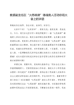 教委副主任在大思政课铸魂育人活动总结大会上的讲话尊敬的各位领导、各位专家、老师们、同学们:大家中午好!五育并举,德育为先;教育发展,思政先行。今天,我们在这里召开×财经学院第十一届大思政课铸魂育人活动总结大会,既是全面回顾总结的需要,也是着力加强改进的必要,更是深入贯彻落实关于大力推进大思政课建设的重要指示批示精神、有力提升育人实效的重要抓手和关键契机在此,我谨代表学校党委,对市委教育工委、×区教委、×历史名人馆、×区博物馆及兄弟单位长期以来的关心支持表示衷心的感谢!对为本届活动的成功举办付出辛苦努力的各位老师和同学致以诚挚的问候!举旗定向,谋篇布局。党的XX大报告作出用社会主义核心价值观铸魂育人,完善思想政治工作体系,推进大中小学思想政治教育一体化建设的重要部署,持续凸显了思政育人对培养社会主义建设者和接班人的引领作用。早在2022年7月,教育部等十部门印发了《全面推进大思政课建设工作方案》,学校党委及时跟进制定出台大思政课建设实施方案,切实推动学校思政课和思想政治工作高质量发展,不断健全党委统一领导、党政齐抓共管、部门协同配合的常态化运行机制,全力推动本届活动理念上再更新、视野上再开阔、格局上再拓展。今年4月,我们有幸与×区博物馆签约共建实践教学基地,共同开展了双师同讲寻梦法兰西大思政课活动;我们联合×区教委、×教师进修学院共同申报了×市思政课大中小学一体化试点共同体;我们牵头×区中小学开展了同课异构、同上一堂思政课活动;筑梦未来大思政铸魂育人实践平台入选2023年×市高校一校一社一品学生社团思想政治类项目品牌、×市高校大思政课优秀案例二等奖。这些成绩的取得,是学校20余年来育人积淀与守正创新的有机融合。不忘初心,方得始终。一直以来,学校始终坚定立德树人主任务、坚守思政育人主战场、坚持教学改革主渠道,探索形成了思政课、校园活动、社会实践三个课堂联动及课程思政协同推进的育人模式,学校思政课教学改革获市委副书记李明清批示。学校先后获批市级手拉手共建思政课×区和×区五所高校牵头单位、×市大中小学思政课一体化共同体建设试点单位、三下乡国家级优秀单位,思政课获批为市级一流课程,教师获×市高校辅导员素质能力大赛本科组三等奖×市高校优秀思想政治教育工作者、获批2023年度教育部人文社会科学研究高校辅导员研究项目。同时持续推动深化三全育人改革,今年,一站式学生社区建设获市教委人文社科项目立项,学生评价改革成果《三路径深化学生奖励荣誉体系改革,强化示范引领育人效果》获市级二等奖,育人根基稳步夯实、成效持续显现、成果不断突破。铸魂育人,笃定前行。在今年5月中共中央政治局第五次集体学习时就加快教育强国建设时强调,要坚持不懈用新时代中国特色社会主义思想铸魂育人。在此,我对学校持续推进大思政课建设提出三点意见。一要加强思政课程与课程思政的有机融合,同向同行、同频共振,全面加强教学能力建设,以小话题讲好大理论,以小故事讲活大道理,以小视角讲透大主题,强基铸魂,润物无声。二要加强守正创新与系统观念的辩证统一,强化问题意识、突出实践导向,创新方式方法,充分挖掘利用社会力量和资源,建设大课堂、搭建大平台、建好大师资,推动学校大思政课建设再上台阶。三要加强经验总结与特色挖掘的迭代升级,全面梳理总结历届活动开展情况,系统性、连续性、前瞻性思考谋划下一届活动,着力挖掘特色,形成品牌。云程发韧,未来可期。对广大青年寄予厚望,强调新时代的中国青年,生逢其时、重任在肩,施展才干的舞台无比广阔,实现梦想的前景无比光明。借此机会,我向广大同学提出三点希望。一是锚定留取丹心照汗青的信念坐标。始终牢记的嘱托,自觉加强党的创新理论学习,认真参加全校青年学生正在开展的学习贯彻新时代中国特色社会主义思想主题教育,坚定理想信念,自觉践行社会主义核心价值观,永远听党话、跟党走,矢志奉献国家和人民。二是锚定吾将上下而求索的学习坐标。腹有诗书气自华。善于学习是青年的最大优势,也是最紧要之事也是同学们现阶段的本职和主要任务。大家要认真完成好学习任务,更要积极适应时代进步和社会发展,不断沉淀、持续精进。三是锚定积硅步以至千里的奋斗坐标。奋斗是青春最亮的底色。同学们要珍惜时代机遇,制定自己的职业及人生规划,以绰厉奋发、笃行不怠的精神风貌,意志风发地奋进新征程、建功新时代,努力实现自己的梦想。再次感谢各位领导、各位专家的莅临指导!祝大家工作顺利身体健康!提前顺祝大家新年快乐!谢谢!本文档编辑密码:gwsx2024