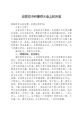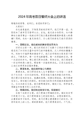 2024年高考百日誓师大会上的讲话尊敬的校领导、老师们,亲爱的同学们:大家好!在这春意盎然、万物复苏的美好时节,我们齐聚一堂,共同迎来了高考百日誓师大会。首先,我代表全体同学,向辛勤耕耘在教育事业一线的老师们致以最崇高的敬意和最衷心的感谢!同时,也向一直支持我们、关心我们的家长们表示深深的谢意。一、回顾过去,我们成长的脚步坚实而有力回首过去的一年,我们共同经历了无数个日夜的辛勤付出感受到了知识的力量和老师们的辛勤教诲。从入学时的懵懂少年,到如今怀揣梦想的青春学子,我们在学校的大家庭里不断成长、不断进步。每一次考试的磨砺,每一次课堂的互动,每一次活动的参与,都让我们更加成熟、更加自信。我们感谢每一位老师的悉心教导,感谢每一次挫折的洗礼,正是这些经历,让我们变得更加坚强和勇敢。二、展望未来,我们满怀信心与期待展望未来,我们即将迎来人生中重要的一次考验——高考这不仅仅是一次知识的检验,更是对我们意志和毅力的考验。我们要以坚定的信念、饱满的热情,迎接这场挑战。我们要相信自己,相信我们的团队,相信我们的努力终将换来辉煌的明天。在未来的百日里,我们要明确目标、制定计划、科学备考,用勤奋和智慧书写人生的华章。三、明确目标,我们制定科学计划,砥砺前行在接下来的百日里,我们要确立明确的目标,制定切实可行的复习计划。我们要根据自己的实际情况,合理安排时间,注重提高学习效率。同时,我们还要注重调整自己的状态,保持积极向上的心态。遇到困难时,我们要勇敢面对,不气馁、不放弃;取得进步时,我们要谦虚谨慎,不骄傲、不自满。我们要珍惜每一天的时间,把握每一分每一秒的机会,让每一刻都充满意义与价值。此外,我们还要加强团队协作,共同进步。在备考的过程中,我们要学会分享自己的学习方法与经验,帮助他人解决困难与问题。同时,我们也要善于向他人请教,虚心听取他人的建议与意见。我们要相信团队的力量,相信集体的智慧,让我们在彼此的鼓励与支持中,不断超越自我、实现自我。四、全力以赴,我们创造属于自己的辉煌未来的百日,我们将全身心地投入到备考中,不畏艰难,不惧挑战。我们要以更加饱满的热情,更加坚定的信念,去迎接每一个挑战,去创造属于我们的辉煌。我们要用我们的汗水和智慧,去书写属于我们的精彩篇章。在这个过程中,我们要学会调整自己的心态,保持平和、乐观的情绪。遇到困难时,我们要敢于面对,勇于克服;取得进步时,我们要保持谦虚,继续努力。我们要相信自己的实力与潜力,相信我们的努力终将换来辉煌的未来。同时,我们还要注重培养自己的综合素质。高考不仅是一次知识的检验,更是对我们综合素质的考察。我们要在备考的过程中,不断提升自己的思维能力、创新能力、实践能力等,为未来的学习和生活打下坚实的基础。五、感恩前行,我们不忘初心,砥砺前行在这个特殊的时刻,我们要感恩所有陪伴我们成长的人。感谢老师的辛勤付出和无私奉献,他们用智慧和爱心点亮了我们前进的道路;感谢家长的默默支持和无私奉献,他们用关爱和陪伴温暖了我们的心灵;感谢同学们的相互鼓励和共同进步,我们在彼此的支持中不断成长。正是有了他们的陪伴和支持,我们才能走到今天。在未来的日子里,我们要心怀感激,不忘初心,继续前行。最后,我想说的是:高考虽然重要,但它并不是我们人生的全部。无论高考成绩如何,我们都要保持积极向上的心态,继续努力追求自己的梦想。只要我们坚持不懈、勇往直前,就一定能够创造出更加美好的未来。同学们,让我们携手并进、共同奋斗,用我们的青春和激情书写属于我们的精彩篇章!让我们以更加坚定的步伐迎接未来的挑战与机遇!让我们以更加辉煌的成就证明自己的实力与价值!在此,我代表全体同学向各位老师、家长和同学们发出倡议:让我们在接下来的百日里,以更加饱满的热情、更加坚定的信念、更加扎实的行动,共同迎接高考的挑战,共同创造属于我们的辉煌!同时,我也希望我们每一位同学都能够珍惜这段宝贵的时光,不仅要在知识上不断充实自己,更要在品德修养、人际交往、社会实践等方面全面提升自己。我们要以积极向上的态度面对生活中的每一个挑战和机遇,用我们的实际行动去践行爱国、进步、文明、健康的校训精神。最后,让我们再次共同宣誓:在未来的百日里,我们将全力以赴、砥砺前行,以优异的成绩回报老师、家长的期望和信任,为实现自己的人生目标而努力奋斗!谢谢大家!
