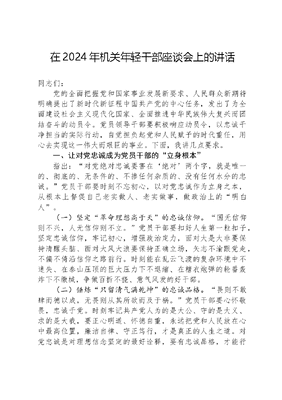 在2024年机关年轻干部座谈会上的讲话同志们:党的全面把握党和国家事业发展新要求、人民群众新期待明确提出了新时代新征程中国共产党的中心任务,发出了为全面建设社会主义现代化国家、全面推进中华民族伟大复兴而团结奋斗的动员令。党员领导干部要积极响应动员令,以忠诚干净担当的实际行动,自觉担负起党和人民赋予的时代重任,用心去实现这一伟大而艰巨的事业。下面,我讲几点要求。一、让对党忠诚成为党员干部的立身根本指出:对党绝对忠诚要害在绝对两个字,就是唯一的、彻底的、无条件的、不掺任何杂质的、没有任何水分的忠诚。党员干部要时刻不忘初心,以对党忠诚作为立身之本,从根本上督促自己老实做人、老实做事,做政治上的明白人。(一)坚定革命理想高于天的忠诚信仰。国无信仰则不兴,人无信仰则不立。党员干部要扣好人生第一粒扣子,坚定忠诚信仰,牢记初心,增强政治定力,面对大是大非要保持清醒头脑、面对大风大浪要保持正确立场,矢志不渝跟党走,不偏不倚沿信仰之路前行。时刻能在乱云飞渡的复杂环境中不迷失、在泰山压顶的巨大压力下不退缩、在糖衣炮弹的轮番轰炸下不缴械,争做百折不挠、意气风发的好干部。(二)锤炼只留清气满乾坤的忠诚品格。畏则不敢肆而德以成,无畏则从其所欲而及于祸。党员干部要心怀敬畏,忠诚于党。时刻牢记共产党人为的是大公、守的是大义、求的是大我,要正心明道、怀德自重,永远把党和人民放在心中最高位置,廉洁自律、守正笃行,才是真正的人生之道。对党忠诚是对理想信念坚定的最好诠释,要有忠诚品格,才能行稳致远。(三)践行俯首甘为孺子牛的忠诚理念。民生无小事,枝叶总关情。坚持全心全意为人民服务的根本宗旨,深刻展现了我们党坚持人民至上的政治底色,彰显了共产党人的责任担当,体现了我们党发展为了人民的最终目的。时代是出卷人,人民是阅卷人。年轻干部要答好时代之问,就要忠诚于人民,常怀时时放心不下,始终同人民群众保持血肉联系,察真情、说实话,出真招、办实事,下苦功、求实效,始终保持赶考姿态,交出一份让人民满意的时代答卷。二、让干净自律成为党员干部的指路明灯指出:一个人能否廉洁自律,最大的诱惑是自己,最难战胜的敌人也是自己。一些党员干部之所以蜕化变质甚至走上违法犯罪的道路,直接原因是自己没有守住廉洁从政关。党员干部要做到慎言、慎行、慎权、慎独、慎微、慎友,要倡导高尚正派、恬淡健康的生活方式,时刻防止贪欲缠身人情腐败权力寻租和温水煮青蛙陷阱,切实管住嘴、管住手、管住脚,筑起防线、抗拒诱惑。(一)把住政治上的红线,坚定理想信念,严守政治纪律,保持清醒的政治头脑。当官不发财、发财不当官,党员干部要明白既然选择这个崇高职业,就要做到为党分忧、为国奉献、为民造福。要始终保持如履薄冰、如临深渊的自觉,让自律成为一种习惯、一种本能、一种常态。要遵守党纪国法,树立拒腐防变意识,算好政治账、经济账、亲情账。要突出政治建设,严守政治纪律,始终保持清醒头脑和政治定力。(二)把住工作上的准线,坚持按法规政策用权,谨防以权谋私,锤炼坚强党性。要不断强化党性修为,树立正确的权力观、政绩观、事业观,深刻领悟权为民所赋、权为民所用的道理。要时刻牢记初心使命,常怀敬畏之心、感恩之心。要加强理论学习,树立终身学习理念,用党的创新理论武装头脑。要加强案例学习,坚持以案为鉴、以案促改、以案明纪,深刻剖析自己,真正做到心有所畏、言有所戒、行有所止。(三)把住生活上的底线,纯洁人际交往,培养健康情趣,始终做到清清白白做人。要树立底线思维,洁身自好,培养良好的生活情操。要摒弃不良生活习气,自觉净化工作圈、朋友圈、生活圈,做到择善而交,多交益友、良友。要时刻保持清醒,杜绝侥幸心理,莫让一杯酒、一顿饭害了自己。要建立清亲政商关系,自觉切断个人私利与企业之间的联系,做到心无旁骛、廉洁奉公、一心为民。三、让务实担当成为党员干部的标准配置疾风知劲草,板荡识诚臣。如果精神懈怠,不思进取只会贻误了处理矛盾的最佳时机,使矛盾不断积累甚至激化,最后酿成大祸。当前,世界正处于百年未有之大变局,面对复杂形势、艰巨任务,不稳定性、不确定性因素交加,迫切需要广大党员干部保持定力,抢抓机遇,勇于担起时代重任,以时不我待、只争朝夕的精神,涉险滩、攻堡垒,于危机中育先机、于变局中开新局。(一)法字当头善作为。要从思想上固本培元,坚定理想信念,提高党性觉悟。要增强廉洁自律意识,保持头脑清醒,以法纪为纲,严格执行领导干部廉洁从政若干规定,用党纪国法严格约束自己,守住信念防线、道德防线、纪法防线,不能心存侥幸、肆意妄为。要自觉做到讲政治、讲正气,敢于批评和抵制不正之风,坚决同各种腐败现象作斗争。在生活中也要严格要求自己,把洁身自好、严于律己作为一种生活习惯、一种价值