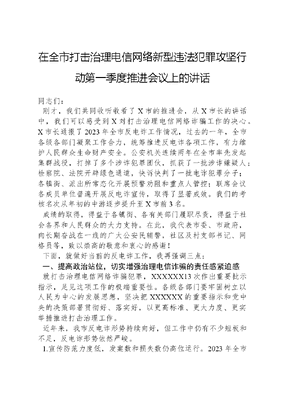 在全市打击治理电信网络新型违法犯罪攻坚行动第一季度推进会议上的讲话同志们:刚才,我们共同收听收看了X市的推进会,从X市长的讲话中,我们可以感受到X对打击治理电信网络诈骗工作的决心。X市长通报了2023年全市反电诈工作情况,过去的一年,全市各级各部门凝聚工作合力,统筹推进反电诈各项工作,有力维护人民群众生命财产安全。公安机关连续两年在全市率先发起集群战役,打掉了多个涉诈犯罪团伙,抓获了一批涉诈嫌疑人;检察院、法院开辟绿色通道,快诉快判了一批电诈犯罪分子;各镇街、派出所常态化开展预警劝阻和重点人管控;联席会议各成员单位普遍开展反电诈宣传,取得了显著成效。我们的考核名次从年初的中游逐步提升至X市前3名。成绩的取得,得益于各镇街、各有关部门履职尽责,得益于社会各界和人民群众的大力支持。在此,我代表市委、市政府,向长期奋战在一线的广大公安民辅警,社区及村支部书记、网格员等,致以崇高的敬意和衷心的感谢!下面,就做好当前的反电诈工作,我再强调三点:一、提高政治站位,切实增强治理电信诈骗的责任感紧迫感就打击治理电信网络诈骗犯罪,XXXXXX13次作出重要批示指示,足见这项工作的极端重要性。各级各部门要牢固树立以人民为中心的发展思想,坚决把XXXXXX的重要指示和党中央的决策部署贯彻好、落实好,以更高标准、更大力度、更实举措推进打击治理工作。近年来,我市反电诈形势持续向好,但工作中仍有不少短板和不足,反电诈形势依然严峻。1.宣传防范力度低,发案数和损失数仍高位运行。2023年全市发案同比上升104%,损失同比上升106%。去年年底,我市X街道、X街道因发案数和损失数较高,还被X市挂牌。近期,又连续发生了多起虚假投资理财、虚假网络贷款的大额被骗案件。2.源头治理力度低,涉案两卡线索数仍居高不下。在现有的涉案两卡线索中,80%的存量卡、20%的新开卡被作为犯罪工具使用。涉案银行卡最多的开卡行是农业银行、邮政储蓄银行、建设银行、农村信用社,涉案电话卡最多的运营商是移动公司和联通公司。说明部分金融单位、通信运营商对电诈犯罪的危害性认识不足,行业管理还存在漏洞,还需有效整治。3.预警劝阻力度低,未形成上下联动齐抓共管的局面。去年我市召开多次会议,要求建立民警+村两委干部+网格员的专门劝阻队伍和派出所唤醒室,但目前仍是公安一家单打独斗。2023年共开展预警劝阻工作21万余次,平均每个派出所每天要开展预警劝阻工作40余次,无法确保及时见上面、劝得住。4.基础不牢靠,关键指标在省里排名落后。从省联席办发布的2023年12月份情况通报看,在资金预警劝阻、涉案两卡线索、涉诈重点人员管控、触网预警劝阻指标上,我市在全省排名较为落后,连续两个月被确定为问题突出重点县市区,主要是涉案两卡线索数多、触网预警后被骗率高两方面。为此,去年7月,我市已被省里通报,并在8月初X市的推进会上做了表态发言。如果再不扭转被动局面,将会被约谈甚至挂牌。对于以上问题,务必要高度重视,采取有力措施加以整改。二、狠抓打击治理,切实提升治理电信诈骗效能各镇街、各有关部门要突出工作重点,围绕防范、打击、监管等3个关键环节,采取有力措施,实现抓人数、起诉数、技术拦截封堵数三升,涉案两卡数、预警劝阻后被骗率、预后被骗损失金额三降的三升三降目标。(一)坚持以打促防,保持严打态势。一要及时调整打击策略。要参照侦办黑恶犯罪模式严打电诈犯罪,对50万元以上大案,严格落实三定五清要求,综合运用提级侦办、指定管辖等措施,立足境内打回流。二要聚力整治黑灰产业。要持续发起区域会战和集群战役,严厉打击黑灰产犯罪,对刷单、杀猪盘、冒充客服等高发类案件,市公安局要牵头开展集中研判,摸清窝点分布,全链条纵深打击。三要坚持依法从严惩治。要健全检法机关提前介入、会商研究等机制,公检法要统一执法思想,加大指导力度,提高办案质量。对缅北押回人员,要加强研判会商。四要更加注重追赃挽损。要同步强化破案追赃,全面查封、扣押、冻结犯罪团伙的非法资产,最大程度追缴非法所得。(二)坚持防范宣传,增强防护体系。一要做实宣传教育和警示提醒。宣传、融媒体、文旅等部门要加大社会面宣传教育,营造全社会反诈的浓厚氛围。财政、民政、市场监管、共青团、妇联、工会等部门要加强对会计、老年人、家庭妇女等易被骗人群的专门培训和宣传教育,及时发布案例警示提醒。各部门单位要加强内部教育防范,履行好对从业人员、用户等进行反诈教育和风险提示的职责。二要做优精准预警和精确劝阻。要充分利用大数据、人工智能等技术手段,精准发现潜在受害群众。要健全完善预警劝阻工作机制,用好民警+村两委干部+网格员的常态化劝阻队伍,筑牢最后一道防线。各通信运营商要建立和推广反诈名片、反诈彩铃,主动提醒涉诈来话和短信。银行业金融机构要精准识别可疑交易,及时阻断涉诈资金转移。