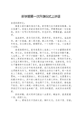 新学期第一次升旗仪式上讲话亲爱的同学们:随着五星红旗的冉冉升起,新学期已拉开崭新的帷幕。站在国旗下,我有太多的话想给同学们说,但最想说的一句话就是,抓住一切可以利用的时间,补充知识,积蓄能量,备战高考。备战高考,是你们的天职,职责所系,使命所在。备战高考,高一打基础,高二是关键,高三抓冲刺,一备备三年。三年时光,如白驹过隙,转瞬即逝。一寸光阴一寸金,寸金难买寸光阴。亲爱的同学们,高考将是你人生路上一个十分重要的里程碑,跨过去,你将登顶辉煌,跨不过去,很可能会伴随平庸。人生路上,苦一阵子才能甜一辈子,我希望我的每一位学生,都过上更好的幸福生活,发挥更大的社会价值。等到苦尽甘来,山河星月都作贺礼。不要在最该奋斗的年龄,选择安逸。你们在不懂事的年纪选择了享乐,就会在懂事的年纪承担后果。通过近几次全市统考成绩看,我们比其他名校还差得很远必须做笨鸟先飞,弯道超车。刚刚过去的这个春节,有一条消息上了热搜,小品演员、电影明星、电影《热辣滚烫》的导演贾玲,一个身材肥胖的人,通过狂减瘦了100斤,这需要多大的毅力和恒心,其中的心酸付出并不为旁人所知。贾玲的逆袭告诉我们,你不想改变,谁也帮不了你,你决定改变,谁也挡不住你。每个人都是一部励志传奇。我们不能左右生命的长度,但我们可以追求生命的广度,你努力的程度,决定你未来的宽度。新的学期,我对同学们提出十点要求,概括讲,就是把握十度,把控人生。第一,要有志在千里的大度。胸怀大志,志在千里。目前,你们所处的年龄,心智没有成熟,人生没有定型。不论立下多高远的志向,并为之付出努力,就能实现怎样的人生。大鹏一日同风起,扶摇直上九万里。第二,要有心系家国的气度。新中国从站起来到富起来,再到强起来,你们生活在上下五千年中国最好的时期,历史从未像现在这样,现代化的强国梦如此之近,2035年我们将基本实现社会主义现代化,到本世纪中叶,我们将建成富强、民主、文明、和谐、美丽的社会主义现代化强国。同学们可以想一想,2035年你们有多大?2050年你们又会在哪里?只有学习,只有努力学习,才不会辜负这个伟大的时代,才不会辜负你们幸福的人生。我希望同学们要通过成就自己精彩的人生,为祖国的强大,中国梦的实现贡献力量。第三,要有持之以恒的力度。三天打渔,两天晒网,是学习的大忌,贵有恒何必三更起五更睡,最无益只怕一日曝十日寒。锲而舍之,朽木不折,锲而不舍,金石可镂。必须秉持恒心、韧劲和耐力,才能日积月累,久久为功。第四,要有奋力提升的速度。高中三年,时间很短,高三的同学更能深深体会到这一点。因为我们有差距,必须奋力提升;因为我差得很多,所以必须加快提升的速度,大步快跑,快马加鞭,争取在有限的时间里缩短与别人的差距,直至赶上他们,超越别人。第五,要有积跬累细的厚度。不积跬步,无以至千里;不积细流,无以成江海。我们要把零碎分散的时间能用尽用。欧阳修在《归田录》中写到,坐则读经史,卧则读小说,上厕则阅小辞。我们的同学们也要充分利用饭桌上、厕所里、跑操前等零碎时间大量阅读,记单词、记公式、记错题,增加知识的储备,累积知识的厚度。厚积而薄发,厚德而载物。第六,要有追逐梦想的高度。我们每个人都有自己的梦想,作为高中生,就应该有自己的大学梦。每名同学要根据自己的成绩和自己的努力,确立理想院校,盯住目标高校,追逐梦想,扬帆起航。在许多人的实践中,因为有了目标,所以有了动力,就能达到理想的高度,就能实现自己的目标。希望同学们,所得皆所愿,在目标的驱使下,都能如愿以偿,成功上岸。多年以后,你会感谢今天奋斗的自己。第七,要有探疑解惑的深度。课堂上要有刨根问底的精神,纠错本要展示更爱真理的品质,每一次考试要体现一往无前的作风。成功的秘诀就在于脚踏实地,肯下笨功夫。向下扎根,才能向上结果,弄懂弄通,才能事半功倍。自身状况要分析,薄弱环节要补强,错题纠正要落实,掌握深度,才有精度,精益求精,才能成功。第八,要有培优补差的强度。我们学校头小尾大的现象十分明显,600分以上学生人数少,680分左右的高分生更是少之又少,但上不了本科、分数极低、走单招也很困难的学生却大有人在,培优补差的任务迫在眉睫,抓两头带中间的战略必须全面实施。我们邀请到北京一家教育机构对尖子生进行培优,又采取了多种措施对学困生进行补差。成绩领先的同学,要把目标调得更高,盯住名校,增加做题难度,提高学习强度,加快提升的进度。成绩暂不理想的同学,更要找准自己的短板和弱项,付出更多的时间和精力,一步一个脚印,争取绝地反击,逆风翻盘。第九,要有治学用心的浓度。人能创设环境,环境也能造就人,在一个有浓厚学习气氛的环境里,每个人都能得到良好的净化和洗礼。这就要求我们的同学们都要遵守纪律,认真学习,入班及静,入座即学,两耳不闻窗外事,一心只读圣贤书,共同营造浓厚的学习氛围。第十,要有团结友爱的温度。春节前后