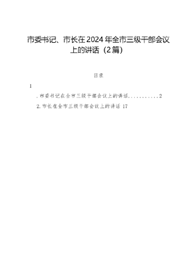 市委书记、市长在2024年全市三级干部会议上的讲话(2篇)目录1.市委书记在全市三级干部会议上的讲话..22.市长在全市三级干部会议上的讲话17市委书记在全市三级干部会议上的讲话同志们:一年一度的三级干部会议,对每一名xx干部来讲,都具有特殊而又重要的意义。xxxx年,是中华人民共和国成立xx周年,是实现十四五规划目标任务的关键一年。对xx而言,更是站位全局、立足当下、着眼未来谱新篇的一年;是弘扬精神、大抓产业、拼搏实干开新局的一年;是凝心聚力、锐意进取、奋勇争先建新功的一年。春节前,我们以市委全会的形式,对今后一段时期的发展思路、奋斗目标和方法措施进行了研究部署。今天我以弘扬精神聚合力,振兴产业拼实干,奋力开启高质量建设现代化中等城市新征程为题,讲五方面意见:一、笃行实干,稳中有进交新卷刚刚过去的xxxx年,我们方向很坚定,步伐很稳健,过得很踏实。面对复杂的外部环境和艰巨的发展任务,全市上下深入贯彻党的XXX精神和XXXXXX视察xx重要讲话精神,扎实开展学习贯彻XXX新时代中国特色社会主义思想主题教育,锚定两个确保,深入实施十大战略百条举措,大力弘扬xx精神,以拼经济十大攻坚战为抓手,在控风险、稳运行的基础上,立足补短板、强弱项,着力打基础、利长远,谋划了xx个重点实施项目和xx个前期工作项目,计划总投资xxx亿元,大抓工业、大兴产业成为共识。建立了重点项目x+x周推进、高质量发展月例会、周六安全隐患排查常态化等一系列工作机制,抓重抓要抓细形成常态长效。获得了全国制造业百强县、国家县域旅游综合竞争力百强县、国家乡村治理示范县,入选全国乡村振兴示范县、全省乡村建设示范县创建单位,被推荐为全省唯一创建全国法治政府建设县级综合示范区。特别是经过不懈努力,xx城际铁路被列为全省近期建设项目,百万xx人民期盼已久的高铁梦正在走进现实。xxxx年,全市GDP增长x.x%,一般公共预算收入突破xx亿元,工业投资实现两位数增长,建筑企业总数突破xxxx家,接待游客超过xxxx万人次。xx市xx精神奖考核中,xx在上半年综合排名第一的基础上,全年有望再夺第一。成绩来之不易,每一名党员干部都要珍惜、呵护全市上下同心同向干事创业良好局面,进一步坚定发展信心,自觉融入发展大潮,自觉扛起发展重任,共同把xx的各项工作推向前进。同志们,艰难方显勇毅,磨砺始得玉成。回首过去一年,每一个拼搏的日子都闪闪发光,每一段难忘的记忆都温润人心,每一位奋斗者都值得点赞!成绩的取得,根本在于XXXXXX作为党中央的核心、全党的核心掌舵领航,在于XXX新时代中国特色社会主义思想的科学指引,离不开历届市委打下的坚实基础,离不开广大党员干部的共同努力,更离不开xxx万xx儿女的团结拼搏和社会各界的关心支持。在此,谨向大家致以崇高的敬意和衷心的感谢!二、明晰形势,以进促稳抢新机当前和今后一个时期,我市发展仍然处于重要战略机遇期但危机并存、危中有机、危可转机。要保持战略清醒,坚定战略自信,主动识变应变求变,加快铺就面向现代化的出彩之路。一要精准把握机遇。抢抓机遇、赢得美好未来,错失机遇落后一个时代。xxxx年xx月xx日,XXXXXX亲临xx视察,对大力传承弘扬xx精神作出重要指示,为我们留下了宝贵精神财富,带来了千载难逢的发展机遇。省委支持xx建设中等城市,xx市委明确要求xx当好排头兵,交给了我们沉甸甸的考卷,也为xx发展搭建了广阔平台。国债增发等系列政策出台,高铁通行的美好预期,更为我市乘势而上创造了更多条件。我们一定要牢记嘱托、感恩奋进,抢抓机遇加快发展。二要客观分析形势。人无远虑,必有近忧。我们在xx市的领跑地位并不牢固,在全省面临的竞争形势更为严峻。xx和xx基础相似,但从xxxx年财政收入来看,xx比xx多x亿元,税占比高出xxx.x个百分点,总量和质量上我们都落后于人。巩义xxxx年GDP增长x%,总量首破千亿,我们的差距正在被拉大。经开区高新技术企业数量不到全国开发区平均数的一半,进出口总额仅为平均值的十分之一,开放创新水平亟待提升。我们一定要居危思进、奋起直追,全力以赴加快发展。三要永葆竞进姿态。取法乎上,得乎其中;取法乎中,得乎其下。自古以来,xx人血液里流淌着争先和拼搏的精神,xx的历史就是干的历史,就是艰苦奋斗的历史,就是创先争优的历史,正是这种秉性和气势才让xx始终走在了省市发展前列。群众要求标准高、盼望期望高,不发展不行,发展慢了也不行,发展不好更不行。一代人有一代人的使命,一个阶段有一个阶段的主题。我们一定要不负群众、不辱使命,拉高标杆加快发展。察势者智,驭势者赢。xx加快发展,上级有重托,群众有期盼,我们有目标,必须守正创新,坚持稳中求进、以进促稳、先立后破,不断赢得优势、赢得主动、赢得未