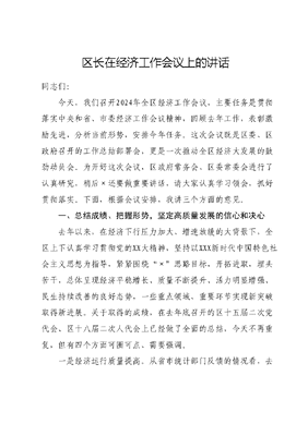 区长在经济工作会议上的讲话同志们:今天,我们召开2024年全区经济工作会议,主要任务是贯彻落实中央和省、市委经济工作会议精神,回顾去年工作,表彰激励先进,分析当前形势,安排今年任务。这次会议既是区委、区政府召开的工作总结部署会,更是一次推动全区经济大发展的鼓劲动员会。为开好这次会议,区政府常务会、区委常委会进行了认真研究,稍后×还要做重要讲话,请大家认真学习领会,抓好贯彻落实。下面,根据会议安排,我讲三个方面的意见。一、总结成绩、把握形势,坚定高质量发展的信心和决心去年以来,在经济下行压力加大、增速放缓的大背景下,全区上下认真学习贯彻党的XX大精神,坚持以XXX新时代中国特色社会主义思想为指导,紧紧围绕×思路目标,开拓进取,埋头苦干,总体呈现经济平稳增长、质量不断提升、活力明显增强、民生持续改善的良好态势,一些重点领域、重要环节实现新突破取得新进展。关于取得的成绩,在去年底召开的区十五届二次党代会、区十八届二次人代会上已经做了全面的总结,今天不再重复,但有四个方面可圈可点、需要强调。一是经济运行质量提高。从省市统计部门反馈的情况看,去年市上下达的11项主要经济指标中,有9项增速排名全市前三,其中,财政总收入、城镇居民人均可支配收入、社会消费品零售总额和地区生产总值4项指标增速排第一,二产增加值排第二,三产增加值、固定资产投资、公共预算财政收入和招商引资到位资金4项指标排第三。另外,市政府高质量发展考核的42个单项指标中有22项排全市第一,6项排第二,7项排第三,全市前三的就有35项,占到83%。主要经济指标逆势稳健增长,各领域单项考核获得全面丰收,特别是财政收支持续大幅增长,既为经济社会发展提供了强大的财力支撑,也充分说明全区经济正在向高质量发展转变,取得这样成绩实属难能可贵。二是产业转型明显加快。一产上,全省戈壁农业建设现场会在我区召开,发展戈壁农业的做法在全省推广,戈壁农业成为现代农业的新名片;二产上,成功争取到新能源微电网和增量配电业务2个全国全省试点示范项目,为实现富裕电力就地消纳和项目落地奠定了坚实基础;三产上,万达广场等一批项目建成运营,城市文化旅游综合体、三大专业市场、物流配送中心等一批项目落地建设,湿地景观大道建成通车,湿地景区方案通过专家评审商贸物流节点城市建设形成新格局,文化旅游呈现多层次、宽领域的深度融合。三是城乡面貌大幅改观。以建好城市提升人民生活品质为目标,先后实施了道路建设、园林绿化、安居改造、四供保障和功能配套五大类城建重点工程,解决了一批多年没有解决的难题。特别是对热电联供一级管网进行了优化改造,二级管网进行了有效整合,安全隐患得到消除,供热质量明显提升。新组建了中石油昆仑燃气公司,遗留近十年的供气矛盾基本解决,城区燃气覆盖面达到95%。扎实开展农村环境综合整治,深入开展全域无垃圾专项治理行动,千方百计筹集资金5.9亿元,实施了20类258个项目,农村面貌焕然一新。尤其在××的大力协调下,全区新建改建农村公路368公里,完成农村公路生命安全防护工程216公里,投资达到5.8亿元,这是近些年没有过的。四是发展成果更加惠民。坚持民生优先、共建共享,民生普惠政策全面落实,社会保障待遇标准不断提高,物价形势总体稳定,城乡居民人均可支配收入增长分别快于经济增长8个和7个百分点,人民生活质量显著提升。政府承诺的教育、文化、卫生等十大民生工程十件惠民实事有效落实,用于民生的支出占到财政总支出的80%以上,民生福祉持续提升。同时,强化安全生产责任落实,安全生产四项指标全面下降。深化平安创建活动,深入开展矛盾纠纷排查化解、严打整治、破案会战和重点领域安全隐患清零等专项行动,人民群众安全感和幸福感不断提高。在充分肯定成绩的同时,我们也要清醒地认识到,我区经济社会发展仍然面临一些突出困难和问题。一是经济增长压力较大去年我区生产总值增速为6.8%,虽高于全市3.5个百分点,但分别低于全省(3.6%)、全国(6.9%)1.1个百分点和4.4个百分点,为历年来最低水平。工业经济持续下降,第三产业增速回落(去年仅增长3.8%),稳增长、调结构的任务十分艰巨。二是项目投资后劲不足。去年全区新开工500万元以上项目125个,较上年减少386个,完成投资89.5亿元,同比下降62.3%,仅完成任务的69%,加之招商项目落地不足,房地产投资放缓,投资拉动作用明显减弱。如果今年再没有更多的大项目作支撑,保持经济平稳增长将是一句空话。三是产业发展水平不高。农业上,三大主导产业虽形成了一定规模,但标准化、品牌化程度不高;工业上虽然传统企业效益有所好转,但规上工业发展仍然困难,特别是风电装备制造企业生产形势持续低迷,产值同比下降28%,支撑作用明显减弱;三产服务业上,市场体系还不完备,文化旅游深度挖掘不够,缺乏大项目的拉动,融合