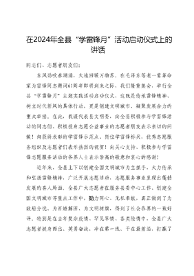 在2024年全县学雷锋月活动启动仪式上的讲话同志们、志愿者朋友们:东风劲吹春潮涌,大地回暖万物苏。在毛泽东等老一辈革命家为雷锋同志题词61周年即将到来之际,我们隆重集会,举行全县学雷锋月主题实践活动启动仪式,这既是传承雷锋精神、树立时代新风的具体行动,更是创建文明城市、凝聚发展合力的重大举措。在此,我谨代表县文明委,向全县积极参与学雷锋活动的同志们、积极投身志愿公益事业的志愿者朋友表示亲切的问候!向获得表彰的学雷锋示范点、岗位学雷锋标兵,优秀志愿服务组织及志愿者们表示热烈的祝贺!向关心支持、积极参与学雷锋志愿服务活动的各界人士表示崇高的敬意和衷心的感谢!近年来,全县上下以创建全国文明城市为主抓手,大力传承和弘扬雷锋精神,广泛开展志愿活动,志愿服务事业呈现出蓬勃发展的喜人局面。全县广大志愿者在服务县委中心工作、创建全国文明城市等重点工作中,力同心、无私奉献,真正做到了为勠政府分忧、为百姓解困、为文明树旗,得到了社会各界的一致好评。特别是在去年复杂疫情、罕见旱情、各类险情中,全县广大志愿者挺身而出、英勇奋战,冲在第一线、干在最前沿,打赢了一场场阻击战围剿战清零战,构筑起了一道靓丽的红色防线,谱写了一曲曲动人的奉献赞歌。今年,是我县创建全国文明城市决胜之年。全县上下要以学雷锋月主题实践活动为契机,主动践行雷锋精神,广泛开展志愿服务,让志愿服务成为广大市民的一种自觉行动,切实为创建文明城市、推进X高质量发展凝聚强大合力。我们要做大宣传,推动学雷锋志愿精神焕发生机。要以纪念毛泽东等老一辈革命家为雷锋同志题词60周年为契机,创新宣传载体,丰富宣传形式,利用微信、网络、新闻媒体、公益广告、知识讲座、发放宣传册等多种形式,开展专题纪念活动,全面阐释雷锋精神时代内涵,引导激励更多党员、干部、群众把学雷锋志愿服务活动融入日常、化作经常,让雷锋精神在新时代绽放更加璀璨的光芒。我们要做活载体,推动学雷锋志愿活动常态长效。各级志愿服务组织和广大志愿者要聚焦为党分忧解愁、为人民群众办事解难这个根本任务,不断拓宽服务领域,提升服务效能,推进文明创建、扶老救孤、恤病助残等领域志愿服务走深走实。各类志愿服务组织要发挥优势、各展所长,打造项目精品,形成品牌效应促进全县志愿服务在空间上向大街小巷延伸、在内容上向大事小情拓展,让温情爱心洒遍京海每个角落。我们要做优机制,推动学雷锋志愿队伍持续壮大。要整合联系各类资源,通过集中培训、赛事选拔等多种途径,持续壮大志愿者队伍,切实提高志愿者覆盖率和活跃度,逐步建成一支数量充足、素质优良、结构合理、服务专业、富有特色的志愿者队伍要高度重视志愿者队伍建设,全面推行志愿服务记录制度,建立健全志愿者礼遇优待机制,加快营造人人争做志愿者,人人崇尚志愿者的社会氛围,让志愿红成为城市最亮丽的风景线同志们,信仰之光永不磨灭,雷锋精神代代相传。让我们向志愿者致敬,与雷锋精神同行,把学雷锋志愿服务作为每个人的生活方式、生活习惯,让志愿者成为我们大家共同的名字,让雷锋精神在X绽放更加璀璨的光芒,为加快推进我县高质量跨越式发展作出新的更大贡献!下面,我宣布:纪念毛泽东等老一辈革命家为雷锋同志题词61周年暨学雷锋月主题实践活动启动!本文密:档编辑码gwsx2024