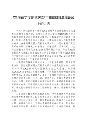 XX局在学习贯彻2023年主题教育总结会议上的讲话今天,我们召开学习贯彻XXX新时代中国特色社会主义思想主题教育总结大会,主要任务是深入学习XXXXXX关于主题教育的重要讲话和重要指示精神,认真落实中央和省委、市委、区委主题教育总结会议精神,全面总结我局主题教育取得的成效,安排部署巩固主题教育成果工作,动员和激励广大党员干部持续以学铸魂、以学增智、以学正风、以学促干,切实将主题教育成果转化为推动xx发展的强大动力,为实现xx作出新的更大贡献。刚才我们传达学习了全区学习贯彻XXX新时代中国特色社会主义思想主题教育总结会议精神,局主题教育办作了总结报告,下面我讲几点意见:一要坚持不懈强化理论武装。主题教育有期限,理论学习无穷期。要把巩固拓展主题教育成果作为重大政治任务,持续深入学习XXX新时代中国特色社会主义思想,特别是XXXXXX关于xx工作重要论述,不断提高运用党的创新理论指导实践、推动工作的能力。要进一步创新方式方法,通过党组理论学习中心组、三会一课、党员大会、干部大讲堂等多种形式,加强对党的创新理论的学习和研究,深刻领会其精神实质和科学内涵,不断提高政治觉悟和理论水平。要坚持学以致用,将党的创新理论与实际工作相结合,推动工作不断取得新成效。二要坚持不懈抓好问题整改落实。对于主题教育中查摆出的未整改完成的问题,以及民主生活会、组织生活会自查发现问题、相互批评意见,逐一制定整改措施,明确责任人和完成时限,确保整改到位,让群众看到实实在在的变化。针对群众反映强烈的问题,要常态化开展调查研究,找准问题根源,制定切实可行的整改方案。局主题教育办要加强督促检查,确保整改工作取得实效,不断推动主题教育走深走实。三要坚持不懈强化责任担当。主题教育归根结底是要落实到行动上的。要以深入推进干部绩效考核为抓手,紧盯区委xx届xx次全会暨区委经济工作会议指引的方向,紧扣2024年区委、区政府中心重点工作、全年公开承诺、年度目标任务,立足保护资源、保障发展两统一职责,持续攻坚克难、奋勇争先,一如既往做好乡村振兴、耕地保护、项目用地保障、地质灾害防治、生态保护修复、不动产登记、执法监察、创文创卫巩固提升等工作,让XXX新时代中国特色社会主义思想在xx系统落地生根、开花结果。四要坚持不懈深化作风建设。要进一步巩固提升干部作风能力提升年活动成果,在抓落实上狠下功夫。对待上级部门或领导交办的事项,要以时不待我的紧迫感、马上就办的责任心、舍我其谁的使命感,迅速推进落实;对待一些疑难问题、历史遗留问题、人民群众反映强烈的问题,多想怎么办、少说不能办,多想马上办、少说以后办,多想我来办、少说你们办。坚决摈弃门难进、脸难看、话难听、事难办的不良习气。对群众身边的腐败和作风问题,发现一起、整治一起。要始终以群众满不满意、上级认不认可、履职到不到位作为检验工作成效的试金石、刻度尺。五要坚持不懈推进从严治党。各单位、支部,要常态化开展干部纪律教育,组织干部深入学习XXXXXX关于作风建设重要论述和《中国共产党廉洁自律准则》及新修订的《中国共产党纪律处分条例》等相关内容,不断提高党员干部遵规守纪的思想自觉、行动自觉。全体党员干部要牢固树立正确的世界观、人生观、价值观、权力观、地位观和利益观,时刻保持警钟长鸣,时刻保持头脑清醒,不断提高自身的思想觉悟和道德水准,筑牢廉洁自律的思想防线。同志们,虽然第二批主题教育已经进入收官阶段,但收官并不意味着结束。相反,我们要以此次主题教育为新的起点,坚定不移地推进党的建设和各项工作,为推动xx事业高质量发展而不懈奋斗。