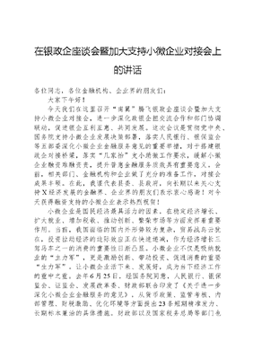 在银政企座谈会暨加大支持小微企业对接会上的讲话各位同志,各位金融机构、企业界的朋友们:大家下午好!今天我们在这里召开南翼腾飞银政企座谈会暨加大支持小微企业对接会,进一步深化政银企担交流合作和部门协调联动,促进银企互利互惠、共同发展。这次会议是贯彻党中央、国务院支持小微企业发展决策部署,落实人民银行、银保监会等五部委深化小微企业金融服务意见的重要举措,对于搭建银政企对接桥梁,落实几家抬支小助微工作要求,缓解小微企业融资难融资贵,提升普惠金融服务质效具有重要意义。会前,相关部门、金融机构和企业做了充分的准备工作,对接会成果丰硕。在此,我谨代表县委、县政府,向长期以来关心支持X经济发展的金融界、企业界的朋友们表示衷心感谢!对今天获得融资支持的小微企业表示热烈祝贺!小微企业是国民经济最具活力的因素,在稳定经济增长、扩大就业、增加税收、推动创新、繁荣市场等方面发挥着重要作用。当前,我国面临的国内外形势较为复杂,贸易战乌云犹在,投资拉动经济的边际效应正在快速递减,作为经济增长三驾马车之一的消费的重要性日渐凸显。小微企业不仅是吸纳就业的主力军,更是激励创新、带动投资、促进消费的重要生力军。让小微企业活下来、发展好,成为当下经济工作的重中之重。去年6月25日,经国务院同意,人民银行、银保监会、证监会、发展改革委、财政部联合印发了《关于进一步深化小微企业金融服务的意见》,从货币政策、监管考核、内部管理、财税激励、优化环境等方面提出23条短期精准发力、长期标本兼治的具体措施。财政部以及国家税务总局等部门也相继出台了一系列税费减免政策和融资贴息政策,着力减轻小微企业负担。省上对财政金融互动政策进行了修改完善,将政策内容从22条扩充至34条,财金互动的小微企业惠及面有望进一步扩大。这些政策举措,为小微企业转型升级、做优做强提供了难得机遇。近年来,我县高度重视小微企业发展,先后出台实施了财税金融支持、就业创业扶持和工商登记改革等系列帮扶措施,取得了积极成效。目前,县政府正在组织财政、金融等部门研究对接省、市财金互动和直接融资政策的相关配套措施,旨在进一步增强支持小微企业融资政策合力。县委十三届六次全会提出加快建设X奋斗目标,这既离不开我县大企业大集团的发展助力,更离不开众多小微企业的突出贡献。在市场化经济的今天,判断一个地区经济有没有活力、发展不发展,往往表现为小微企业的发展活跃程度。小微企业的成活率要高、成长率要快,就少不了各方的有力支持。各级各部门务必要从战略和全局的高度,深刻认识支持小微企业发展壮大的重大意义,进一步深化认识、主动作为,努力为小微企业持续健康发展提供专业化、精准化、特色化、创新性的服务。广大小微企业更要认清形势,抢抓机遇,切实发挥好小微企业在稳增长、调结构、促创业、保就业等方面的生力军作用。一是政府部门要大力引导、强化保障。一要营造良好营商环境。相关部门要持续推进社会信用体系建设,建立联合激励和惩戒机制,严厉打击金融欺诈、恶意逃废债、弄虚作假、骗贷骗补等违法违规行为,提升市场主体诚信意识,为金融支持小微企业发展营造良好环境。二要强化部门协调联动。经济综合部门和金融管理部门要通力配合,进一步完善信息沟通共享机制、定期协调机制和企业融资指导机制,夯实工作合力推进基础。三要用好用足支持政策。人行要进一步加大支小支农再贷款运用,引导金融机构创新金融产品和服务,切实加大小微企业贷款投放力度。银监办要按照《关于进一步深化小微企业金融服务的意见》要求,加强小微企业贷款和投向监测考核,适当提高小微企业的不良贷款考核容忍度,进一步清理不必要的通道和过桥环节,规范收费内容,降低小微企业融资成本。财政、税务部门要落实好财政奖补、税收优惠减免政策。金融办要加强政策宣传,提高小微企业对相关支持政策的知晓度。科技工信局要落实好小微企业专利权首次质押融资贴息政策。保险机构要积极推动小微企业信用保证保险,探索推广政银保融资模式。二是金融机构要持续发力、勇于创新。一要实现支持对象精准。金融机构要下沉服务重心,在小、微二字上下足功夫,深入实施万家千亿小微企业金融服务提升工程,真正做到支小助微。二要努力扩大信贷服务。要合理确定贷款期限,适度提高中长期贷款比例和不良率容忍度,切实加大小微企业信贷投放力度,努力扩大小微企业信贷支持覆盖面。三要加强信贷产品创新。重点围绕小微企业尤其是科技型小微企业轻资产特点开发新型信贷产品,大力开展应收账款抵押贷款、知识产权质押贷款、科创·税e贷等新型信贷产品。四要提升信贷服务质量。要积极探索扩大抵质押物范围,创新信贷担保形式,梳理优化小微企业授信流程,清理不必要的资金通道和过桥环节,提高审批效率,切实增强贷款可得性。三是小微企业要拓宽思路、苦练内功。一要主动沟通,加强对接。广大小微企业要认真研