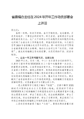 省委编办主任在2024年开年工作动员部署会上讲话同志们:春种一粒粟,秋收万担粮。春天万物竞发,龙马精神,正是开局起步、干事创业的好时节。昨天省委、省政府召开全省高质量发展大会,在广大干部群众中引起强烈反响和强烈共鸣,也吹响了全省龙年工作乘胜而进、乘胜向前的号角。今天我们召开2024年省委编办机关开年动员会,第一时间传达学习贯彻全省高质量发展大会精神,推动全办各项工作走在前、开新局,激发机构编制工作向高而攀、向实而进的干劲、闯劲与韧劲。一、过去一年工作可圈可点、出彩出色2023年以来,各处(局、中心)在办室务会议的领导下,认真学习宣传贯彻XXXXXX在二十届中央编委第一次会议上的重要讲话精神,认真贯彻落实党中央、中央编委决策部署以及省委工作要求,围绕主题教育、机构改革组织实施等重点任务,主动将机构编制工作融入党和政府事业发展的大棋局中,切实找准机构编制工作在中心工作、重点任务中的定位,真正做到了省委省政府中心工作推进到哪里,机构编制工作就服务保障到哪里。这里着重点评3项最出彩工作。一是主题教育学习展现了编办深度。坚持不懈用XXX新时代中国特色社会主义思想凝心铸魂,把深刻学习领会XXXXXX关于机构编制工作的重要论述作为主题教育重中之重,突出原原本本学、学出了高度认同,突出追根溯源学、学出了绝对忠诚,突出创新载体学、学出了过硬本领,真正做到了以学的正来确保机构编制工作始终沿着正确方向坚定前行。二是攻坚破难彰显了编办力度。聚焦机构改革重大部署以及全省重点工作和重大民生事项深入开展调查研究,认真践行深、实、细、准、效五字诀,坚持把调研作为谋事之基、成事之道,发扬理论联系实际的优良学风,精准选题、大胆破题、务实答题,实现了机构改革与调查研究的双向奔赴、互为支撑。特别是,在全省机构改革动员会、机构编制委员会等多个场合,省委省政府主要领导同志均对我们的工作提出了表扬,认为省委编办对机构改革及机构编制重点工作任务谋得深、虑得全、察得实、联得密、干的好,并鼓励我们发扬好深谋争优、敢为争先、实干争效的工作作风,以深化机构改革为工作抓手,着力破解体制机制难题,优化机构编制资源配置,推动新时代机构编制工作高质量发展。我们要不负嘱托、戒骄戒躁、再接再厉,持续深化省直部门机构改革任务,统筹好市县乡机构改革节奏,协调推进机构编制各项重点工作任务,不断为全省发展大局贡献机构编制智慧与力量。三是惠民利民传递了编办温度。大家都知道,很多老百姓关注的热点难点问题,比如上学难、就医难,这些问题背后都与体制机制密切相关。为此,我们树牢为民造福的政绩观,部署开展了高品质生活服务保障年活动,努力创造机构编制民生品牌,确保老百姓需求在哪里,机构编制资源就投向哪里。比如,我们组织开展了公办中小学教职工结构性缺编问题研究,探索人员编制动态调整机制。印发《省属公办普通高校人员控制总量管理办法机构编制操作细则(试行)》,测算并核定省属高校人员总量,有效破解高校编制紧缺问题,为提升高校教学质量奠定基础。调整部分省属医院人员编制结构,持续优化医疗资源布局,着力提升医疗保障水平。建立省创新实验室编制池,切实保障引才用编需求。这些事都是机构编制为民谋利的具体体现,也极大的拓展了机构编制工作空间、拓宽了机构编制资源普惠度、提升了机构编制资源价值。下一步,我们要坚持以人民为中心工作立场,树立鲜明基层导向,始终把解决基层和人民群众关心的突出问题作为工作的出发点和立足点,精准有效的把宝贵的机构编制资源投放到事业发展的主战场、关键点,投放到关系民生福祉、强基固本的薄弱环节。二、谋划今年工作要走深走准、求真求实2024年是中华人民共和国成立75周年,是实现十四五规划目标任务的关键一年,也是省、市、县、乡四级机构改革落地生根的攻坚之年。之前,全国编办主任会议也对今年工作作出了部署安排,我们要以XXX新时代中国特色社会主义思想为指导,将中央编委第二次会议、全国编办主任会议、全省高质量发展大会、全省机构改革动员会一体学习、一体推进、一体落实。机构编制部门是编委办事机构,首要的责任是要为省委、省委编委当好参谋助手,对机构改革、体制机制创新、编制资源统筹使用等工作参到点子上谋到关键处。这里着重强调5个方面。一要提高站位、把准方向,突出政治性。紧扣机构编制部门作为党的工作机关、政治机关的定位,牢牢把握机构编制工作正确方向,立足机构编制部门职责,充分发挥服务保障作用,确保机构编制工作始终紧扣党中央决策部署和省委工作要求。二要统筹谋划、突出重点,体现系统性。强化系统观念,准确把握主责主业,加强前瞻性思考和全局性谋划,突出体制机制改革、优化资源配置、严格规范管理等工作重点,切实增强工作的针对性、系统性和整体性。三要找准问题、补齐短板,体现主动性。全面总结已经完成和正在推进
