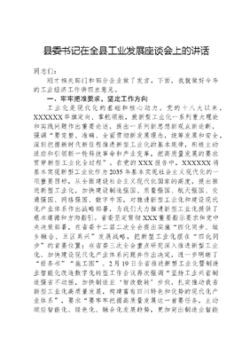 县委书记在全县工业发展座谈会上的讲话同志们:刚才相关部门和部分企业做了发言。下面,我就做好今年的工业经济工作讲四点意见。一、牢牢把准要求,坚定工作方向工业化是现代化的基础和核心动力。党的十八大以来,XXXXXX举旗定向、掌舵领航,就新型工业化一系列重大理论和实践问题作出重要论述,提出一系列新思想新观点新论断,强调要完整、准确、全面贯彻新发展理念,统筹发展和安全,深刻把握新时代新征程推进新型工业化的基本规律,积极主动适应和引领新一轮科技革命和产业变革,把高质量发展的要求贯穿新型工业化全过程。在党的XXX报告中,XXXXXX将基本实现新型工业化作为2035年基本实现社会主义现代化的一项重要目标,从全面建设社会主义现代化国家的高度,提出推进新型工业化,加快建设制造强国、质量强国、航天强国、交通强国、网络强国、数字中国,对推进新型工业化和建设现代化产业体系作出战略部署,为我们大力推进新型工业化提供了根本遵循和方向指引。省委坚定贯彻XXX重要指示要求和党中央决策部署,在省委十二届二次全会提出实施四化同步、城乡融合、五区共兴发展战略,把新型工业化摆在四化同步的首要位置;在省委三次全会重点研究深入推进新型工业化、加快建设现代化产业体系问题并作出决定,进一步明晰了任务书施工图。2月19日全省推进新型工业化暨制造业智能化改造数字化转型工作会议再次强调坚持工业兴省制造强省不动摇,加快制造业智改数转步伐,扎实推动我省新型工业化高质量发展,构建富有四川特色和优势的现代化产业体系,要求要牢牢把握高质量发展这一首要任务,主动顺应智能化、绿色化、融合化发展趋势,更加突出制造业智能化改造数字化转型,统筹推进传统产业焕新、新兴产业壮大、未来产业培育,坚决挺起经济大省的工业硬脊梁,努力为抢占未来发展制高点、推动高质量发展提供强有力支撑。这些指示要求,为我们大力推进新型工业化、推动工业经济提质增效明确了目标方向和具体要求。全县各镇各部门要深入贯彻XXXXXX关于新型工业化的重要论述,再提高政治站位,再凝聚思想共识,再保持强工业的战略定力,以更大的决心、更大的力度,坚定落实中央、省委、州委部署要求,坚定不移地实施工业强县战略,全力以赴推动全县工业转型升级,提质增效,助推县域经济高质量发展。二、把握机遇挑战,坚定工作决心近年来,全县始终坚持绿色发展理念,坚定不移的实施强工业战略,积极培育壮大清洁能源、电石、工业硅三大支柱产业,有力推动工业快速发展,初步形成绿色环保、低碳节能、循环利用生态工业体系。但面对高质量发展要求,全县区位优势、资源优势尚未完全转化成为经济发展优势、工业经济发展质量不高的基本现状依然未实现根本转变,全县工业发展困难与前景同在,挑战和机遇并存。从困难来看:全县大部分工业企业处于粗放型发展阶段,产业链处于来料加工初级发展阶段,缺少龙头企业和链主企业带动,规模总量偏小,初级产品多、产业链条短,,产品科技含量、市场附加值不高,结构性、素质性矛盾依然比较突出,并且缺乏高精尖优特新、新能源、新材料等大型工业项目支撑,发展后劲不足。从挑战来看:县域工业经济主要依靠传统的水电业、高载能制造工业带动,受产业政策、市场环境影响的冲击较大。加之国内经济增长下行压力和物价上涨压力并存,能源紧张、煤电矛盾、资金瓶颈、土地制约等影响工业经济发展的主要因素没有根本改变,工业经济面临着保持经济增长和加大节能减排双重压力。特别是各兄弟县(市)加快发展的意识越来越强,相互较劲的氛围越来越浓,都在想方设法发掘潜能、扩大优势、加快发展,势必对资金、项目、政策争夺更加激烈。从潜力来看:近几年,全县抢抓机遇,积极承接产业转移,招商引进了一大批企业和工业项目,随着一批骨干企业技改扩能项目实施,随着一批专精特新的小巨人和创业计划企业的发展壮大,将进一步推动工业经济总量在现有的产能基础上,实现成倍增长,全县工业经济的发展潜能将大为增强。从优势来看:随着技改项目深入推进、产业融合项目深度发展,全县工业产业链条在不断延伸,产业配套能力在明显增强,上下游产品在显著增多,一批优势产业渐成集群之势。尤其是重大交通项目开通运行,全县交通区位优势更加凸显,将在更大范围内促进全县资源要素配置,降低企业生产成本,为全县工业经济发展、工业产品的流通创造了便利条件。全县各镇各部门各企业务必要辩证看待全县工业经济发展现状,善于从眼前的危机和挑战中创造机遇,把差距和压力转化为强烈的危机意识和积极的拼搏状态,采取超常规举措,付出超常规努力,认清差距和短板,找准发力方向,不断发展新模式、新业态、新技术、新产品,一步一个脚印把各项工作部署付诸行动、见之于成效,奋力推进工业经济高质量发展。三、瞄准重点关键,坚定抓好落实要进一步强化工业的战略主导作用,坚持改造提