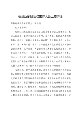 在企业家日活动主体大会上的讲话尊敬的各位企业家朋友,同志们:大家上午好!在XXXXXX在民营企业座谈会上发表重要讲话五周年之际,在这大地流金、喜迎丰收的深秋时节,我们齐聚×新能源汽车项目基地,举办以致敬企业家共×都市圈为主题的首个×企业家日暨×商×行活动,以一座历史文化名城的名义向全市企业家致敬。从今天起,×企业家有了属于自己的法定节日,传奇大美×又迎来了一个新的城市盛典。在此,我谨代表×市委、市人大、市政府、市政协,向×企业家日的设立表示热烈的祝贺!向广大企业家朋友致以亲切的节日问候!向长期以来关心支持×发展的广大×商和各方企业家表示衷心的感谢!长期以来,党中央高度重视、亲切关怀民营经济和民营企业家,XXXXXX多次就民营经济发表重要讲话、作出重要指示,强调民营经济是我国经济制度的内在要素,民营企业和民营企业家是我们自己人,要引导民营企业和民营企业家正确理解党中央方针政策,增强信心、轻装上阵、大胆发展,实现民营经济健康发展高质量发展。×月×日,XXXXXX在致中华全国工商业联合会成立×周年贺信中强调,要大力弘扬企业家精神,争做爱国敬业、守法经营、创新创业、回报社会的典范,为全面建设社会主义现代化国家、全面推进中华民族伟大复兴贡献力量。×以人大决定的形式设立×企业家日,是深入贯彻落实XXXXXX关于民营经济系列重要讲话精神的具体体现,目的就是要大力弘扬企业家精神营造尊商重商亲商的浓厚氛围,构建开放公平、优质高效的营商环境,更好发挥企业家的主动性和创造性,助力全市民营经济创造活力充分迸发,加快×都市圈高质量发展。刚才,我们怀着喜悦的心情走过荣誉通道,观看专题片,共同感受时代的风采、荣誉的力量;×市长作了热情洋溢的致辞;×总经理作了精彩致辞,对×汽车产业和营商环境给予高度评价对做大做强汽车×基地表明了鲜明态度和坚强决心;省工商联党蓁主席作了重要致辞,对×工作给予充分肯定,对×民营经济发展和工商联工作充满期待;会议通报表扬了×年全市突出贡献企业和优秀企业家,相信全市企业家都会以你们为荣、向你们看齐踔厉奋发、争先创优,希望你们戒骄戒躁、再鼓干劲,再加力度再创佳绩;×分别从不忘初心、实业报国,赤子之心、桑梓之情忠厚传家、创新当先等×个角度,精要分享了他们创新创业的励志感人故事,×一家分享全家创业的动人事迹和真情实感,充分展现了他们及×企业家的精神风貌和时代风采,让人感动、催人奋进。广大企业家积极弘扬企业家精神,争做爱国敬业、守法经营、创新创业、回报社会的典范,用实际行动回应了XXXXXX对民营经济人士的殷殷嘱托。让我们一起为企业家点赞!向奋斗者致敬!近年来,在党中央及省委、省政府的坚强领导下,在广大企业家的大力支持下,×认真学习贯彻XXX新时代中国特色社会主义思想,一丝不苟落实XXXXXX关于×工作的重要讲话和指示批示精神以及党中央的决策部署,聚焦聚力×都市圈高质量发展,以新发展理念重塑发展方式,持续推动质量变革、效率变革、动力变革,经济社会发展稳中有进、进中向好。全市经济总量连续跨越×亿元、×亿元、×亿元三大台阶,去年达到×亿元,晋位至全国城市第×强、中部六省非省会城市第一位。今年前三季度,实现地区生产总值×亿元、居全省第二。×先后被党中央、国务院确定为中部地区重点城市、×流域中心城市和重点支持的省域副中心城市,形成了以汽车及新能源汽车产业为龙头,装备制造、农产品加工产业为支柱,新能源智能网联汽车和储能电池产业为主攻方向,一二三产业融合发展的现代化产业体系,×的政治生态、产业生态和营商环境越来越好,已经成为备受国内外战略投资者、长三角珠三角环渤海地区企业家、海内外高层次创新创业人才和团队青睐的发展热土、投资福地、创业乐园。民营经济是一座城市的活力所在,蓬勃发展的民营经济能为城市注入强劲动力。×高度重视民营经济发展,坚定不移把两个毫不动摇三个没有变落到实处,高规格召开民营经济发展大会,全力营造一流营商环境,顶格落实惠企政策,积极构建亲清新型政商关系,大力开展为企业跑订单、跑贷款、解难题、清欠款工作,组织推动企业产销对接,帮助企业排忧解难,提振民营企业发展信心,不断激发民营经济发展活力,推动民营经济与城市同成长、共进步,民营经济实现了从草根经济到半壁江山的华丽蝶变。今年上半年,全市民营市场主体达到×万户,民营经济实现增加值×亿元,占全市地区生产总值的比重达到×%。现有国家级、省级专精特新小巨人企业×家,其中民营企业×家,民营经济成为我市经济增长的生力军、科技创新的主引擎、吸纳就业的主渠道。可以说,×发展的每一步都饱含着民营企业的辛苦和贡献!×能够取得今天的发展成就,广大民营企业家功不可没!民企有力量,×商有担当。一直以来,广大×商及民营企业家在市场大潮中栉风沐雨、披荆斩棘,走遍千山万水,想尽千方百计