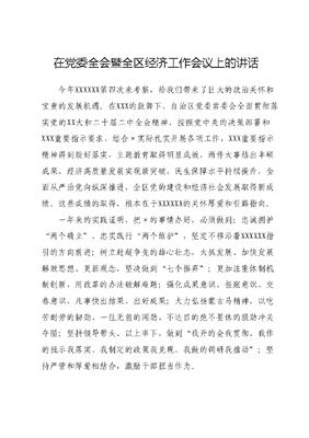 在党委全会暨全区经济工作会议上的讲话今年XXXXXX第四次来考察,给我们带来了巨大的政治关怀和宝贵的发展机遇。在XXX的鼓舞下,自治区党委常委会全面贯彻落实党的XX大和二十届二中全会精神,按照党中央的决策部署和XXX重要指示要求,结合×实际扎实开展各项工作,XXX重要指示精神得到较好落实,主题教育取得明显成效,两件大事结出丰硕成果,经济高质量发展实现新突破,民生保障水平持续提升,全面从严治党向纵深推进,全区党的建设和经济社会发展取得新成绩。这些成绩的取得,根本在于XXXXXX的关怀厚爱和引路指向。一年来的实践证明,把×的事情办好,必须做到:忠诚拥护两个确立、忠实践行两个维护,坚定不移沿着XXXXXX指引的方向前进;树立赶超争先的雄心壮志,大抓发展、加快发展解放思想、更新观念,坚决做到七个摒弃;更加注重体制机制创新,用改革的办法破解难题;强化成果意识、报账意识、交卷意识,凡事快出结果、出好成果;大力弘扬蒙古马精神,以吃苦耐劳的韧劲、一往无前的闯劲、不达目的绝不罢休的狠劲冲关夺隘;坚持领导带头、以上率下,做到我开的会我贯彻、我作的批示我落实、我制定的政策我兑现、我做的调研我推动;坚持严管和厚爱相结合,激励干部担当作为。同时,我们也清醒地看到工作中的问题和不足。享有的多重政策支持还没有得到充分转化落实,营商环境还有不少令人诟病的地方,科技创新的瓶颈制约仍然突出,解决酒肉穿肠过问题成效不明显,社会信心不足、预期偏弱,消费、收入、人口外流趋势没有得到有效扭转,地方债务、中小金融机构风险交织,资源浪费现象依然存在。有的干部政治意识不强,思想观念封闭保守,干劲闯劲不足,作风慢粗虚,不愿静下心来研究政策思考对策、解决问题。对此,我们要高度重视、认真解决。×的工作,大的方向XXXXXX早就给我们指明了,总体思路自治区党委也已明确,我们要做的就是甩开膀子,大踏步地一往无前。因应形势变化,创新工作举措,更加富有成效地推进各项事业发展。明年,我们要以XXX新时代中国特色社会主义思想为指导全面贯彻落实党的XX大和二十届二中全会精神,深入贯彻XXXXXX对×的重要指示精神,认真贯彻中央经济工作会议精神,坚持稳中求进工作总基调,以党建为引领,以铸牢中华民族共同体意识为主线,全力办好两件大事,凝心聚力闯新路、进中游,踔厉奋发、勇毅前行,不断书写中国式现代化的×新篇章。全面贯彻党中央各项决策部署和XXX重要指示精神,要结合×实际,统筹抓好经济建设、政治建设、文化建设、社会建设、生态文明建设和党的建设,哪一方面的工作都不能落下。自治区党委十一届四次、五次、六次全会以及重点工作推进会等,已经对相关工作作出安排部署,要继续抓好落实。12月21日至22日中央政治局召开专题民主生活会。落实XXXXXX在会上发表的重要讲话要建立长效机制,不断巩固拓展主题教育成果。持续用力学习贯彻XXX新时代中国特色社会主义思想,教育引导党员干部融会贯通把握科学体系、核心要义、实践要求,提高思想理论水平,以思想上的高度一致保证在政治上行动上同以XXX同志为核心的党中央保持高度一致。认真贯彻民主集中制,保证决策时充分发扬民主执行时行动坚决、步调一致。始终保持高度的政治敏锐性,努力增强各项工作的预见性和前瞻性。树牢造福人民的政绩观,始终做到为了人民干事业、创政绩。坚持团结奋斗,推动广大党员干部群众心往一处想、劲往一处使。密切联系群众,坚决纠治形形色色的形式主义、官僚主义问题。勇于自我革命,努力营造风清气正的良好政治生态。元旦后,我们还将紧跟中央纪委全会召开自治区纪委全会,对全面从严治党工作作出进一步安排。学习党中央改进文风会风的做法,本着能讲短话讲短话的原则,对之前已经讲过、近期还将部署的工作我就不多讲了,这里着重强调两个问题。一、切实把铸牢中华民族共同体意识这条主线全面贯彻到各项工作中今年6月份XXX在我区考察时首次提出铸牢中华民族共同体意识是民族地区各项工作的主线,我们一定要作为重大政治任务抓好落实。党中央明确规定,中央和地方各级人大机关、行政机关、政协机关、监察机关、审判机关、检察机关本质上都是政治机关,旗帜鲜明讲政治是应尽之责。全区各级各类机关无论负责哪个领域、承担什么职责,都要牢记政治机关的第一属性,不折不扣贯彻落实党中央决策部署和XXX重要指示要求,有形有感有效地把铸牢共同体意识这条主线贯彻到各项工作中。完成好这项政治任务,首先要明确职责。对各项工作贯彻铸牢共同体意识主线由各级党委办公厅(室)负责统筹协调,重点做好审核把关、决策研究、督促落实和党内法规备案审查等工作对民族工作贯彻铸牢共同体意识主线由各级党委统战部门负责统筹协调,具体抓好相关政策研究和重大事项推动。各部门单位要把贯彻铸牢共同体意识主线纳入三定规定,融入主责主业,制定年度工作计划和要点要