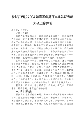 校长在我校2024年春季学期开学典礼暨表彰大会上的讲话老师们,同学们:大家上午好!喜庆的春节悄然而去,崭新的课本页页翻开,朗朗的书声已经响起,我们又回到了智慧的课堂,开启了新的学习生活。寂静了一个月的校园,因为你们的到来又充满了朝气和生机。今天我们在这里集会,隆重举行X高2024年春季开学典礼及表彰大会,又恰逢三八国际劳动妇女节来临之际,我代表校党总支和校委会成员向全体女教职工、全体女同学们致以节日祝贺,向全体师生致以新学期诚挚的祝福。祝老师们工作顺利,教有所获。祝同学们在新的一年里学习进步,健康成长!在刚刚过去的一学期,全体师生心往一处想、劲往一处使积极开展学规范、强管理、促提升纪律强化月活动和环境卫生大清洁、大整治、大提升活动;发扬弯腰精神;倡导三净(桌面净、地面净、墙面净)和三齐(桌凳摆放齐、卫生工具摆放齐、物品摆放齐);鼓励读书眼到、口到、心到、手到,大声激情;严格要求入班即静、入静即学,熄灯息声;着力提升学生自主学习能力、思维能力,提高课堂学习效率。教育教学井然有序,教学质量稳步提升。新学期,新目标,踏上新征程;新起点,新气象,开启新希望。新的学期,希望我们倍加珍惜:一、请珍惜时光紧张的学习生活已经开始,每一个同学都要有新的计划和目标,要把全部精力投入到学习上来。勤奋学习,善于思考,养成爱读书、读好书、善读书的良好习惯,多学知识,多学本领,求真理,悟道理,明事理。提高自身观察问题、解决问题的能力。二、请珍惜自己同学们,有两样东西丧失之后我们才会发现它的珍贵,那就是健康和青春。古希腊哲学家亚里士多德曾说:健康的身体是灵魂的客厅,病弱的身体则是灵魂的监狱。在新的学期里,同学们要树立健康第一的理念,认真上好体育课和课间操。在体育锻炼中享受乐趣,增强体质,完善人格,锤炼意志。在运动中感受快乐,体验成功的喜悦,为未来的挑战做好充分的准备。三、请珍惜你身边的人大千世界,我们能走进二高,是一种缘分,要学会彼此珍惜。珍惜师生情、同学情、朋友情,对学校要有亲情感、亲近感、共同感。从别人那里得到了,要心存感激,常思回报。希望你们心中有榜样,向他们学习、向他们看齐,努力成长为有理想、有文化、有道德、有作为的新时代建设者和接班人。四、请珍惜你内心的愿景要坚守自己的理想和梦想,不人云亦云、心浮气躁;要坚定信心,保持定力,充满活力,勇于奋斗。发扬雷锋精神,把学雷锋活动融入日常,化为平常:发扬弯腰精神,捡起垃圾丢进垃圾筒里,你就是爱清洁的人;热心帮助困难同学,你就是有爱心的人;珍惜时光,勤奋学习,你就是拼搏进取的人;见到师长问好,尊老爱幼,你就是懂礼貌的人;承担责任,践行人生承诺,你就是幸福的人。时时、事事严格要求自己,不以善小而不为,你就是当代的雷锋!最后,我想以一句名言结束我的发言:教育不仅是注满一桶水,而且是点燃一把火。新的学期已经开启,让我们携手共进,以饱满的热情、坚定的信念和务实的作风,点燃学习的火焰,照亮前行的道路,共同创造二高更加辉煌的明天!再次祝愿大家在新的一年里身体健康、万事如意、学业有成!祝愿我们的学校明天更加美好!谢谢大家!