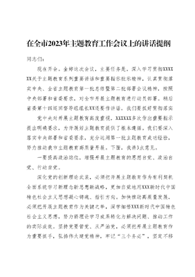 在全市2023年主题教育工作会议上的讲话提纲同志们:现在开会。金婷这次会议,主要任务是,深入学习贯彻XXXXXX关于主题教育系列重要讲话和重要指示批示精神,认真贯彻落实中央、全省主题教育第一批总结暨第二批部署会议精神,按照中央部署和省委要求,对全市开展主题教育进行动员部署。稍后省委第十四巡回督导组组长XX还要作讲话,我们要抓好贯彻落实党中央对开展主题教育高度重视,XXXXXX多次作出重要指示提出明确要求,为开展好主题教育提供了根本遵循。我们要深入落实中央部署和省委要求,充分运用第一批主题教育成功经验,努力推动我市主题教育高质量开展。下面,我讲3点意见。一要提高政治站位,增强开展主题教育的思想自觉、政治自觉、行动自觉。深化党的创新理论武装,必须把开展主题教育作为有利契机全面系统学习新理念新思想新战略,更加自觉地用XXX新时代中国特色社会主义思想凝心铸魂、指引方向。加快推动高质量发展,必须把开展主题教育作为关键之举,深学细悟XXX新时代中国特色社会主义思想,努力将理论学习成果转化为解决问题、推动工作的实际成效。坚持党要管党、从严治党,必须把开展主题教育作为重要抓手,弘扬伟大建党精神,牢记三个务必,坚定不移推进党的自我革命。党中央对这次主题教育的总要求、目标任务作出了明确规定,我们要全面系统理解把握,认真抓好贯彻落实要紧紧围绕学思想、强党性、重实践、建新功的总要求,坚持学思用贯通、知信行统一,把XXX新时代中国特色社会主义思想转化为坚定理想、锤炼党性和指导实践、推动工作的强大力量,全面落实以学铸魂、以学增智、以学正风、以学促干的重要要求,确保实现凝心铸魂筑牢根本、锤炼品格强化忠诚、实干担当促进发展、践行宗旨为民造福、廉洁奉公树立新风的目标二要聚焦主题教育总要求和目标任务,切实做到十查十看。对标市委三提三敢要求,深刻检视剖析,认真对照反思一查理论学习方面的差距,看是否做到真学真信真用、入脑入心入行;二查政治素质方面的差距,看是否做到胸怀两个大局心系国之大者;三查担当作为方面的差距,看是否做到心无旁骛干事业、一心一意抓落实;四查攻坚克难方面的差距,看是否做到不畏艰险、迎难而上;五查工作效率方面的差距,看是否做到雷厉风行、马上就办;六查工作韧劲方面的差距,看是否做到久久为功、善作善成;七查争先创优方面的差距,看是否做到事争一流、唯旗是夺;八查改革创新方面的差距,看是否做到与时俱进、大胆革新;九查为民情怀方面的差距,看是否做到真情关心群众、用心服务群众;十查廉洁自律方面的差距,看是否做到严于律己、光明磊落。全市各级各部门和广大党员干部要坚持刀刃向内,来一场直击内心、深入灵魂的自我拷问,在深查细照中找问题、知差距,在荡涤心灵中明方向、促提升,以更加务实的作风推动聊城各项事业不断取得新突破。三落实重点措施,推动主题教育扎实有序开展。要加强理论学习,坚持把理论学习贯穿始终,深入学习XXX新时代中国特色社会主义思想,全面系统学、深入思考学、联系实际学,夯实坚定拥护两个确立、坚决做到两个维护的思想根基。要深入调查研究,用好XXXXXX倡导的深、实、细、准、效五字诀,紧紧围绕市委明确的15个重点方向,坚持实事求是,科学统筹安排,注重成果转化,开展有深度、有价值、有实效的调查研究。要全力推动发展,紧紧围绕强市建设,锚定九个聚力突破重点任务,加快推进高质量发展,着力防范化解风险,持续办好民生实事,把推动改革发展稳定、完成全年目标任务的成效作为检验主题教育成果的重要标尺,引导党员干部把主题教育激发出来的热情转化为干事创业的强大动力。要狠抓检视整改,坚持边学习、边对照、边检视、边整改,把问题整改贯穿主题教育始终,深入查摆不足,深刻反思剖析,有针对性地抓好整改整治,做到问题查摆要全,剖析根源要深,整改落实要真。要突出建章立制,对发现的问题必须透过表象看本质,多从主观层面、体制机制等入手,坚持当下改与长久立相结合,注重用制度规范破解深层次问题。第二批主题教育时间紧、任务重、要求高,各级党委(党组)要精心组织实施,工作责任要压实,分类指导要精准,统筹兼顾要到位,宣传引导要跟进,确保圆满完成各项任务,持续推动学思践悟XXX新时代中国特色社会主义思想走深走实,以学铸魂以学增智、以学正风、以学促干,不断开创新时代社会主义现代化强市建设新局面。要深刻认识开展主题教育的重大意义,把握落实好主题教育总要求、根本任务、具体目标、重点措施,教育引导广大党员干部深刻领悟两个确立的决定性意义,更加自觉在思想上政治上行动上同以XXX同志为核心的党中央保持高度一致。各级党委(党组)要把开展主题教育作为重要政治任务紧紧抓在手上,严格落实责任,突出工作重点,把握关键要求,切实把主题教育抓出高质量好效果。要坚定扛牢政治责任,