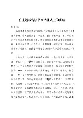 在主题教育读书班结业式上的讲话同志们:县委常委会学习贯彻XXX新时代中国特色社会主义思想主题教育读书班,今天就结束了。一周来,我们按照中央、省、市委要求和县委主题教育工作部署,紧紧围绕主题教育总要求和具体目标,采取集体学习、个人自学、专题辅导、研讨交流、革命传统教育等多种形式,全面学习领会了XXX新时代中国特色社会主义思想。总的来看,这次读书班虽然时间短,但是主题突出、内容丰富、形式多样。一是学习比较系统。突出学习贯彻XXX新时代中国特色社会主义思想这个核心内容和根本任务,结合学习党的XX大报告、XXXXXX关于调查研究等重要论述,读原著、学原文、悟原理,一字一句从原文学起,逐篇逐章认真研读领悟,与以往相比内容比较全面,学习也相对系统。二是研讨比较深入。读书班期间,我们进行了X次交流研讨,有XX位领导同志作了交流发言。大家在交流中,紧扣XX字总要求和具体目标,结合个人学习、思想和工作实际,谈了很多很好的看法,学习和思考都有一定的深度达到了相互学习、相互辅导、相互交流、共同提高的目的。三是形式比较灵活。采取领导领学、个人自学、交流研讨、辅导报告等多种方式,既突出重点内容的集中学习和深钻细研,又留出一定时间让大家自学。同时,还穿插安排了观看专题片、开展革命传统教育活动等,增强了学习教育的感染力,思想政治受到了深刻洗礼。四是学风比较浓厚。对参加这次读书班,大家都很重视也很珍惜,都能自觉按照县委常委会的安排,严格遵守学习纪律和相关规定。除个别事先预定的会议和活动之外,大家都能把自己的工作安排好,静下心来认真读书学习,发扬理论联系实际的良好学风,深入思考、相互探讨,形成了比较好的学习氛围。一周以来,大家全面系统学习原文,集中精力聆听辅导报告联系实际深入思考,广泛开展研讨交流,在学思想上充了电在强党性上补了钙,在重实践上加了油,在建新功上赋了能,达到了预期目的,取得了良好效果。一是注重守初心践使命,在以学铸魂方面有了新境界。大家深刻感到,要切实增强对党的价值追求和前进方向的高度政治认同,把好世界观、人生观、价值观这个总开关,自觉坚持党的全面领导、坚定维护党中央权威和集中统一领导,不断提高政治判断力、政治领悟力、政治执行力,始终在政治立场、政治方向、政治原则、政治道路上同党中央保持高度一致,把对党忠诚体现到贯彻落实好党中央决策部署的实际行动上。把人民群众满意不满意作为评判主题教育成效的根本标准,解决好人民群众最关心最直接最现实的利益问题,把惠民生的事办实、暖民心的事办细、顺民意的事办好,让现代化建设成果更多更公平惠及全体人民。二是注重悟规律明方向,在以学增智方面有了新感悟。大家普遍谈到,XXX新时代中国特色社会主义思想,是系统全面、逻辑严密、内涵丰富、内在统一的科学理论体系,十个明确十四个坚持十三个方面成就的主要内容、两个结合的根本途径、六个必须坚持的世界观和方法论以及推进中国式现代化的实践要求,承载着我们党的初心使命,擘画了实现民族复兴中国梦的宏伟蓝图,充分体现了当代中国共产党人的政治立场、价值追求、精神风范,开辟了马克思主义中国化时代化的新境界。我们要不断提升政治能力、思维能力和实践能力,增强推动高质量发展、服务群众、防范化解风险本领,加强斗争精神和斗争本领养成,着力增强防风险、迎挑战、抗打压能力,及时填知识空白、补素质短板、强能力弱项,不断提高专业化水平。三是注重守底线树新风,在以学正风方面有了新提升。大家一致认为,勇于自我革命,是我们党区别于其他政党的显著标志党的十八大以来,XXXXXX带领全党以作风建设开局起步,以踏石留印、抓铁有痕的韧劲,引领全党持续纠风治弊、整治顽瘴痼疾一以贯之、步步深入、久久为功,党风政风焕然一新、社风民风持续向好、党心民心空前凝聚,以伟大自我革命推动伟大社会革命取得了历史性、开创性成就,必须始终牢记XXX作风连着党风关系人心向背的谆谆告诫,严守政治纪律、政治规矩,对标对表、持续淬炼过硬作风,自觉经常接受政治体检、打扫政治灰尘以实际行动赓续好传统、弘扬新风尚。四是注重勇担当促发展,在以学促干方面有了新动力。大家一致表示,通过读书班的学习坚定了做好工作的信心决心,激发了干事创业的热情干劲,一定扎实开展好主题教育,坚决贯彻落实好XXXXXX对甘肃重要讲话重要指示批示精神,牢牢把握三新一高要求,把主题教育成果体现到高质量发展的成效上、体现到促进中心工作上。要聚焦全县XXXX发展思路,紧盯全面建设社会主义现代化幸福美好新X奋斗目标,开展项目争速、产业争强、企业争效、民生争优、县域争位五争攻坚行动和立足岗位作贡献学习身边榜样等活动,实现综合经济实力、产业发展质效、城乡建设品位民生保障水平、安全发展能力五大提升,抓实八大重点产业链,深入推进引大引强