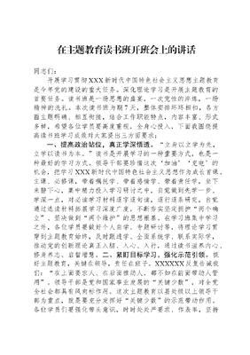 在主题教育读书班开班会上的讲话同志们:开展学习贯彻XXX新时代中国特色社会主义思想主题教育是今年党的建设的重大任务。深化理论学习是开展主题教育的首要任务。读书班是一场思想的盛宴,一次党性的淬炼,一场精神的洗礼。本次读书班为期7天,整体安排环环相扣,各方面主题明确、相互衔接,结合工作职能特点,内容丰富、形式多样,希望各位学员要高度重视,全身心投入,下面我围绕提高读书班学习成效对大家提出三方面要求:一、提高政治站位,真正学深悟透。立身以立学为先,立学以读书为本。读书是开展学习的一种重要方式,也是一种最好的学习方式。领导干部要珍惜这次加油充电的机会,把学习XXX新时代中国特色社会主义思想作为成长首课、主课、必修课,带着嘱托学、带着感情学、带着责任学,坐下来静下心,集中精力投入学习研讨之中,自觉做到先学一步、学深一点,对必读学习材料逐字逐句读,逐行逐条研究,自觉通过选读材料拓展学习深度广度,不断夯实坚定拥护两个确立、坚决做到两个维护的思想根基。在学习班集中学习之外,各位学员要做好个人自学、专题研讨等,将理论学习贯穿到主题教育始终,及时跟进学、全面系统学、联系实际学,推动党的创新理论真正入脑、入心、入行,通过读书滋养内心、修身养志、启智增慧。二、紧盯目标学习,强化示范引领。抓好主题教育,关键在领导,责任在班子。XXXXXX反复告诫我们:在上面要求人、在后面推动人,都不如在前面带动人管用。领导干部是党和国家事业发展的关键少数,对全党全社会都具有风向标作用。这次主题教育以县处级以上领导干部为重点,就是要充分发挥好关键少数的示范带动作用。各位学员们要强化带头意识,时时处处严要求、作表率,坚持凡是对普通党员的学习要求,我们都要首先做到,同时要更进一步、学深一层。具体到本次学习班,就是要坚持干什么学什么,缺什么补什么,认真参与好学习和讨论环节,紧扣职能职责,结合工作实际,联系自身思想、工作实际和具体事例,讲认识感悟、讲收获体会、讲思路举措,确保学习效果,切实将勤于学习、善于学习变为克服本领恐慌的有效手段、成为行家里手的关键所在。三、聚焦学用结合,推动事业发展。理论的价值在于指导实践,学习的目的全在于运用。坚持认识和实践相结合、理论和实际相联系,是我们党历次开展主题教育的一贯要求。衡量主题教育抓得好不好,关键看在促进事业发展中能不能取得实际成效。XXX新时代中国特色社会主义思想坚持和运用马克思主义立场观点方法,为我们认识问题、分析问题、解决问题树立了典范。通过这次学习班,我们的领导干部要从问题入手,统筹好本职工作与理论学习的关系,加强学习针对性,及时填知识空白、补素质短板、强能力弱项,切实把学习成果转化为正确思路、政策措施、能力本领,做到两手抓、两不误、两促进。思想灿若明灯,引领行动,照亮前程。以此次主题教育为契机,我们的干部同志们可以全面加强理论武装,坚持把自己摆进去、把职责摆进去、把工作摆进去,做好深化、内化、转化工作,真正把马克思主义看家本领学到手,自觉用XXX新时代中国特色社会主义思想指导各项工作,以理论学习的不断线,推动政治能力的再提升。