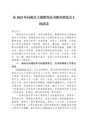 在2023年局机关主题教育读书班开班仪式上的讲话同志们:按照党中央和省委、市委部署要求,根据局系统主题教育相关工作安排,局党组决定安排7天时间举办此次主题教育专题读书班,组织大家进一步读原著、学原文、悟原理,这既是深入贯彻主题教育学思想、强党性、重实践、建新功总体要求的重要内容,也是筑牢党员领导干部思想基础、增强八种本领、推动工作落实、加强作风建设的有效举措。大家一定要倍加珍惜这次学习机会,沉下身子、静下心来,认真读、仔细听、深入想,确保达到提升能力、促进工作的良好效果。下面,我强调3方面意见。一、深刻认识理论学习的重要意义,在深学细悟上下更大功夫XXXXXX指出,这次主题教育,要在推动贯彻新时代中国特色社会主义思想走深走实上下功夫,教育引导党员干部从正本清源、固本培元,不断提高政治判断力、政治领悟力、政治执行力,做到心往一处想、劲往一处使,共同把党锻造成一块攻无不克、战无不胜的坚硬钢铁。XXX的重要指示,为我们举办读书班、深化理论学习明确了目标、指出了方向,系统党员干部要深刻认识理论学习的极端重要性,自觉把理论学习当成工作来安排、来推动,做到真学真懂、真信真用。一是深化理论学习是汇集团结之力的重要保证。团结统一是党的生命、是党的力量所在,思想上的统一是党的团结统一最深厚、最持久、最可靠的保证。党的十八大以来,无论面对什么困难局面,全党全国各族人民始终团结在以XXX同志为核心的党中央周围,始终坚持以XXX新时代中国特色社会主义思想为指导,汇聚了比铁还硬、比钢还强的团结之力,赢得了彪炳史册的历史性胜利。实践充分证明,两个确立是国家富强、民族复兴、人民幸福的定盘星和压舱石,两个维护是保证党团结统一、坚强有力的关键所在,必须倍加珍惜、坚定维护、长期坚持。我们举办读书班,深化理论学习,根本目的是坚持不懈用党的创新理论统一思想、统一意志、统一行动,教育引导广大党员干部从思想上深刻领悟两个确立的决定性意义,坚定四个自信、做到两个维护,牢固树立XXX怎么说、我们就怎么做政治信念,始终在思想上政治上行动上同党中央保持高度一致。二是深化理论学习是凝聚奋进之志的重要基础。党的XX大描绘了以中国式现代化推进中华民族伟大复兴的宏伟蓝图。全面建设社会主义现代化美丽新城市是XXXXXX对我们的殷切期望,是我市坚定担当中国式现代化使命任务的目标所系。对农业农村厅门来讲,强化要素保障、推动高质量发展,我们还有很多重要的任务要完成;建设美丽新城市,筑牢祖国西北生态安全屏障,我们还有很多关键的工作要推进;统筹发展和安全,保障粮食安全、生态安全、资源安全、网络安全,防范化解各类风险挑战,我们还有很多难题要解决;推进乡村振兴、深化农业农村领域改革、保障和改善民生,我们还有很多急事难事要办。举办读书班、深化理论学习,就是要深刻领悟党的XX大的重要部署,深入领会XXXXXX重要指示批示精神的核心要义,教育引导党员干部牢固树立锐意进取、敢为人先的奋进精神,持续提升争先领跑、担当有为的实干作风,不断增强迎难而上、攻坚克难的斗争意识,以三步并做两步走,两天并做一天干的责任感、紧迫感、使命感,推动农业农村事业高质量发展,努力交出让市委和政府放心、让人民群众满意的优异答卷。三是深化理论学习是锤炼致胜之能的重要前提。XXX新时代中国特色社会主义思想是引领方向的指南针、指导实践压舱石、破解难题的金钥匙。从农业农村领域当前存在的突出问题来看,耕地保护中存在的责任不落实、违法占用问题履禁不止等问题,生态保护修复中存在的系统保护、科学修复不够等问题,空间规划编制实施中存在的前瞻性不强、严肃性难以落实等问题,追根溯源,就在于对XXX新时代中国特色社会主义思想学得不深、悟的不透,对XXXXXX重要指示批示精神的核心要义理解的不够全面准确。我们举办读书班、深化理论学习,就是要深入学习领会XXX新时代中国特色社会主义基本观点、科学体系、精髓内涵,把握好这一思想的世界观、方法论,坚持好、运用好贯穿其中的立场观点方法,真正把马克思主义的看家本领学到手,增强运用两点论和重点论解决实际问题的能力,不断提高服务高质量发展能力、服务群众能力、善于斗争能力,以新气象新作为推动高质量发展取得新成效,以新精神新状态打开事业发展新天地。二、牢牢把握理论学习的关键任务,在学以致用上下更大功夫XXXXXX指出,这次主题教育,要教育引导党员干部学思想、见行动,树立正确的权力观、政绩观、事业观,增强责任感和使命感,不断提高服务发展和服务群众的本领。我们举办读书班、深化理论学习,就要深刻理解XXX重要指示精神,在以学铸魂、以学增智、以学正风、以学促干上下更大功夫,确保学习取得实实在在的成效。一要原原本本学,学出坚定信念。党的XX大报告、《XXX新时代中国特色社会主义思想学