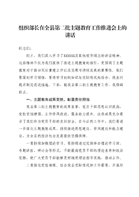 组织部长在全县第二批主题教育工作推进会上的讲话同志们:刚才,我们深入学习了XXXXXX及其他领导同志的讲话精神。这些精神不仅为我们提供了推进主题教育的指引,更强调了主题教育对于推动灾后重建工作以及实现可持续发展的重要性。我们要深刻学习领悟,要将学习到的知识与实际情况相结合,找出问题并制定改进措施。下面,就我县第二批主题教育工作,我强调四点。一、主题教育成果斐然,彰显责任担当我县第二批主题教育的成果显著,党员干部思想认识提高、党性觉悟增强、工作作风改进、服务能力提升。这些成果充分展示了我们作为党员干部的责任担当。在今后的工作中,我们要进一步深化主题教育成果,持续推进思想建设、作风建设和能力建设,为全县的经济社会发展提供坚强保障。一要持续加强理论学习。要持续通过定期举办理论学习班、专题讲座、研讨会等形式,不断提高党员干部的理论素养和政治觉悟,使广大党员干部能够更好地用理论指导实践,推动工作。二要强化党性锤炼。结合我县实际情况和工作需要,开展形式多样的党性锤炼活动,如红色教育基地参观学习、重温入党誓词等,增强党员干部的党性观念和党性修养。三要推进作风建设继续深化走基层、解难题、办实事、惠民生活动,扎实推进党员干部直接联系服务群众工作机制,加强机关效能建设,倡导勤政廉政、高效务实的作风,使党员干部真正成为人民群众的贴心人和服务员。二、学用结合,查改并举,推动发展见实效在主题教育中,我们不仅强调理论学习,还注重将学习到的知识与实际情况相结合。我们通过深入基层调研、广泛听取群众意见等方式,找出存在的问题并制定相应的改进措施。提出的措施既要能体现群众的意愿和需求,又要符合我县的发展方向和实际情况。在实际工作中,我们很多工作值得肯定。一是在创新创造方面。我们成功地将主题教育与城乡环境综合大整治行动相结合,让群众切身感受到主题教育带来的改变。我们还积极探索创新方式方法,将主题教育成果转化为发展动力和民生福祉,切实增强群众的获得感幸福感安全感。二是在问题查摆方面。认真开展问题查摆,针对存在的问题我们建立了问题台账和整改清单,明确责任人和整改时限,确保问题得到及时整改。三是在监督检查方面。我们加强了对整改情况的监督和检查对整改不力、效果不明显的单位进行问责处理,确保整改工作取得实效。四是在推动发展方面,我们积极引入创新思维和先进理念,引导全县党员干部解放思想、转变观念,以创新驱动发展。同时加强对外交流与合作,充分利用外部资源促进我县经济社会发展这些成绩的取得,离不开各级各部门的奋发努力,离不开广大人民群众的支持。离不开在座各位的辛勤付出,在这里,我要感谢大家!三、提高政治站位,正确处理主题教育与业务工作的关系一要将主题教育融入日常业务工作中。要将主题教育的精神实质和要求贯穿到日常业务工作中,把党员干部的思想和行动统一到中央和省、市、县委的决策部署上来,确保各项工作的高效有序推进。二要总结提炼业务工作中的好经验好做法。要及时总结提炼业务工作中的好经验好做法,将其融入到主题教育中来。这些经验做法既可以是成功的实践案例,也可以是典型的先进事迹,用它们来激励全县党员干部积极进取、担当作为。三要推动主题教育与业务工作的相互促进。要通过主题教育的开展,进一步增强党员干部的政治意识和大局意识,提高他们的思想觉悟和工作热情。同时也要通过业务工作的实际成效来检验主题教育的成果,实现相互促进、共同发展。只有这样才能够形成合力推动各项工作的落实和发展取得更好的成效。四要强化组织领导,完善工作机制和考核评价制度。各单位主要负责人要切实履行第一责任人职责,把主题教育与业务工作同部署同落实同考核,同时加强对主题教育开展情况的督促检查发现问题及时纠正确保主题教育工作取得实效。五要加强宣传引导。要进一步加强宣传引导工作,通过多种形式广泛宣传主题教育的重大意义和实际成效,营造浓厚的氛围,鼓励全县党员干部积极参与到主题教育中来,共同推动我县的经济社会发展取得更大的成就。四、强化制度保障,确保主题教育长效推进主要从五个方面强化制度建设。一要健全主题教育长效机制。要进一步健全主题教育的长效机制,确保主题教育的各项工作要求能够长期贯彻执行。通过完善制度建设,将主题教育的成功经验转化为常态化工作机制,确保主题教育的成果能够长期持续。二要健全考核评价机制。建立健全考核评价机制,对全县各单位主题教育的开展情况进行全面考核评估,考核结果作为各单位年度工作目标考核的重要依据,激励各单位积极投入到主题教育中来。三要健全教育成果转化机制。要建立教育成果转化机制,鼓励全县党员干部将主题教育中学到的知识和经验运用到实际工作中去。同时,要加强对教育成果转化的监督和评估,及时总结经验,发现问题,并不断完善提高。四要建立整改问题责任制。针对主题教育过程中发现的问题我们要建立整改问题责任制,明确责任人和整改时限