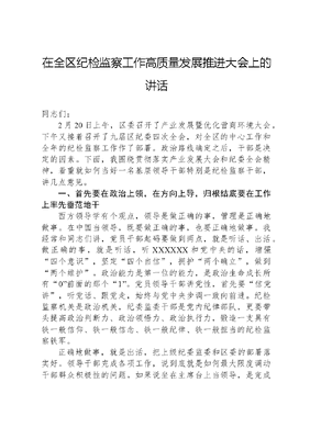 在全区纪检监察工作高质量发展推进大会上的讲话同志们:2月20日上午,区委召开了产业发展暨优化营商环境大会,下午又接着召开了九届区纪委四次全会,对全区的中心工作和全年的纪检监察工作作了部署。政治路线确定之后,干部是决定的因素。下面,我围绕贯彻落实产业发展大会和纪委全会精神,着重就如何当好一名基层领导干部特别是纪检监察干部,讲几点意见。一、首先要在政治上领,在方向上导,归根结底要在工作上率先垂范地干西方领导学有个观点,领导是做正确的事,管理是正确地做事。在中国当领导,既要做正确的事,也要正确地做事。我经常和同志们讲,党员干部起码要做到两点,就是听话、出活。做正确的事,就是听话,听XXXXXX和党中央的话,增强四个意识,坚定四个自信,拥护两个确立,做到两个维护。政治能力是第一位的能力,是政治生命成长所有0前面的那个1。党员领导干部讲党性,首先要信党讲,听党话、跟党走,始终与党中央步调一致向前进。纪检监察机关是政治机关,纪委监委干部是党内纪律部队,更要带头提高政治判断力、政治领悟力、政治执行力,锻造一支具有铁一般信仰、铁一般信念、铁一般纪律、铁一般担当的纪检监察铁军。正确地做事,就是出活,把上级纪委监委和区委的部署落实好。领导干部完成各项工作,说到底就是如何最大限度调动干部群众积极性的问题。如果说坐在主席台上当领导,是完成了组织任命的法定程序,那么主席台下的干部群众是不是真心把你当领导,打心眼里认可你追随你,还需要靠领导干部在实践中自己去获取。群众心里的这杆秤,我们眼睛虽然看不到,但往往比我们用眼睛看到的、用耳朵听到的更真实更可靠。群众看领导,一看是否出于公心。古人讲,吏不畏吾严,而畏吾廉;民不服吾能,而服吾公。廉洁是最好的公信力,公心是最强的领导力!领导考虑问题如果都从私利出发,哪怕能力再强、本领再大、水平再高,群众也不会真心跟着你干。二看是否言而有信。领导要真正起到领和导的作用,最基本的一条,就是说到做到、言行一致,要求别人做到的自己首先做到,要求别人不做的自己首先不做。领导者要切记,群众的眼睛是雪亮的,你可以在一段时间欺骗所有人,也可以在所有时间欺骗部分人,但不能在所有时间欺骗所有人。三看是否率先垂范。一头狮子带领的一群羊之所以能打败一只羊带领的一群狮子,就是因为狮子的带头作用做得比羊好。领导之所以为领导,在战争年代就要冲锋在前大喊跟我上,在和平年代就要像导游把红旗子举起来大喊跟我走,跟我上和给我上完全不是一回事。二、要制定目标计划并确保目标计划的实现毛主席讲,领导者的责任,归结起来,主要地是出主意、用干部两件事。出主意就是制定目标计划。用干部就是通过激发干部的积极性、创造性抓好目标计划的落实。为什么要制定目标计划呢?因为我们要完成一项长期而艰巨的任务,比如说推动纪检监察工作高质量发展、铁军队伍建设等等,不仅要有时间的参数,也要有具体的方法、步骤和措施,因此是动机和效果的统一,世界观和方法论的统一,也是检验领导干部水平的重要标准。《论语》上有句话,叫人无远虑,必有近忧。这句话,有两层意思:一是讲制定长远计划的重要性,无论是个人还是单位,没有了目标计划,脚踩西瓜皮滑到哪里算哪里,就容易失去方向,造成当前工作的被动;二是讲计划执行的坚定性源于计划制定的科学性,如果从长远看,我们坚信目标一定能实现,就不会因为暂时的困难而气馁,也不会被别人的议论所干扰,就能踏着不变的节奏坚定地走下去。好的目标计划,既不能脱离实际,又不能低于实际。脱离实际,违背了客观规律,劳民伤财;低于实际,这样的目标计划如同一张废纸。好的目标计划,鲜明的特点在于其有效性,即有效地激发起干部群众的责任感荣誉感,有效地提高了各组成部分的工作效率,有效地推动了整体工作的高质量发展。比如,我们制定高质量考核争先进位的目标计划,这对我们来说有较大的难度,但我们经过研判认为,只要全委共同努力是可以实现的,实现了又能极大激发起全体纪检监察干部的荣誉感、自豪感和归属感,而最终我们确实又实现了,这就是好的目标计划。再比如,我们开展孝廉X建设,因为制定了明确目标,采取了扎实举措,又广泛发动基层群众,所以很快造成声势、形成影响,相继获得了中国廉洁创新奖特色创新项目和新时代廉洁文化建设在江苏十佳成果。有了好的目标计划只是成功了一半,要想达到真正的成功还要确保目标的实现。如何实现?一要有效地动员、有力地部署。所谓有效地动员,就是领导干部要发挥掌握思想领导这个第一位的领导、第一等的业务,让干部群众从思想上认同这个目标计划。所谓有力地部署,就是干部群众积极主动地、有计划有创造性地开展工作。二要全过程监督、全方位管控。在哪个时间节点要完成哪些工作、达到哪些效果、与序时相比还存在哪些差距,领导要做到心中有数,落后的要想办法补上来。三要
