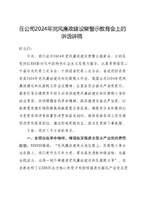 在公司2024年党风廉政建设暨警示教育会上的讲话讲稿同志们:今天,我们召开2024年党风廉政建设暨警示教育会,目的是坚持以XXX新时代中国特色社会主义思想为指导,认真贯彻落实二十届中央纪委三次全会、十四届省纪委二次全会、省政府国资委党委2024年党风廉政建设和反腐败工作会、集团公司2024年党风廉政建设和反腐败工作会议精神,压紧压实全面从严治党责任,教育引导全体党员干部主动承担起党风廉政建设和反腐败斗争的政治责任,持续增强自我革命精神,纵深推进全面从严治党,以高质量党建引领保障我部高质量全面发展,确保党中央和集团公司党委各项决策部署坚决贯彻落实到位,确保我部各项工作安排坚决贯彻落实到位,推动形成积极向上、担当负责的干事氛围。下面,我讲三个方面的意见。一、发扬自我革命精神,增强纵深推进全面从严治党的思想自觉。XXXXXX强调:党风廉政建设永远在路上,反腐败斗争永远在路上。我们党作为百年大党,要永葆先进性和纯洁性、永葆生机活力,必须一刻不停推进党风廉政建设和反腐败斗争。这些都表明了以XXX同志为核心的党中央持续推进全面从严治党态度一以贯之、决心坚如磐石。对此全体党员干部必须自觉把思想和行动统一到党中央关于推进全面从严治党的新要求、新部署上来全力推动党的建设严起来、实起来、强起来。一要以党规党纪为引导,提高政治站位。每个党员干部必须学好用好党规党纪,把遵守党规党纪作为政治纪律和政治规矩,牢固树立政治意识、大局意识、核心意识和看齐意识,把对党忠诚作为共产党员必须坚守的生命线和立身之本,在任何时候、任何情况下都要保持清醒头脑和政治本色,严守党的政治纪律和政治规矩,站在党和国家大局上想问题、看问题,自觉做到三个看齐和三个坚决,经常和党中央要求对表,看看有没有慢半拍的问题,有没有看不齐的问题,有没有不看齐的问题,主动进行调整、纠正、校准,切实做到政治立场始终不移、政治方向始终不偏,坚定自觉地同以XXX同志为核心的党中央保持高度一致。二要以实际问题为导向,认真履职尽责。从各单位的意见反馈来看,我部个别人员在外出检查中依然存在走过场、不担责、搞应付等问题,有些部门还存在着庸懒散慢的行为久治不绝,所有这些问题,足以说明我们在党的建设和党风廉政建设工作中的差距。面对工作中的不足,我们要坚持抓常抓细、抓严抓实、持续用力、久久为功抓作风,采取强有力的措施,推进党风廉政建设,坚决反对事不关己、高高挂起的庸俗哲学,反对明知不对、少说为佳的好人思想,反对文过饰非、知错不改的错误倾向,要切实增强转变作风、提升工作质效、推进高质量发展的责任感和紧迫感。三要以责任担当为己任,加大工作力度。在全面贯彻落实党的XX大精神的关键之年、实施十四五发展规划的攻坚之年,我部迫切需要加强党员干部和职工队伍教育管理,培养一支平常看得出、关键时候站得出、危机关头豁得出的党员队伍和知识型技能型、创新型职工队伍;迫切需要各党支部发挥战斗堡垒作用以高质量党建引领保障我部实现更加安全、更有效率、更可持续的高质量全面发展。为此,我们要坚定不移推动全面从严治党向纵深推进、向基层延伸、向每名党员覆盖,使党支部更具领导力和战斗力、更具先进性和纯洁性,为建成现代能源企业提供强有力的政治保障。二、坚持严的主基调,增强纵深推进全面从严治党的政治自觉。严管就是厚爱,监督就是保护。从严监督,是为了让党员干部少犯错误或不犯错误,是从根本上爱护干部,是更高层次上关心干部。我们要把严的主基调长期坚持下去,认真贯彻落实《集团公司党委关于构建大监督体系的实施意见》,形成全面覆盖、常态长效的监督合力,让所有党员干部在受监督和约束的环境中工作生活,防止小矛盾酿成大错误、小毛病发展成大问题。一要在监督内容上突出政治监督。各党支部要始终把三讲一守(讲政治、讲规矩、讲良心、守纪律)作为安身立命的压舱石,严格落实五到(身到、心到、眼到、手到、口到)工作法,重点做到五个强化,即强化对部室一把手和支委班子对党忠诚,践行党的性质宗旨情况的监督;强化对贯彻落实党的路线方针政策和党中央重大决策部署,践行两个维护情况的监督;强化对立足新发展阶段、贯彻新发展理念、构建新发展格局,推动高质量发展情况的监督;强化对落实全面从严治党主体责任和监督责任情况的监督;强化对贯彻执行民主集中制、依规依法履职用权、担当作为、廉洁自律等情况的监督,坚定不移加强政治建设,坚决扛起党风廉政建设主体责任,一刻不停推进党风廉政建设和反腐败斗争,把各项要求融入日常、抓在经常形成常态,始终保持赶考的清醒,坚定不移推进全面从严治党。二是在监督格局上突出党内监督。要全面落实组织生活制度发挥近距离监督优势,提高发现和解决自身问题的能力,要把一严到底、一抓到底、一管到底等严的主基调贯穿始终,全体干部职工要强化政治定力