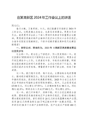 在某高新区2024年工作会议上的讲话同志们:春归大地,万象更新。今天,我们隆重召开高新区2024年工作会议,这既是盘点总结会、也是任务部署会,更是全员动员会,就是要号召全区上下深入贯彻中央和省市委重要会议精神,聚焦建设承接东部产业转移示范区和北京对口合作示范区,全面争创国家百强高新区,不断开创高质量发展和现代化建设新局面!一、科学应对、担当作为,2023年 X高新区高质量发展迈出坚实步伐过去的一年,是全区上下拼经济、同心促发展的一年。我们坚持以XXX新时代中国特色社会主义思想为指引,聚焦全省开发区建设中心工作,认真落实市委、市政府决策部署,积极担当国家高新区新时代发展使命,主动应对经济下行压力,推动园区经济在攻坚克难、增量提质中取得了新业绩、创造了新成就。这一年,我们稳中求进、难中求成,主要指标全线逆势增长。面对经济超预期压力,强化宏观调控的针对性,突出工作举措的实效性,促进经济发展提质增效。2023年全省工业类开发区考核的6项指标全部实现较快增长。其中,工业投资完成62.08亿元,同比增长17.53%;工业增加值完成38亿元,同比增长12.3%;财政总收入完成57.08亿元,同比增长15%。这一年,我们只争朝夕、深耕不辍,两大示范区建设全面起势。围绕建设承接东部地区产业转移示范区,坚持以集群式理念狠抓招商引资,新引进投资20亿元的东莞晶博光电产业园、投资20亿元的青岛乾运10万吨正极材料等一批重点项目,两年共引进20多个东部产业转移项目,投产达效后产值超400亿元、利税20多亿元,解决就业上万人,初步形成了聚企成链、聚链成群的发展格局。在2023年4月全省招商引资大会上,高新区作了经验交流。围绕建设北京对口合作示范区,坚持高频次对口交流,主要领导带队10余次赴北京市相关单位、重点企业进行对接,明确了合作机制;推动 X市政府与北京市科委、中关村管委会签订了加强科技创新合作战略框架协议。坚持多渠道引进合作项目,全年谋划推进了10个京长合作项目,特别是由中国兵器工业集团投资的中兵长智信创产业项目,实现了当年签约、当年建设、当年投产,2023年营业收入超亿元;引进了中国科学院院士顾瑛团队研发的半导体无创光疗技术应用研究及产业化项目,未来将带动万亿级光疗市场。这一年,我们厚积薄发、行稳致远,四大产业加快集聚集群发展。坚决贯彻XXXXXX关于国家高新区又高又新的重要指示,着力打造电子信息、装备制造、新能源、生物医药及大健康四大百亿级高新产业集群。在电子信息产业集群上,形成了以凯松电子、立讯精密、卓怡恒通为龙头,20多家电子企业集聚发展的产业格局,每年将保持30%以上的产值增长。在装备制造产业集群上,智能装备制造园区和中小企业装备制造园区加快建设,已有10多家企业入园,形成了集聚发展态势。在生物医药与大健康产业集群上,百泰生物制药项目全面开工建设,形成了康宝、百泰、澳瑞特等10多家企业集聚发展的产业集群。在新能源产业集群上,引进了青岛乾运正极材料,与山西晨烯负极材料形成了正负极一体化锂电材料产业格局。 X高新区在连续三年被国家发改委等四部委评为真抓实干成效明显的产业转型升级示范园区的基础上,2023年被国家发改委评为全国首批碳达峰试点园区,受到省政府通报表彰。这一年,我们向新发展、向高攀登,科技创新加快赋能产业转型。围绕产业链布局创新链,培育了一批高新技术企业,建设了一批科技研发平台,引进了一批高端科技项目,转化了一批科研成果。2023年有效期内高新技术企业达到151家,同比增长13.5%;共培育9批147家企业纳入国家科技型中小企业信息库。全区省级以上科技双创载体达到16家,入驻市场主体549家,带动就业3556人。新培育认定市级以上创新平台7家,山西省光伏制造中试基地、山西省煤基合成润滑材料研究与应用技术创新中心等一批高水平创新平台相继建成;古巴分子免疫学( X)研发中心、久安人工心脏等国际科技合作项目加速推进,不仅为园区企业赋能增效,更将引领 X科技创新向高端发力,打造区域性创新高地。这一年,我们高位谋划、强势推进,数字经济蓬勃发展。坚持系统性谋划、链条式发展、一体化推进、融通型提升,在规划引领、科技赋能、产业集聚、链式发展、转型服务等方面积累了扎实的数字化转型基础,形成了一批数字化转型成功案例。高新区被省发改委认定为山西省第一批省级数字化转型促进中心(区域型),5G电子智造基地被评为山西省第一批省级数字经济示范型园区。开展了全区及10多家中小企业数字化转型诊断,着力构建产业数字化转型普惠服务体系。积极推动信创产业集群发展,申报的信创专业镇被认定为第一批市级特色专业镇,共培育信创相关企业13家,2023年完成营业收入7.1亿元,同比增长97%,高新区成为全省重要信创产业高地。这一年,我们精准服务、帮企解困