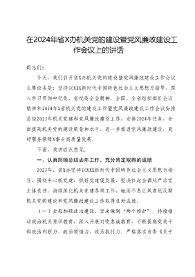在2024年省X办机关党的建设暨党风廉政建设工作会议上的讲话同志们:今天,我们召开省X办机关党的建设暨党风廉政建设工作会议主要任务是:坚持以XXX新时代中国特色社会主义思想为指导,深入学习贯彻中纪委、省纪委全会精神,全国、全省组织部长会议精神和2024年X省机关党的建设工作暨党风廉政建设工作会议安排总结2023年机关党建和党风廉政建设工作,安排2024年任务,全面提高机关党的建设质量和水平,进一步推进党风廉政建设,更好服务保障X事业高质量发展。下面,我讲四点意见。一、认真回顾总结去年工作,充分肯定取得的成绩2023年,省X办坚持以XXX新时代中国特色社会主义思想为指导,围绕中心抓党建,抓好党建促发展,坚决扛起全面从严治党主体责任,持续深化机关党建各项工作,驰而不息正风肃纪反腐机关党的建设和党风廉政建设工作取得良好成效。(一)全面加强政治建设,坚决做到两个维护。持续推动政治机关意识教育,深入开展对党忠诚教育,不断提高党员干部政治判断力、政治领悟力、政治执行力。严格落实省委《关于坚决维护党中央集中统一领导的规定》,召开牢记嘱托感恩奋进专题学习研讨会,教育全体党员干部在思想上政治上行动上与以XXX同志为核心的党中央保持高度一致。大力开展四好一强领导班子创建活动,努力打造模范机关。加强党性教育,举办为期4天的党性教育培训班。做好巡视整改后半篇文章,每半年听取一次巡视整改深化落实情况。全体党员干部把坚定拥护两个确立、坚决做到两个维护自觉体现在日常言行、落实在工作实践中,在志鉴记述、宣传弘扬中充分反映党的辉煌历程和丰功伟绩,保障了X事业高质量发展正确方向。(二)持续深化思想武装,不断提升理论素养。扎实开展主题教育,举办主题教育读书班、学习贯彻党的XX大精神培训班等深刻领会XXX新时代中国特色社会主义思想的丰富内涵、核心要义充分发挥党组理论学习中心组学习领学促学作用,全年开展集体学习12次,4名班子成员撰写学习心得13篇,分别带队赴20个市(州)60个县(市、区)98个基层点位开展调研,形成调研报告6篇。用好学习强国、川观答题等学习平台,提高自主学习成效。实施青年理论学习质量提升行动,组织青年理论学习小组成员全员列席党组中心组学习,开展工作调研、分享交流活动。2023年7月,我办获全省机关青年理论学习小组服务现代化建功新征程主题微调研活动优秀组织奖。全体党员干部自觉运用党的创文可居文库——海量学习资料,手机电脑下载www.wenkeju.com新理论观察现实、分析问题、指导实践、推动工作,认识更加透彻,思路更加开阔,措施更加有力,成效更加明显。去年,我办资政报告获省领导批示肯定10次;志鉴成果连续四年服务全省两会,《X年鉴(2023)》简本、《X印记(2023)》和《X历史文化览读》等深受欢迎。(三)守好意识形态阵地,壮大主流思想舆论。严格落实意识形态工作责任制,专题研究意识形态工作3次。落实主管主办责任,管好用好《巴蜀史志》期刊、X省情网、方志X新媒体矩阵。方志X新媒体矩阵大力宣传弘扬中华优秀传统文化、革命文化、社会主义先进文化、巴蜀文化和本土文化,年度发布各类文章2953篇,在宣传主流价值、激扬主流舆论、弘扬主流文化方面发挥重要作用。截至2023年12月31日,X省情网累计访问量4.29亿次,独立访客数4395万名,方志X新媒体累计访问量12.15亿次,关注用户数46万名。2023年12月22日,经省委网信办报中央网信办审核批准,方志X微信公众号由每天只能发布8篇文章变更为可随时增发,影响力进一步提升。全体党员干部坚持以为党和国家立心、为伟大时代立传、为社会明德立德、为国家传声立言为己任,编辑出版《九寨沟图志》《蜀韵纪事》第四辑、《巴蜀史志》三苏文化专刊、非物质文化遗产增刊等书籍,组建X方志文化宣讲队,推进方志文化进高校,史志七文可居文库——海量学习资料,手机电脑下载www.wenkeju.com进、X省方志馆高校分馆建设等工作,深受社会公众好评。我办制作的《舌尖上的X》等3部音视频作品入选全国X网络精品征集展播。我办连续6年获评省直部门(单位)机关党建宣传信息工作先进单位。(四)推进支部全面过硬,铸造党员先锋队伍。推进基层党组织全面进步全面过硬,创建五好党支部1个。严格党内组织生活纪实制度,确保三会一课落地落实见效。发挥考核指挥棒作用,制发党建工作要点及《机关党建工作考核方案》《机关党建工作考核细则》,每半年开展1次督导检查,每年底进行考核评比。深入开展三级书记讲党课活动,中心组成员讲授党课5场次。坚持重担当、重实绩、重公认用人导向,激发干部队伍活力,晋升职级3人次。推进创先争优,在七一表彰5名优秀共产党员、2名优秀党务工作者。加强