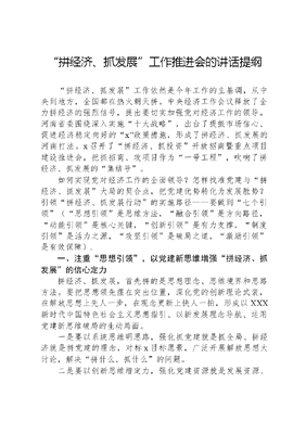 拼经济、抓发展工作推进会的讲话提纲拼经济、抓发展工作依然是今年工作的主基调,从中央到地方,全国都在热火朝天拼。中央经济工作会议释放了全力拼经济的强烈信号,提出要切实加强党对经济工作的领导。河南省委围绕深入实施十大战略,出台了提振市场信心、促进经济稳定向好的x政策措施,形成了拼经济、抓发展的河南打法。x召开了拼经济、抓投资开放招商暨重点项目建设推进会,把抓招商、攻项目作为一号工程,吹响了拼经济、抓发展的集结号。如何实现党对经济工作的全面领导?怎样找准党建与拼经济、抓发展大局的契合点,把党建优势转化为发展胜势?引领拼经济、抓发展行动的实施路径——要做到七个引领(思想引领是思维方法,融合引领是方向路径,动能引领是核心关键,创新引领是有力支撑,制度引领是活力之源,攻坚引领是破局之道,激励引领是有效保障).一、注重思想引领,以党建新思维增强拼经济、抓发展的信心定力拼经济、抓发展,首先拼的是思想理念、思维境界和思路方法。要把思想领先摆在突出位置,深化党的创新理论武装,在解放思想上先人一步,在观念更新上快人一拍,形成以XXX新时代中国特色社会主义思想指引、以新发展理念导航、运用党建新思维破局的生动局面。一是要以系统思维明思路,强化抓党建就是抓全局、拼经济就是拼党建的理念,对标x目标愿景,广泛开展解放思想大讨论,解决拼什么、抓什么的问题。二是要以创新思维增定力,强化党建资源就是发展资源、党建优势就是发展优势的理念,推动党建工作向拼经济、抓发展各领域全链条延伸,解决如何拼、如何抓的问题。三是要以问题思维开新局,强化抓好党建是最大政绩、不抓党建是失职渎职的理念,发挥党建统领力、要素聚合力解决拼经济、抓发展中的堵点痛点难点问题,解决拼得硬、抓得硬的问题。二、注重融合引领,以党建新格局明晰拼经济、抓发展的方向路径拼经济、抓发展,拼的是在新发展格局中的历史方位、功能定位和自身站位。要把党建工作融入区域发展大战略大格局,嵌入经济建设全周期全链条,实现党的领导与经济发展、党建体与经济体、党建抓手与经济手段的三个深度融合,形成党建统领一呼百应、各条战线有呼必应的火热局面。一是要融入县域发展主阵地、当好鼓手,发挥县乡党委抓统筹、谋全局作用,厘清发展蓝图、明晰拼经济、抓发展路径;选优配强开发区党政领导班子,以高质量发展综合考评为牵引,引导开发区在体制改革、项目招引等方面大胆探索、率先破局。二是要融入产业发展主引擎、当好助手,锚定一主两优四新多支撑先进制造业体系,深化产业链党建工作,党的组织建在产业链上、各级干部抓在产业链上、优秀人才聚在产业链上,助力产业集群高质量发展。三是要融入项目建设主战场、当好推手,持续完善三领三助党建引领项目攻坚机制,构建市、县、开发区、项目企业四级联抓体系,以项目建设快突破推动经济发展起高峰。三、注重动能引领,以党建新突破锻造拼经济、抓发展的硬核力量拼经济、抓发展,拼的是干部的能力之基、精神之标、作风之效。要把锻造善拼会抓的专业化干部队伍作为重中之重,以干部工作突破带动干部能力重塑,引导干部在产业发展、项文可居文库——海量学习资料,手机电脑均可下载www.wenkeju.com目建设、企业服务等领域大显身手。一是要提升敢拼善抓的本领,瞄准短板训、对标先进学、扑身一线炼,实施菁英博才赋能、战略帅才领航等五大行动,抓好优秀年轻干部双百体悟实训计划,引导干部练就就大海游泳的高超本领。二是要涵养敢拼善抓的志气,持续细化三我干部队伍建设举措,引导干部弘扬遇事不怕事、有事能扛事的担当精神,该干的事顶着压力也要干,该担的责迎着风险也要担,推动各项工作提质增效、争先进位。三是要锤炼敢拼善抓的作风,强化既要抓大事、又要把大事抓具体的工作理念,抓好每一个项目、专注每一项工作、重视每一次会议、落实每一次交办、信守每一次承诺,以扫地过界的姿态推动各项工作落实。四、注重创新引领,以党建新提升强化拼经济、抓发展的人才支撑拼经济、抓发展,拼的是人才队伍总量、人才创新增量和人才生态变量。要实行更加积极、更加开放、更加有效的人才政策,发挥人才引领驱动作用,为拼经济、抓发展提供强有力的人才支撑和智力支持。一是要塑造人才引领发展新动能,持续推进在外优秀人才归根工程,推动四个回归、放大品牌效应。要推进1+10求才寻才大行动,加快建设规模宏大、结构合理、素质优良的人才队伍,拓展以才引才以才招商新模式。二是要搭建人才创新共赢新平台,积极推动校地、校企深度融合,探索科研飞地异地孵化新路径,全力支持各层次各领域人才带项目、带技术、带团队来平顶山创新创业。三