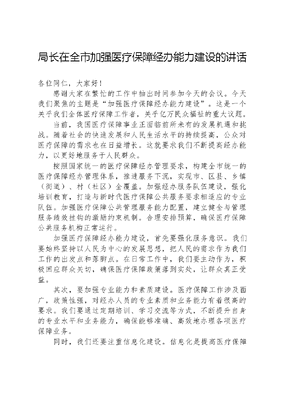 局长在全市加强医疗保障经办能力建设的讲话各位同仁,大家好!感谢大家在繁忙的工作中抽出时间参加今天的会议。今天我们聚焦的主题是加强医疗保障经办能力建设。这是一个关乎我们全体医疗保障工作者,关乎亿万民众福祉的重大议题。当前,我国医疗保障事业正面临前所未有的发展机遇和挑战。随着社会的快速发展和人民生活水平的持续提高,公众对医疗保障的需求也在日益增长。这就要求我们不断提高经办能力,以更好地服务于人民群众。按照国家统一的医疗保障经办管理要求,构建全市统一的医疗保障经办管理体系,推进服务下沉,实现市、区县、乡镇(街道)、村(社区)全覆盖。加强经办服务队伍建设,强化培训教育,打造与新时代医疗保障公共服务要求相适应的专业队伍。加强医疗保障公共管理服务能力配置,建立健全与管理服务绩效挂钩的激励约束机制。合理安排预算,确保医疗保障公共服务机构正常运行。加强医疗保障经办能力建设,首先要强化服务意识。我们要始终坚持以人民为中心的发展思想,把人民的需求作为我们工作的出发点和落脚点。在日常工作中,我们要主动作为,积极回应群众关切,确保医疗保障政策落到实处,让群众真正受益。其次,要加强专业能力和素质建设。医疗保障工作涉及面广,政策性强,对经办人员的专业素质和业务能力有着很高的要求。我们要通过定期培训、学习交流等方式,不断提升自身的专业水平和业务能力,确保能够准确、高效地办理各项医疗保障业务。同时,我们还要注重信息化建设。信息化是提高医疗保障经办效率的重要手段。我们要加强医疗保障信息系统的建设和管理,推动信息共享和业务协同,实现医疗保障业务的网上办理和智能化服务,为群众提供更加便捷、高效的服务。此外,我们还要加强风险防控和内部管理。医疗保障工作涉及大量资金和信息,我们要建立健全风险防控机制,加强内部管理和监督,确保医疗保障资金的安全和有效使用。这是一次覆盖全县医保系统、全业务链条的会议,为持续提升医保工作效能、推动全县医保工作再上新台阶奠定了坚实的思想和能力基础。这次的培训也让我们更加了解医保基金是人民群众的看病钱救命钱,涉及广大群众的切身利益,关系医疗保障制度的健康持续发展。以规范化服务为基础,打造阳光公平的医保政务服务。按照一窗式受理、一链式办理、一站式办结的要求,统一规范综合窗口,统一标准问答口径,统一业务办理清单。常态化开展医保大讲堂业务培训,借助推广医保电子凭证、专项督查行风建设、宣传城乡居民缴费政策契机,开展基层综合窗口代办人员培训,全年培训83场次,有力提高基层窗口人员服务能力。要锤炼硬功夫,不断为医保惠民暖心服务品牌增色添彩。要切实加强作风建设,坚持以XXX新时代中国特色社会主义思想为指导,扎实推进全面从严治党,培养锤炼具有执行、统筹、规划和组织能力的复合型干部队伍。要全面提升服务水平,深入实施经办服务标准化建设,持续开展练兵比武活动,强化人才队伍储备,在提升服务能力和服务水平上下更大功夫,努力在推动医保高质量发展中展现更大作为。同志们,加强医疗保障经办能力建设是一项长期而艰巨的任务。我们要以高度的责任感和使命感,切实把这项工作抓紧抓好。我相信,在大家的共同努力下,我们一定能够不断提升医疗保障经办能力,为人民群众提供更加优质、高效的医疗保障服务。最后,我要强调的是,加强医疗保障经办能力建设不仅是我们医疗保障部门的责任,也是全社会的共同责任。我们要积文可居文库——海量学习资料,手机电脑均可下载www.wenkeju.com极与相关部门和社会各界加强沟通协作,形成合力,共同推动医疗保障事业的健康发展。全市医保经办系统要切实增强责任感使命感,牢牢锚定医保经办服务工作定位,胸怀国之大者,牢记初心使命,在提升服务能力和服务水平上下更大功夫,进一步凝聚贯彻落实的合力,努力在推动医保高质量发展中展现更大作为,为建设海丝名城、智造强市、品质泉州作出新的更大贡献,以优异的成绩向新中国成立75周年献礼。让我们携手并进,共同为构建更加完善、更加高效的医疗保障体系而努力奋斗!谢谢大家。文可居文库——海量学习资料,手机电脑均可下载www.wenkeju.com