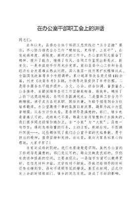 在办公室干部职工会上的讲话同志们:去年以来,县委办全体干部职工忠实践行五个坚持要求,齐心协力推进全办工作精细化、更科学、上水平,在完成高难度、高强度、高频次的工作中,办公室的同志振奋了精神、提升了能力、锤炼了作风,各项工作呈现出新亮点、新变化。一是参谋助手作用充分发挥。紧扣县委中心工作和全县经济社会发展难点热点问题,深入基层一线开展扩权强镇试点、全面深化改革等多个专题调研,累计起草修改各类文稿110余篇,刊发《决策参考》3期,为领导决策提供了参考依据。二是综合服务水平稳步提升。办文、办会、综合协调、督查督办、公务接待、后勤保障等各项工作坚持高标准、高效率,确保了上传下达渠道畅通、各项任务圆满完成。三是整体工作合力不断增强。班子成员各司其职、团结共事,年轻干部得到全方位培养锻炼,办公室激情干事的氛围日渐浓厚,凝聚力战斗力显著增强。从各方评价来看,县委领导是满意的,部门、镇乡也是普遍认可的。成绩来之不易,都是大家用智慧和汗水换来的。我们很多同志经常加班加点,舍小家为大家,没有一句怨言;遇到急难险重的任务,主动上前,积极应对,不图额外回报……。这些都体现了我们办公室干部的无私奉献、勇于担当的精神,值得坚持和发扬。在这里,我向大家表示衷心的感谢,大家辛苦了!在肯定成绩的同时,我们也要清楚意识到,虽然办公室的工作领导是满意的,部门是认可的,群众反映是良好的,但仍有改进和提高的空间,主要表现在:一是细节方面可以做得更好。在信息材料方面,文字校对不细致,导致送给领导的材料还存在错别字、语句不通顺等低级错误,甚至在挂网、正式印发上会的时候被部门、镇乡的同志发现,造成了不好的影响。在办文办会方面,有时候未严格按照《县级机关会议活动管理办法》执行,一些部门承办的会议会务工作未按要求由承办单位自行办理;在具体会议召开的时候,由于会前没有及时清点统计领导抵达情况,导致领导座牌变动,给领导参会造成了不便。虽然我们也建立了错误台帐,但有的错误还是重复出现,说明在细节上还要狠下力气、准确把握。二是工作站位可以更高。由于日常事务挤占深度开发信息、调研文稿时间,有的同志眼界不宽,思维不活跃,创新能力不强,写出来的材料缺乏精品,形成的调研成果分量不重、转化为决策的不多。有的同志仅仅满足为县委服好务、完成县委领导交办的工作任务,主动上门到部门、镇乡开展业务培训时间少,致使各部门办公室业务水平参差不齐,偶有部门主体责任缺失,形成长期的依赖应付现象,但到头来还是让我们自身工作处于被动。三是主动意识可以更强。各科室之间交流少,缺乏主动学习的意识,造成只对自己的工作熟悉,对办公室其他业务的流程和要求不了解,甚至连一些基本知识也不清楚。对外来讲,由于大家平时都忙于自身工作,到其他兄弟县市区学习交流的机会就很少,很多工作满足于现状,失去了之前的优势,从领先者变成了落后者。四是机关活力可以更强。办公室工作要求高、辛苦、责任重大,受大的政策环境影响,提拔重用干部较慢,三十岁左右中干多,个别同志在办公室工作的时间长,在事业上求稳多、求进少。在组织学习活动上,基本上都是严肃死板的集中学习,形式单一、内容枯燥,各支部单独开展活动就更少,部分同志参加活动不积极,没有朝气和活力。同时,我们也清醒地看到,本办机构编制、人才队伍与调研、文稿、信息等领域日渐增多的业务量不相适应;由于办公室工作特别是文秘战线辛苦、清苦、节奏快、压力大,造成干部选任难,目前大部分科室干部青黄不接,未形成良性的梯次结构,等等。应该讲,县委对办公室工作是高度重视、真切关心的,我和办班子全体同志也在千方百计地解决我们共同关切的问题,文可居文库——海量学习资料,手机电脑均可下载www.wenkeju.com但由于方方面面的原因,很多问题不是一朝一夕形成,也不可能一蹴而就地解决,需要全办上下持之以恒地共同努力。我坚信,只要干出实实在在的业绩,很多问题就会迎刃而解、不攻自破。我希望全体同志与我并肩向前,以激情、实干、担当去争取更大支持、赢得更多理解,共同创造属于我们集体、更属于我们每位同志的美好明天。在这里,我结合自己的工作经历,就如何干好新形势下的办公室工作谈几点体会,与大家共勉:一、懂规矩重团结。没有规矩不成方圆。办公室需要综合协调的事情很多,无论办文办会办事,每一个岗位、每一个环节职责流程都十分明确,一个环节掉链子就引起连锁反应。这就要求我们每一名干部都要站在一盘棋的高度,做到分工不分家,既要干好自己份内的事,又要服从大局,干好领导交办的事,不能看到任务就缩边边,遇到问题就找借口。同时,要加强对上对内对下的沟通,主动与领导、与内部科室、上下级部门联系,特别是在一些重要会议活动、重大事件的处理上,要坚持原则性和灵活性相结合,提前统筹、及时沟通,该报告的要报告,不能