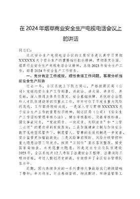 在2024年烟草商业安全生产电视电话会议上的讲话同志们:这次安全生产电视电话会议的主要任务是认真学习贯彻XXXXXX关于安全生产的重要指示批示精神,贯彻落实全国、烟草行业安全生产电视电话会议精神,总结2023年安全生产工作,部署2024年安全生产工作任务。一、充分肯定工作成效,理性查摆工作问题,客观分析当前安全生产形势过去一年,全区系统上下戮力同心,严格按照区局(公司)党组的安全生产工作部署,讲政治、讲大局、讲责任、讲贡献,深入推进主体责任落实、安全基础保障、系统综合治理和人才队伍建设等四项重点工作,牢牢守住了不发生重大风险的底线,工作取得较好成效。一是深入学习贯彻XXXXXX关于安全生产工作的重要指示精神,制订区局(公司)《安全生产工作目标管理考核办法》,健全考核指标、完善考核标准、强化事故问责,党政同责、一岗双责、失职追责和三管三必须的要求得到有效落实;二是加强建章立制与加快安全数字化转型双管齐下,制度管人、管事的长效机制进一步完善,安全监管更加智能高效;三是风险事前预防、风险分级管控和重大隐患治理三项发力,按照五到位要求落实整改。接受国家局抽查,未发现重大隐患;四是突出专业化队伍建设2023年,全区系统共12人考取了注册安全工程师、注册消防工程师资格,考过人数创历史新高,有效提升了全区安全管理队伍水平。近期,国内连续多发的一系列重特大事故给我们持续敲响了警钟;年关将至,行业卷烟营销、物流配送、市场监管等工作点多、线长、面广,安全监管任务艰巨,责任重大,我们更没有任何理由可以松口气、缓一缓。越是在这种关键时期,越不能只重发展、不顾安全,在各项安全生产管理工作中决不能搞形式主义、官僚主义。必须坚持安全第一、预防为主、综合治理的工作方针,始终保持临战状态、常怀畏惧之心、长压安全职责,长鸣警钟之音,常思教训之痛。实实在在地扛起促行业发展、保行业平安的政治责任,以扎扎实实的工作筑牢筑实安全生产防线。二、提高政治站位,统一思想认识,主动服务于XX烟草商业高质量发展大局党中央、国务院高度重视安全生产工作,XXXXXX对安全生产的一系列重要论述中指出,国家安全工作是党治国理政的一项十分重要的工作,也是保障国泰民安一项十分重要的工作;强调发展和安全是一体之两翼、驱动之双轮,统筹发展和安全,推动发展和安全的深度融合,是我们党治国理政的一个重大原则。XXXXXX在参加党的XXX广西代表团讨论时提出的五个更大的重大方略要求中,就包括了在维护国家安全上作出更大贡献的重大方略。2023年以来,XXXXXX多次作出重要指示批示,主持召开中央政治局常务会议专题研究部署。近期还专门针对全国重特大事故多发形势连续作出重要批示,要求全力救治受伤人员,妥善做好遇难人员家属安抚善后等工作。尽快的查明事故原因,依法严肃追究责任。强调当前春节临近,各类安全风险上升,各地区和有关部门要深刻汲取教训,克服麻痹思想和侥幸心理,进一步压实安全生产责任,认真排查隐患,狠抓工作落实,坚决遏制各类安全事故多发连发势头,确保人民群众生命财产安全和社会大局稳定。XXX指出,要坚持统筹发展和安全,坚持发展安全并重,实现高质量发展和高水平安全的良性互动。推动高质量发展和现代化建设,必须要把安全作为前提和先决条件,把发展建立在安全得到有效保障的基础上。这一系列重要文可居文库——海量学习资料,手机电脑均可下载www.wenkeju.com指示批示精神,为我们做好安全生产工作指明了前进方向,提供了根本遵循。我们必须深刻领悟XXXXXX对安全生产工作的重要指示批示精神,吃深吃透国家局安全生产电视电话会议的工作要求,提高政治站位,汲取事故教训,牢固树立安全发展理念。要清醒认识当前安全生产的严峻形势和复杂态势,进一步统一思想、提高认识;要清醒认识到抓好安全生产工作是贯彻落实XXX重要指示批示精神的实践检验,是对各级领导干部坚定拥护两个确立、坚决做到两个维护的实践检验;要清醒认识到抓好安全生产是保障人民生命安全的具体措施。我们要切实把思想和行动统一到XXXXXX重要指示批示精神和党中央、国家局的决策部署上来,将安全发展的理念、责任和措施全面融入各项生产经营和管理工作中,持续强化风险防控,全面梳理和坚决防范各方面、各环节的风险和隐患,牢牢守住不发生重大风险的底线,为行业高质量发展和现代化建设提供有力保障。三、聚焦工作重点,科学统筹谋划,以新安全格局保障新发展格局2024年,XX烟草商业安全生产工作要以XXX新时代中国特色社会主义思想为指导,认真落实党中央、国务院安全生产决策部署和国家局安全生产工作要求,聚焦四个重点,实现四个统筹,从严落实安全生产责任,严查密防安全风险隐患,全力维护行业持续稳定的安全生产形势,努力以高水平安全保障行业高质量发展和现代化建设。(一