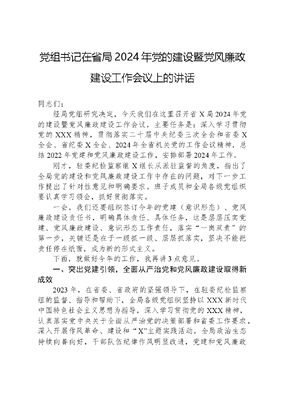 党组书记在省局2024年党的建设暨党风廉政建设工作会议上的讲话同志们:经局党组研究决定,今天我们在这里召开省X局2024年党的建设暨党风廉政建设工作会议,主要任务是:深入学习贯彻党的XXX精神,贯彻落实二十届中央纪委三次全会和省委X全会、省纪委X全会、2024年全省机关党的工作会议精神,总结2022年党建和党风廉政建设工作,安排部署2024年工作。刚才,驻委纪检监察组X组长从派驻监督的角度,指出了全局党的建设和党风廉政建设工作中存在的问题,对下一步工作提出了针对性意见和明确要求。班子成员和全局各级党组织要认真学习领会,抓好贯彻落实。一会,我们还要组织签订今年的党建(意识形态)、党风廉政建设责任书,明确具体责任、具体任务,这是层层压实党建、党风廉政建设、意识形态工作责任,落实一岗双责的第一步,关键还是在于一级抓一级、层层抓落实,坚决不能把责任停在纸面,成为新的形式主义。下面,就做好今年的工作,我再讲3点意见。一、突出党建引领,全面从严治党和党风廉政建设取得新成效2023年,在省委、省政府的坚强领导下,在驻委纪检监察组的监督、指导和帮助下,全局各级党组织坚持以XXX新时代中国特色社会主义思想为指导,深入学习贯彻党的XXX精神,认真落实党中央关于全面从严治党的决策部署和省委工作要求,深入开展作风革命、建设和X主题实践活动,全局政治生态持续向善向好,干部队伍纪律作风明显改进,党建和党风廉政建设工作取得新进展新成效,引领保障中心工作的作用有效发挥。概括起来,主要体现在6个方面:我们以党的政治建设为统领,彰显政治机关鲜明本色。以迎接和学习宣传贯彻党的XXX为主线,按照全面学习、全面把握、全面落实的要求,严格执行第一议题制度,健全完善党组理论学习中心组学习制度,教育引导全局党员干部深刻领悟两个确立的决定性意义,切实把坚决做到两个维护贯穿到X工作各方面全过程,党组班子五个作表率引领带动作用更加突出,全局各级党组织和党员干部党的创新理论武装更深更实,自觉做到XXXXXX有号令、党中央有部署、省委省政府有要求,X系统见行动的意识更加牢固。我们不断严肃党内政治生活,政治生态持续向善向好。高标准召开省委巡视专题民主生活会和年度民主生活会,严肃开展批评和自我批评。党组班子成员带头参加双重组织生活,全覆盖指导督导基层党组织召开组织生活会。严格落实民主集中制,健全完善党组三重一大决策程序。全局政治生态总体向好,风清气正的干事创业环境得到持续涵养和巩固。扎实开展对标先进、争创一流主题实践活动,从政治建设、业务目标、机关党建等方面寻找典型先进,分析自身短板,全面加以改进,主题实践活动成为推动基层党组织全面进步全面过硬的重要抓手。我们深入践行作风建设,党建引领保障作用更加凸显。始终坚持把X安全保供作为第一职责和头等大事,按照疫情要防住、经济要稳住、发展要安全总体要求,大力践行三法三化,深入转作风、提效能、促发展,全力防风险、保安全、稳增长。坚持干中求进、稳中求进,牢固树立抓项目就是抓发展的鲜明导向,深入一线抓开工、抓进度,全面提速重点项目建设。坚持难中求进、变中求进,深刻领会XXXXXX关于X的饭碗必须端在自己手里的重要论述,精准应对复杂多变供需形势,为全省经济稳增长、产业强省建设提供了关键文可居文库——海量学习资料,手机电脑均可下载www.wenkeju.com支撑。我们聚焦突出问题抓实整改,制度机制更加健全完善。坚决抓好省委巡视反馈问题及中央环保督察、审计、纪检监察建议书指出问题等整改工作,强化整改政治责任全链条全闭环落实。坚持当下改和长久立相结合,制定并落实《加强对一把手和领导班子监督若干措施》《关于持续全面从严治党一体推进三不腐方略的实施意见》等X项制度规定,聚焦项目审批、资源配置、安全监管等重点领域,重新确定廉政风险点X项,优化防控措施X项,用制度管权管人管事的工作体系更加系统完备。我们坚持教育与监督相结合,深入推进清廉X建设。做实做细以案促改以案促建以案促治,充分运用X系统违纪违法典型案例,用身边人身边事深化警示教育,全局党员干部对两个永远在路上的领会更加深刻,纪律规矩意识和廉洁自律意识逐步增强。持续深化纠治四风,对X名违反中央八项规定精神的领导干部给予党纪处分。突出政治监督,制定党组5年巡察工作规划,对X个基层党组织开展常规巡察,推动政治监督常态化;加强日常监督,开展X轮次节前纪律作风监督检查,有效提升日常监督实效性;强化专项监督,聚焦巡视整改等重点工作,开展X轮次监督检查,不断提升专项监督精准度。我们坚持正确选人用人导向,干部队伍凝聚力战斗力明显增强。突出政治标准,注重在基层一线和急难险重岗位培养锻炼干部,严把政治关、品行关、作风关、廉洁关,主动接受各
